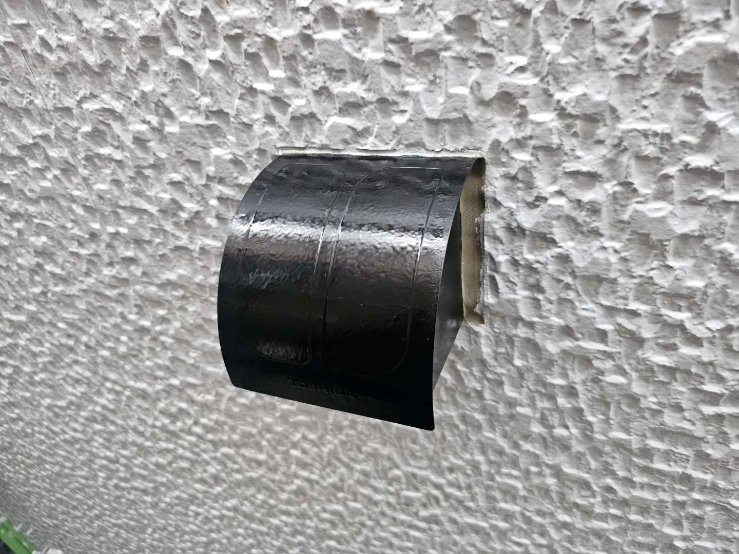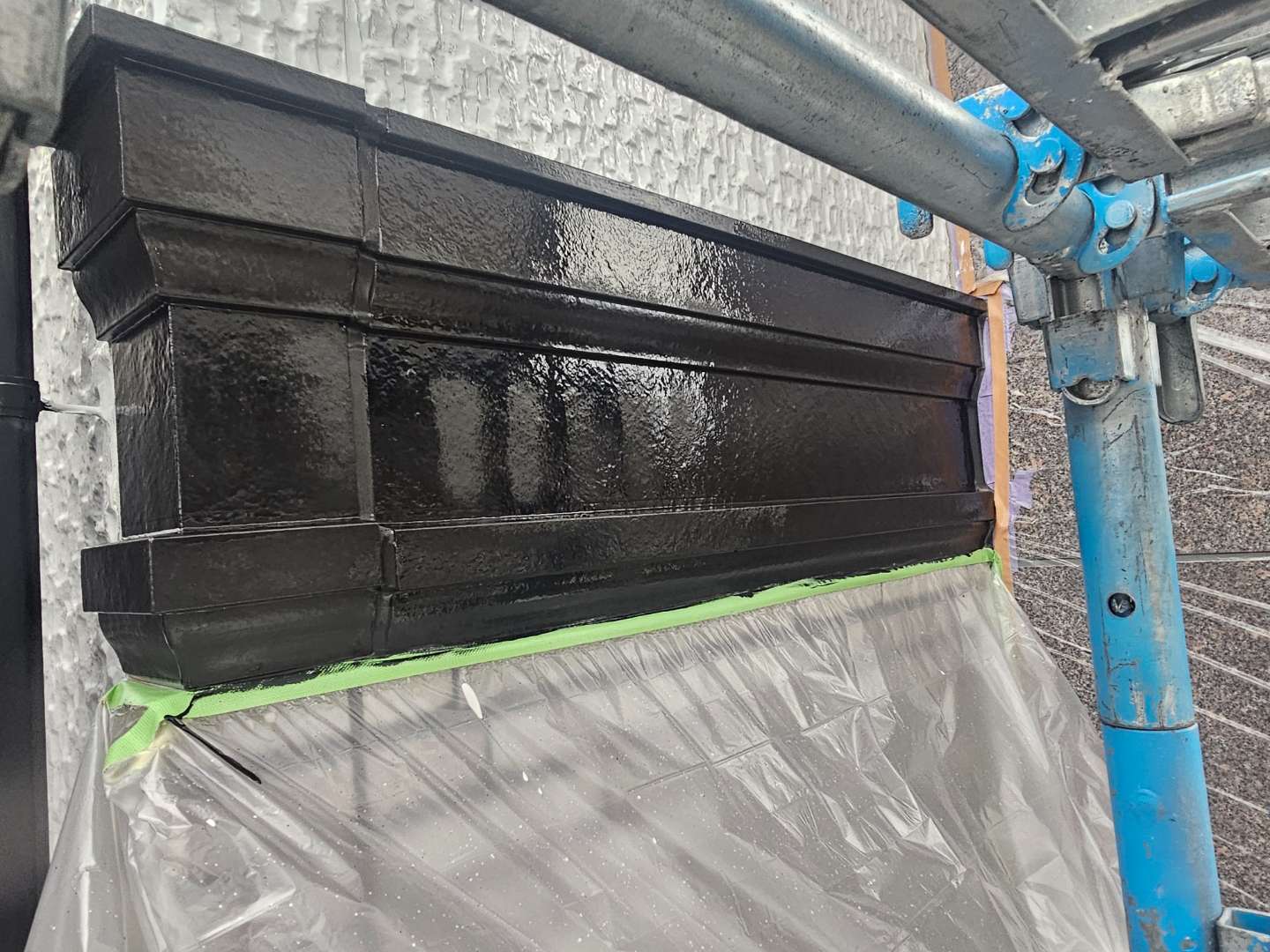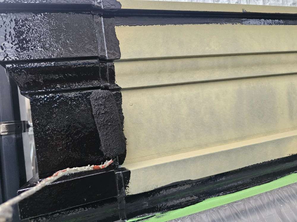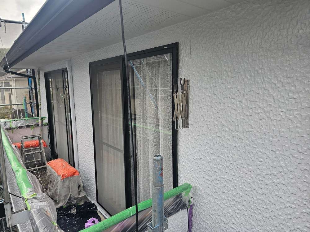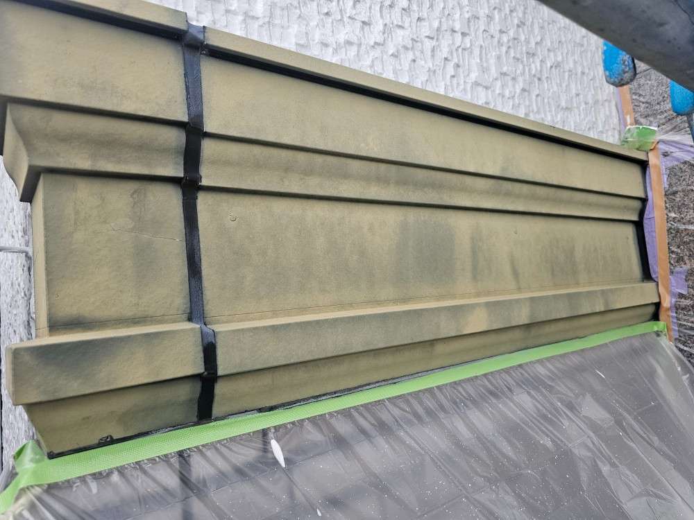 守山区K様邸の昨日の作業は、外壁の上塗り塗装、付帯部(水切り・換気フード・庇)の下塗り作業を行っています。
