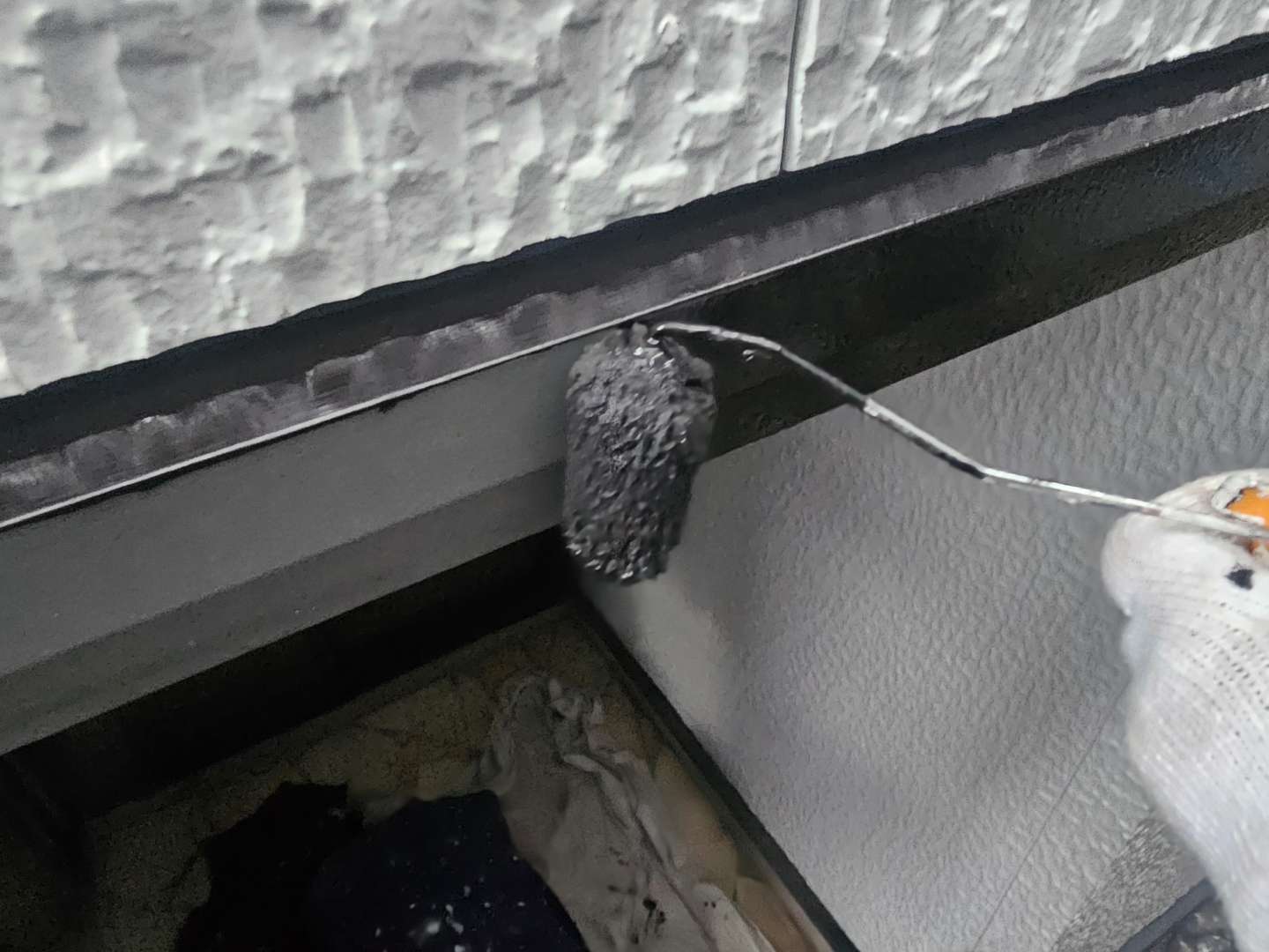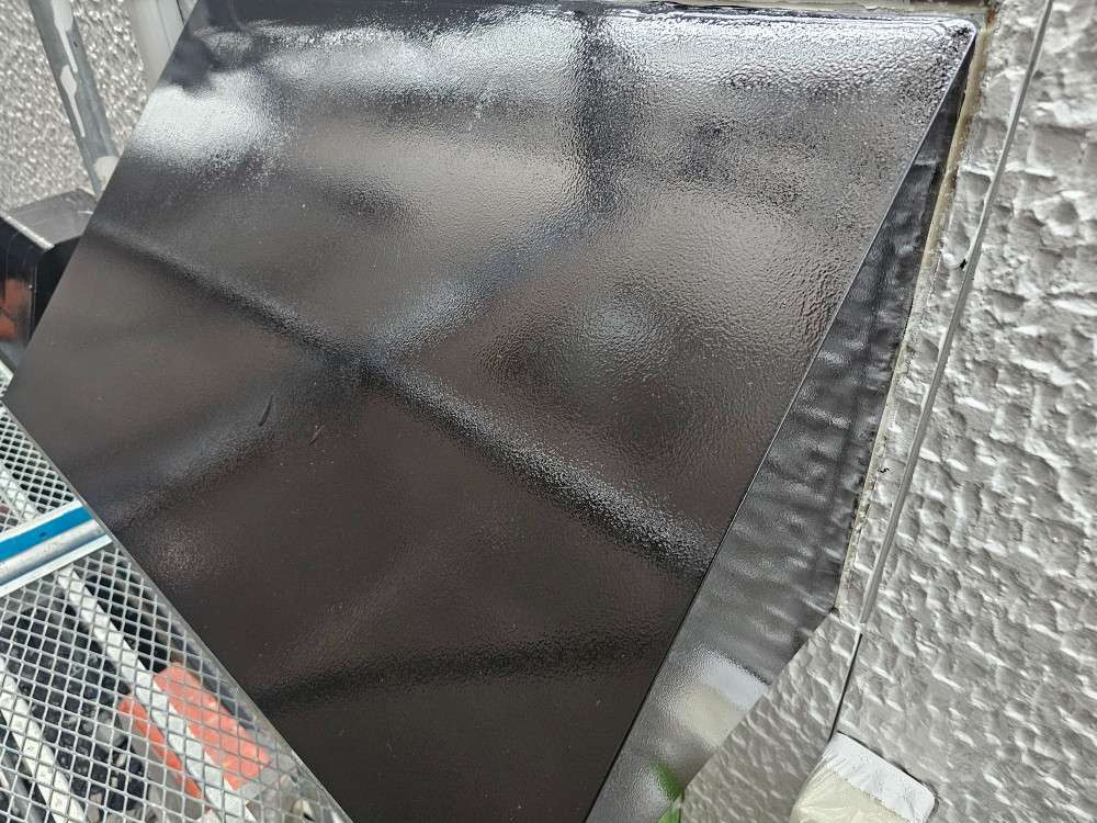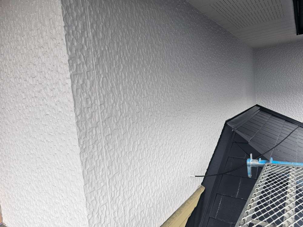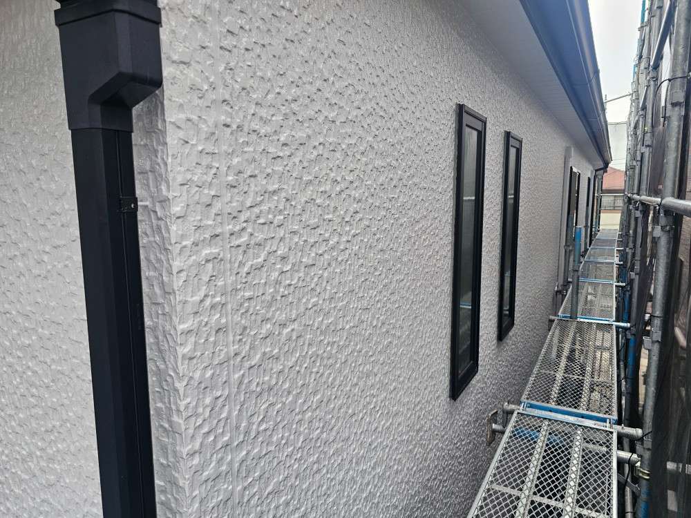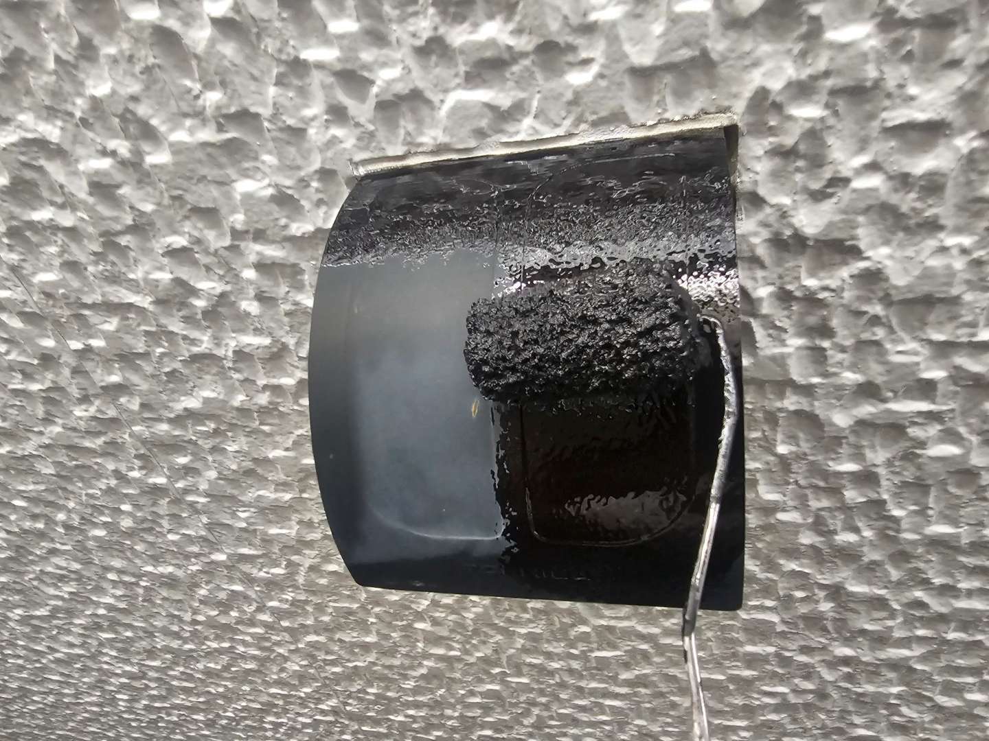 守山区K様邸の昨日の作業は、外壁の上塗り塗装、付帯部(水切り・換気フード・庇)の下塗り作業を行っています。