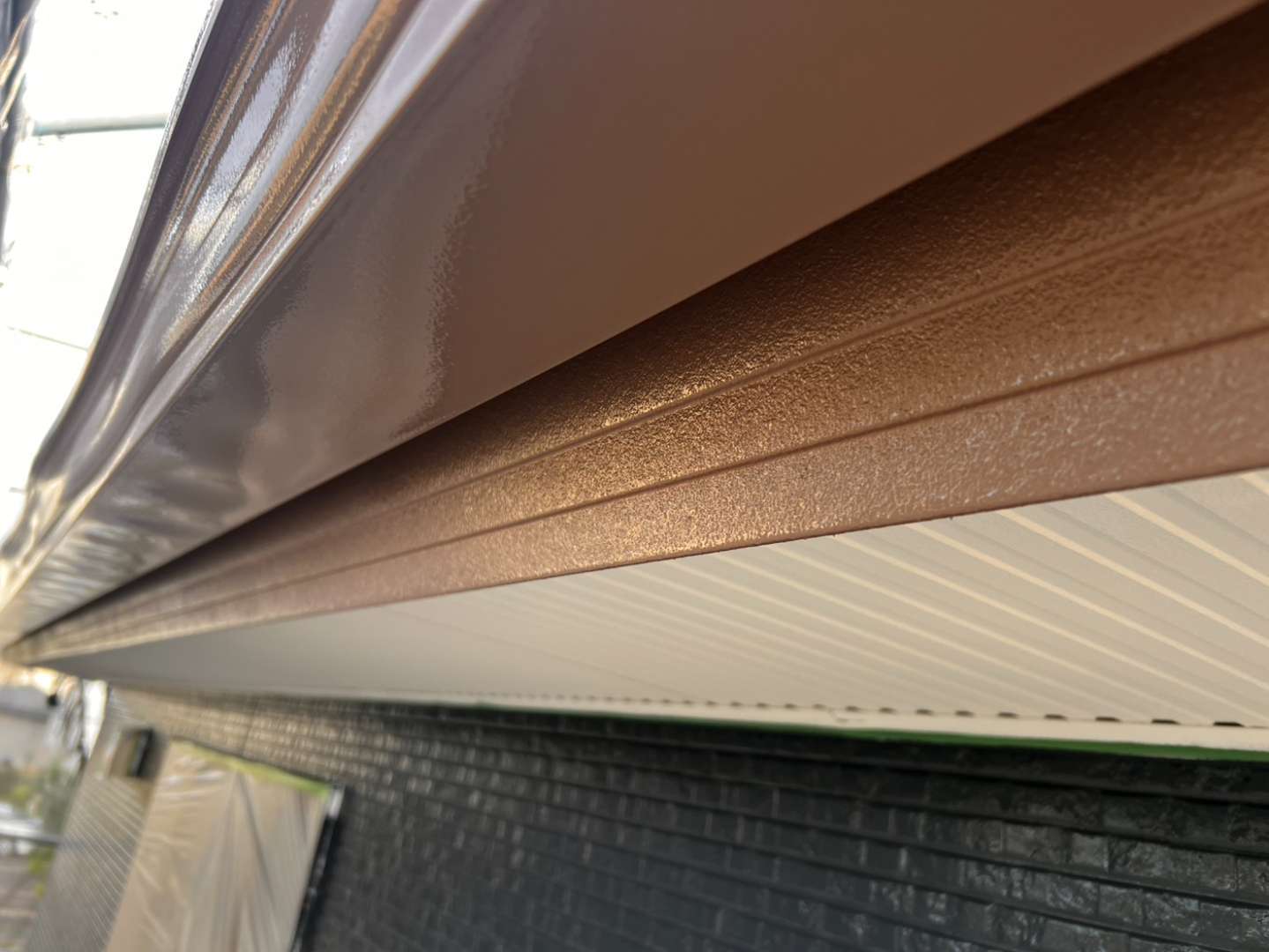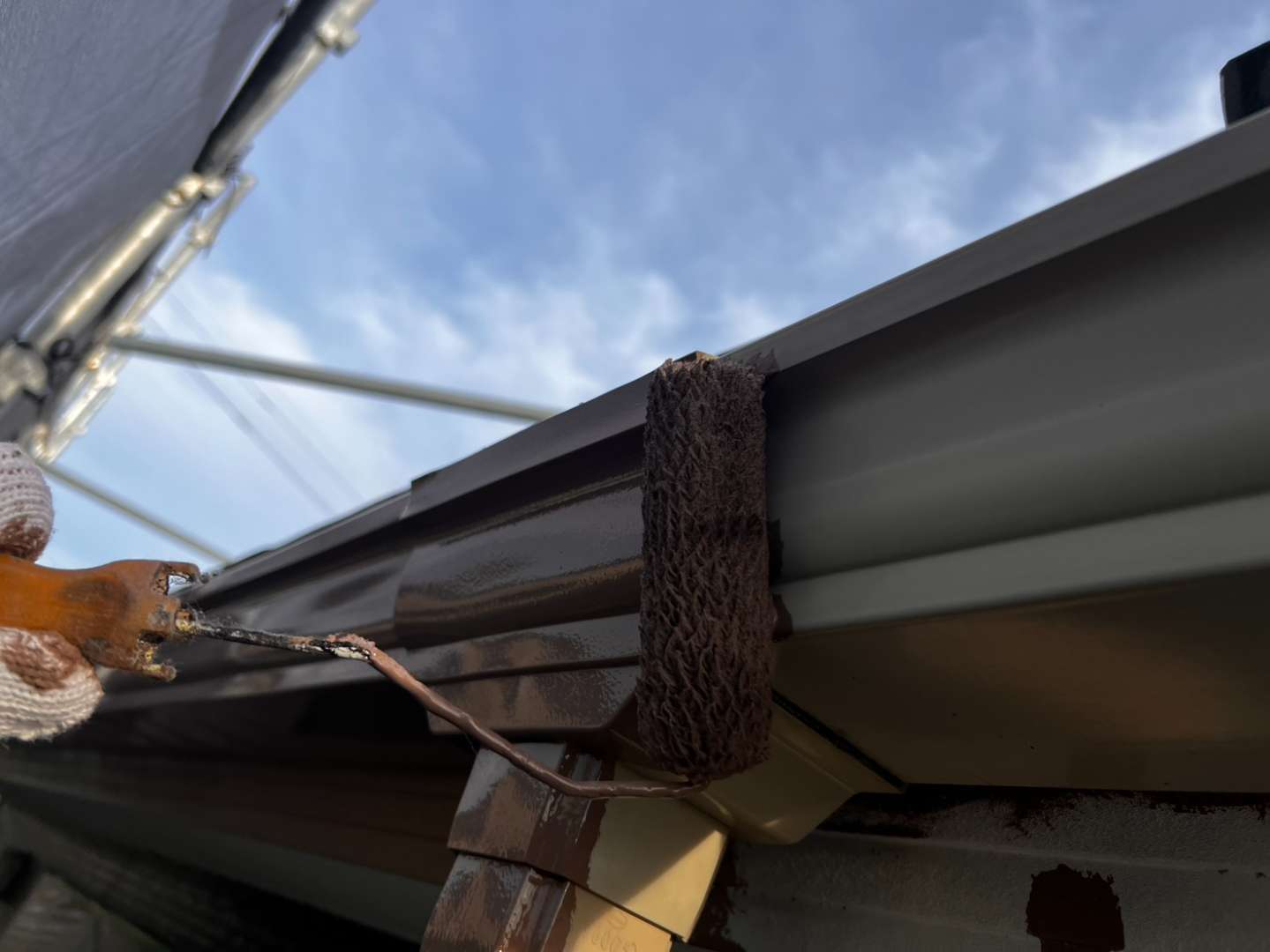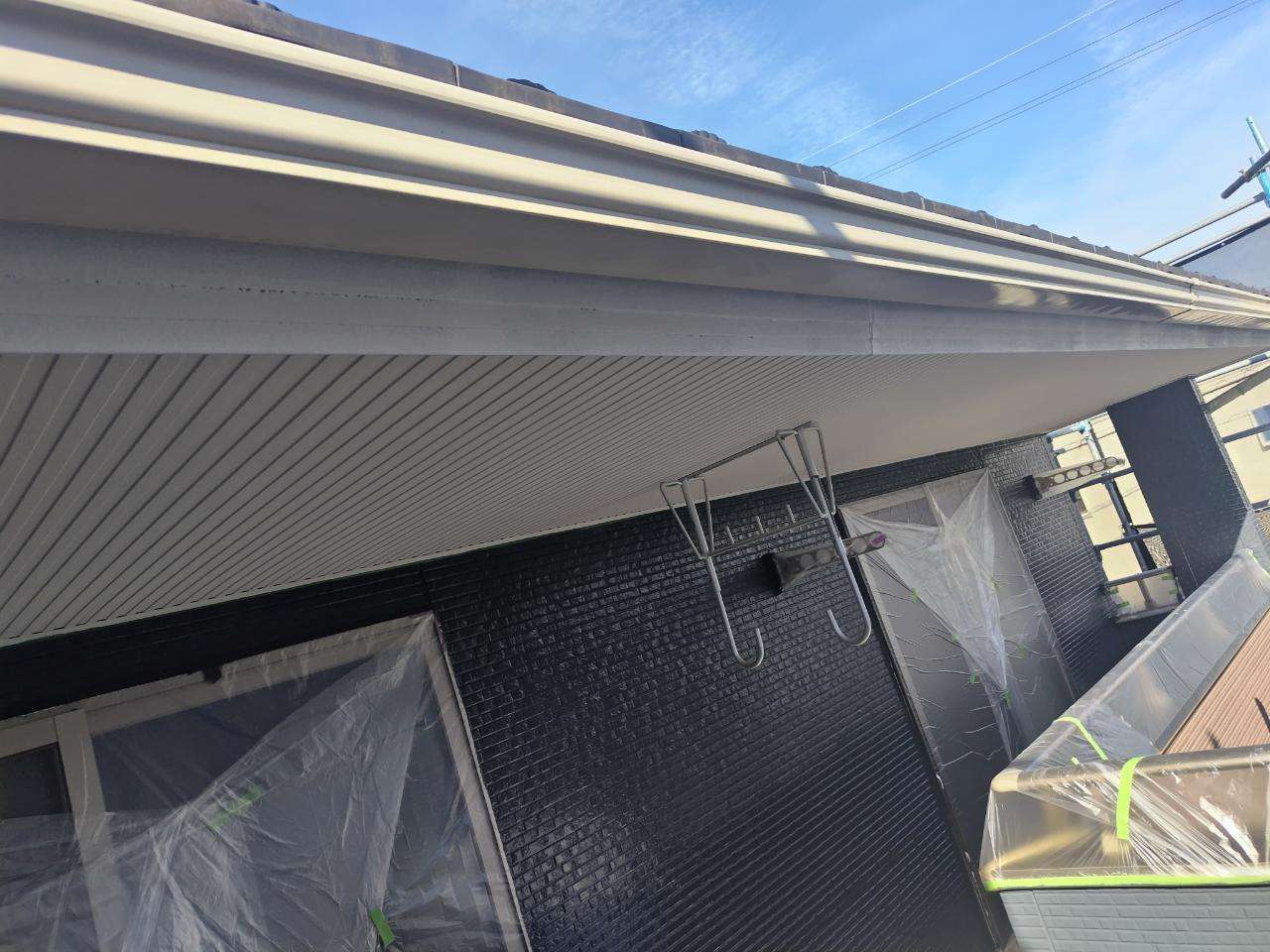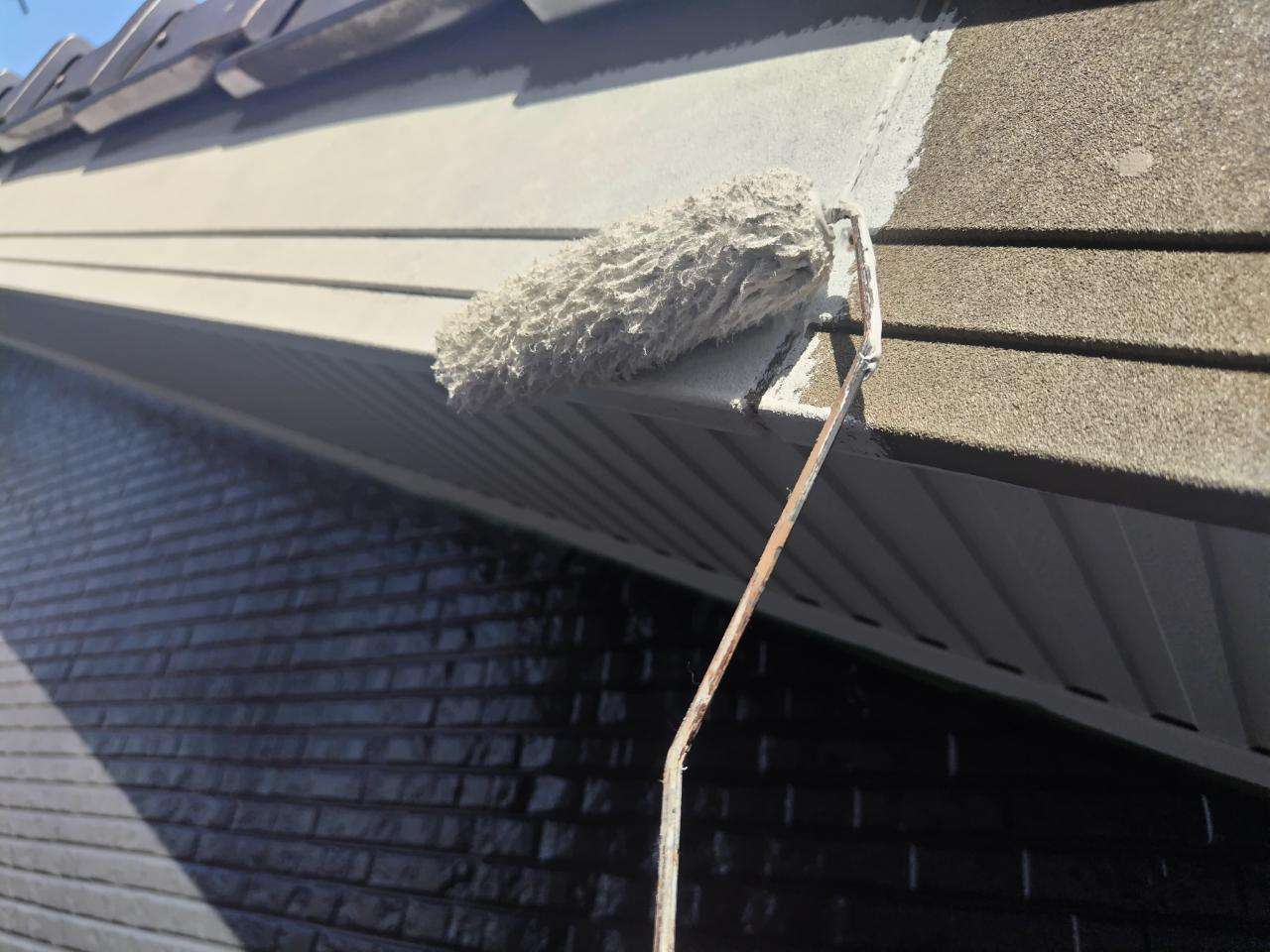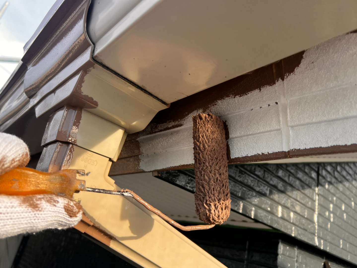 鼻隠し板・軒樋上塗り1回目塗装作業