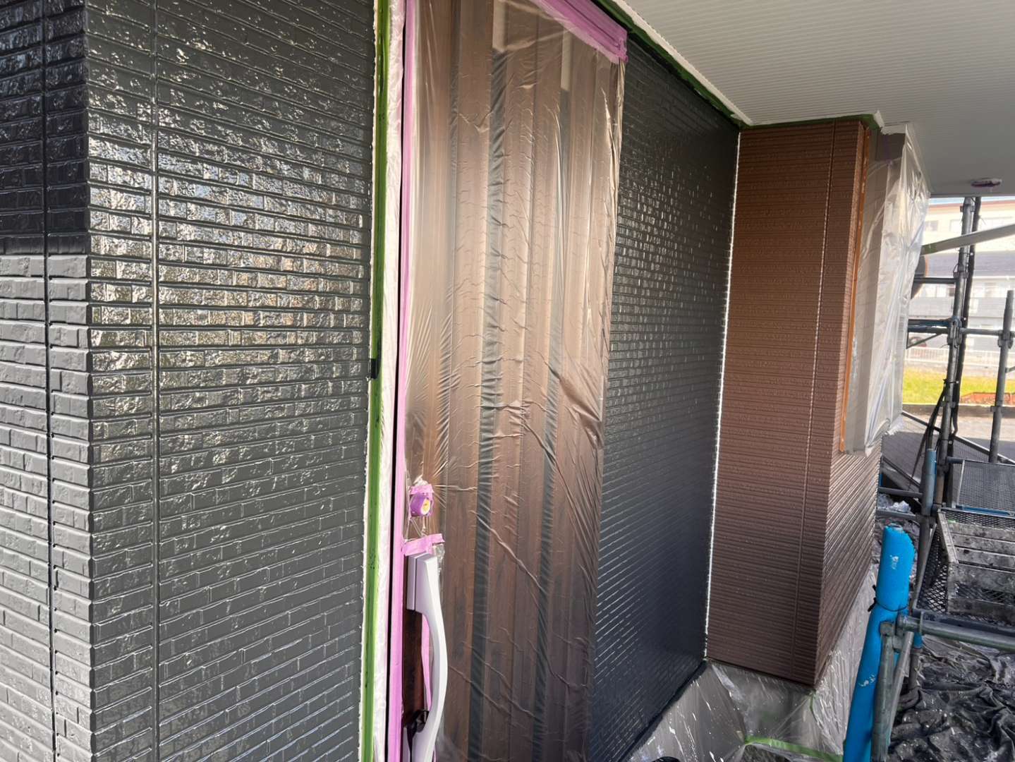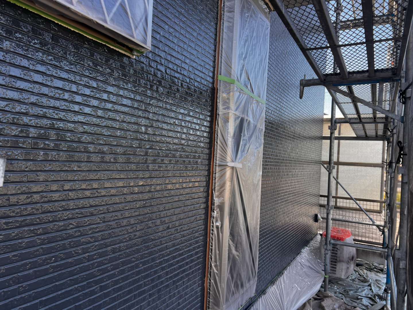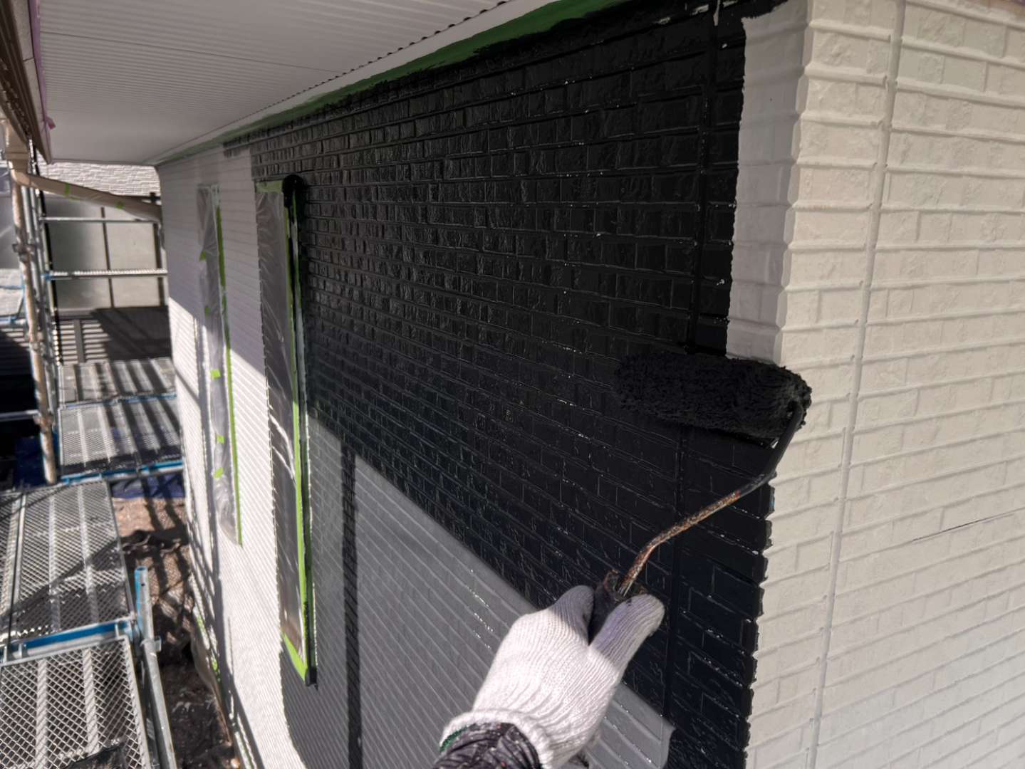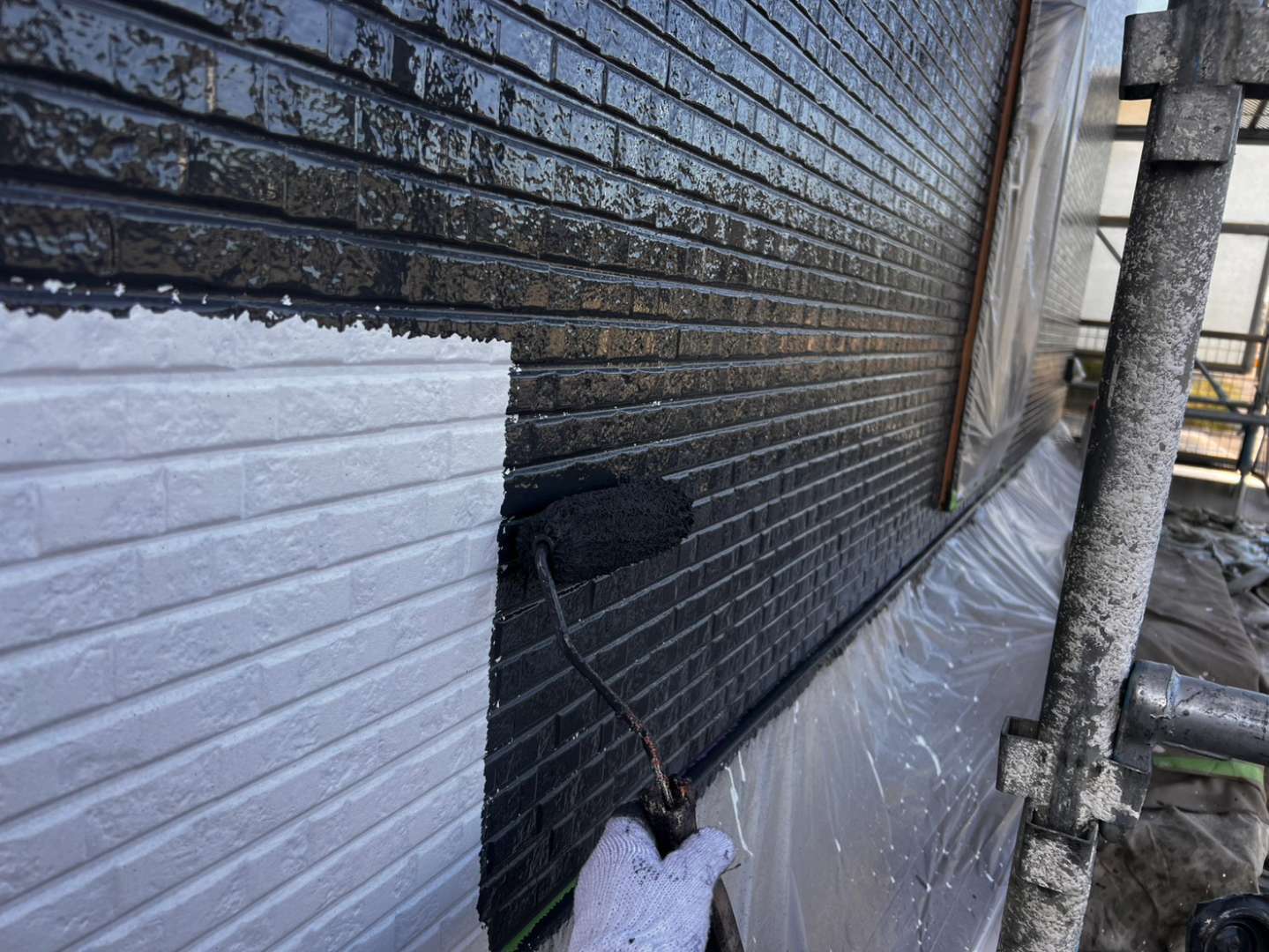 今日の作業は、外壁の上塗り塗装を予定しています。