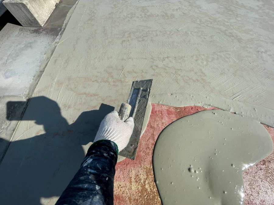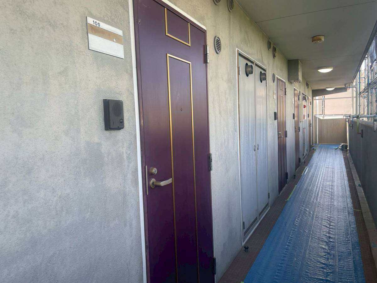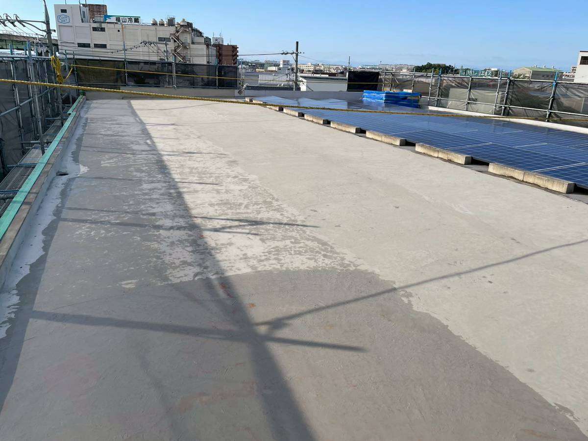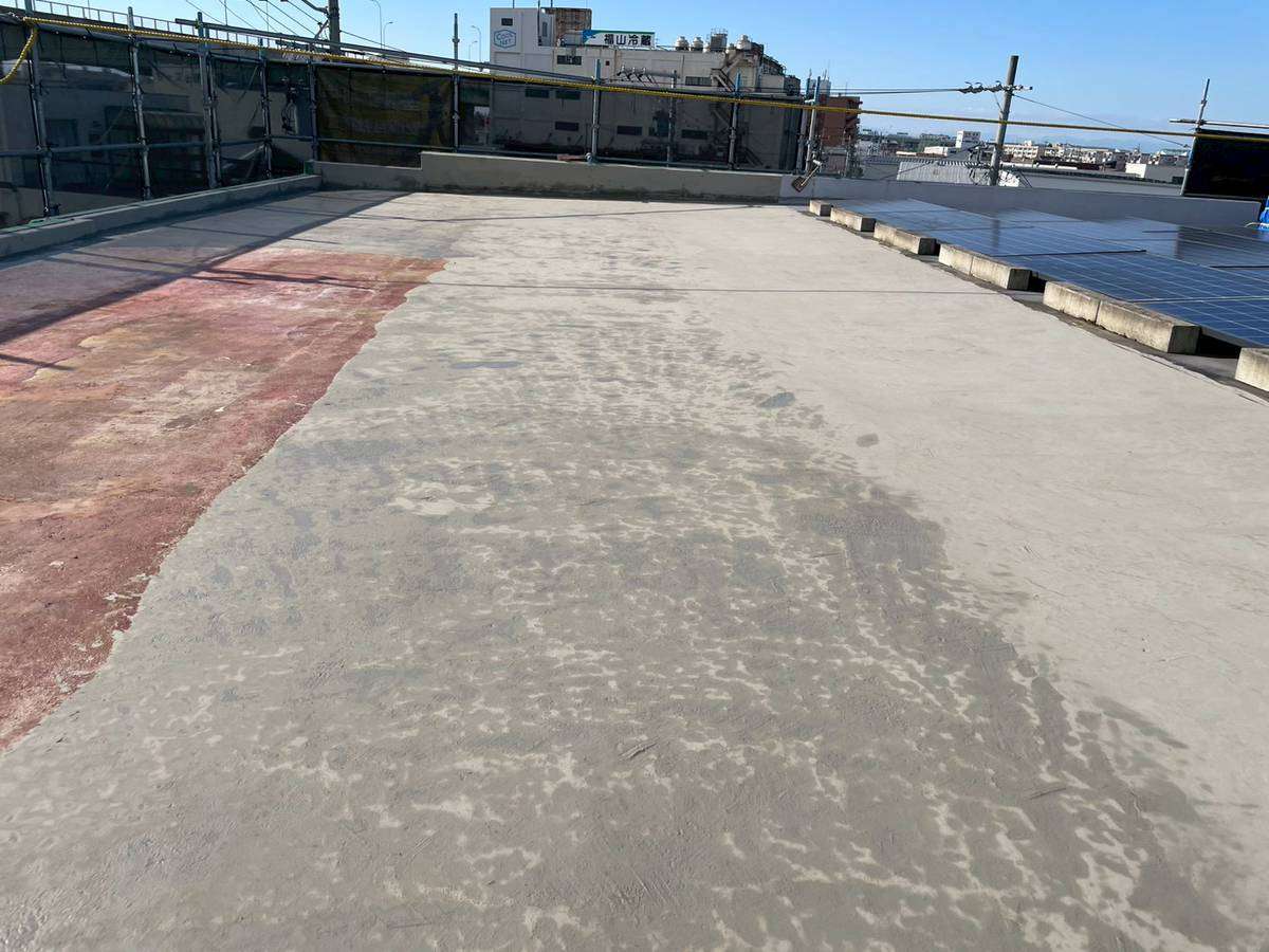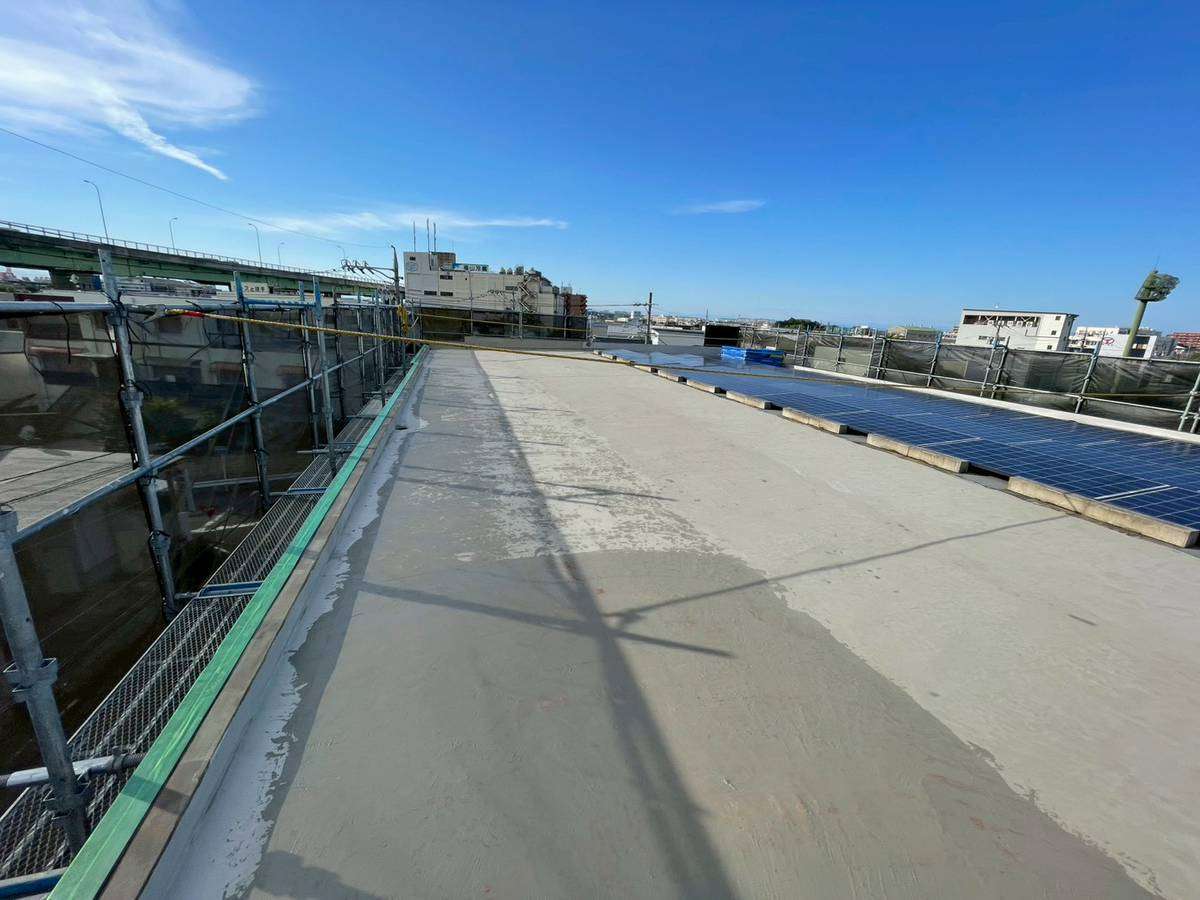 Kマンション様の昨日の作業は、1階通路のコーキング作業・ベランダの養生・屋上の半面(ソーラーパネルを外した部分)の既存シート撤去・下地調整を行っていました。