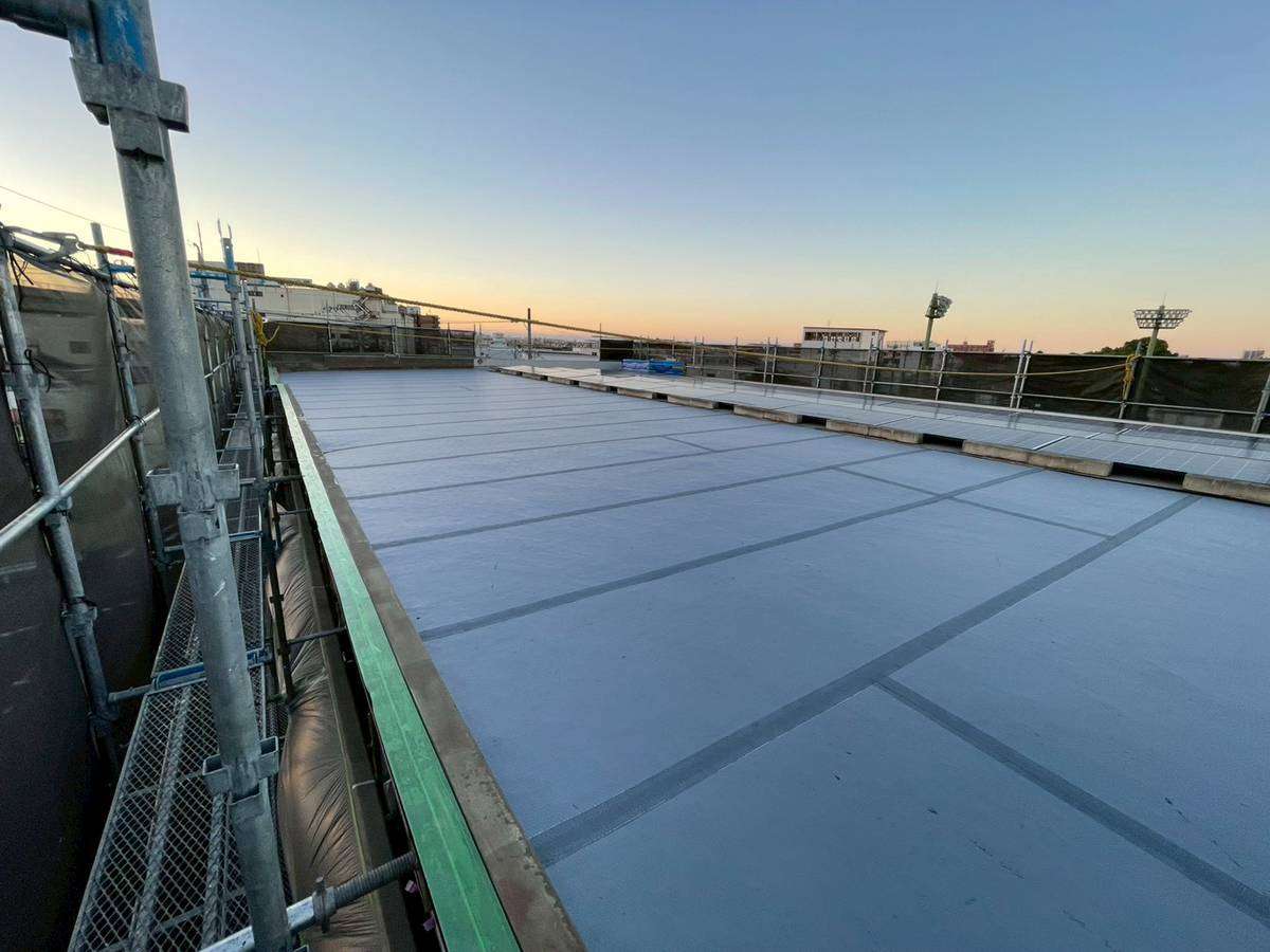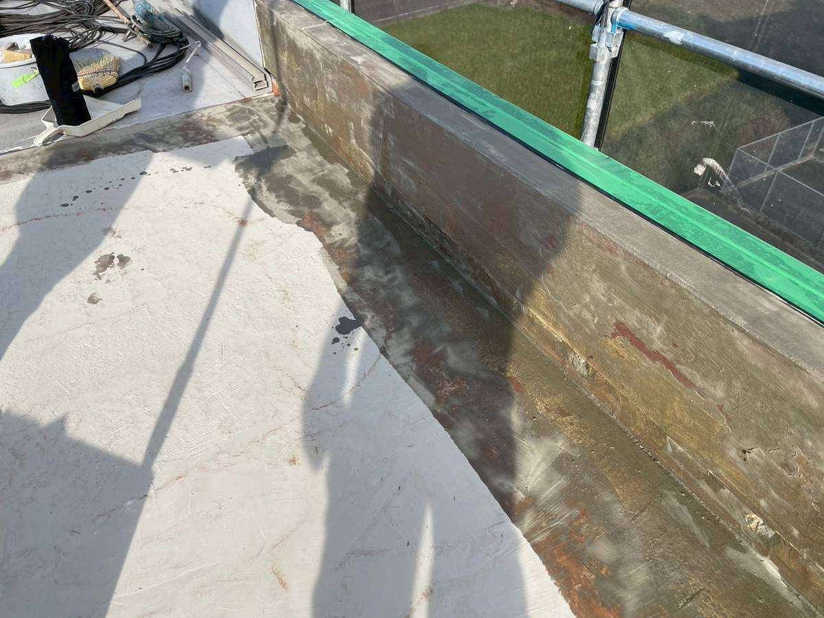Kマンション様の昨日の作業は、ベランダ面の養生作業・屋上通気緩衝防水のプライマー塗装・通気シート張付け・ジョイントテープ貼り作業を行っていました。
