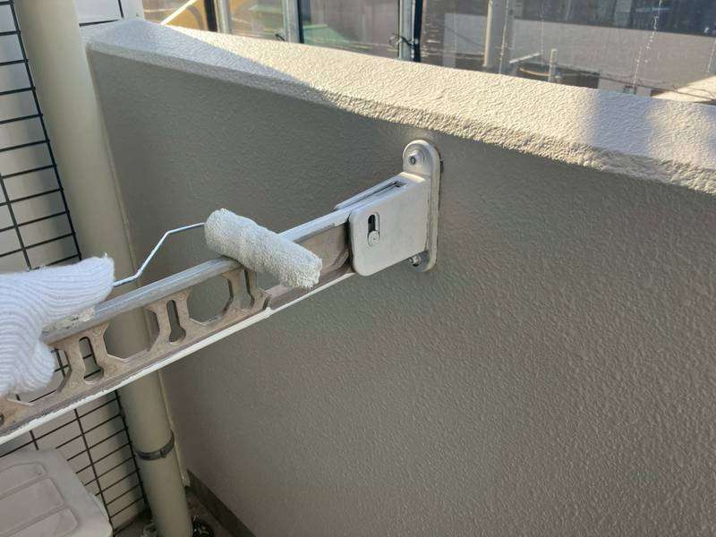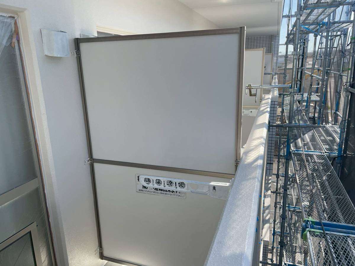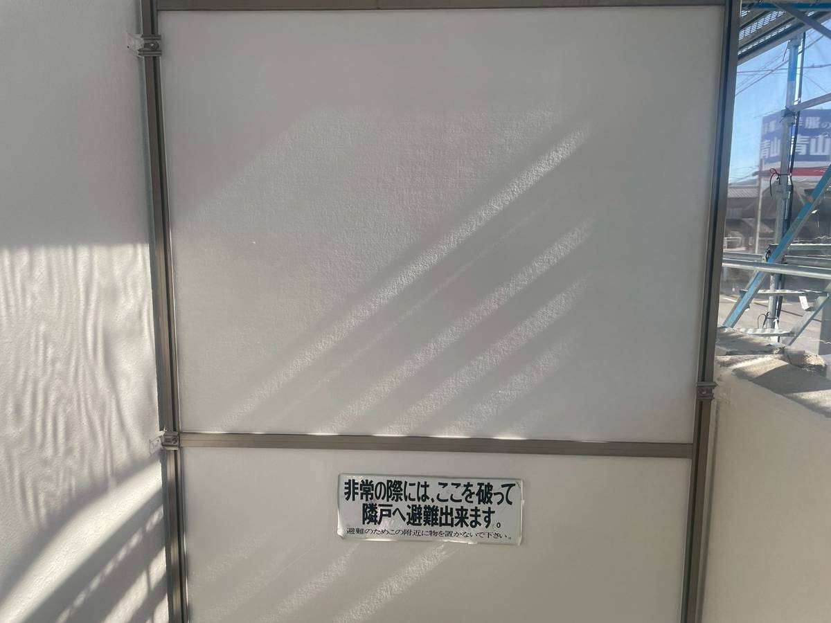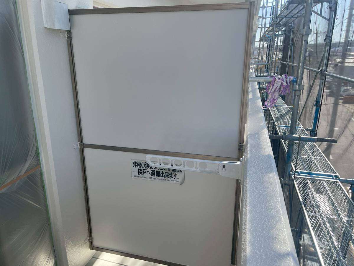 清須市のKマンション様の昨日までの作業内容は、ベランダ面の付帯部(隔て板)下塗り・上塗り1回目・2回目塗装、付帯部(フード・物干し金物・雨樋)の下塗り塗装と上塗り1回目塗装と1階ベランダ下部の上塗り1回目・2回目塗装作業行っています。