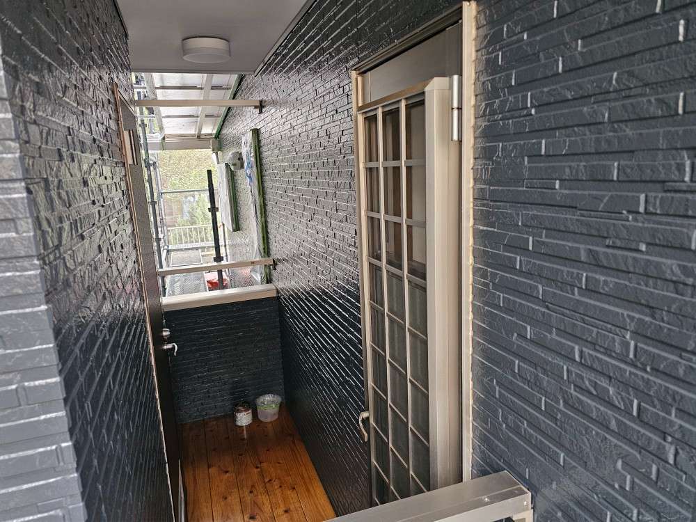 O様邸の昨日の作業は、外壁の中塗り塗装・通路内壁の上塗り塗装作業を行っていました。