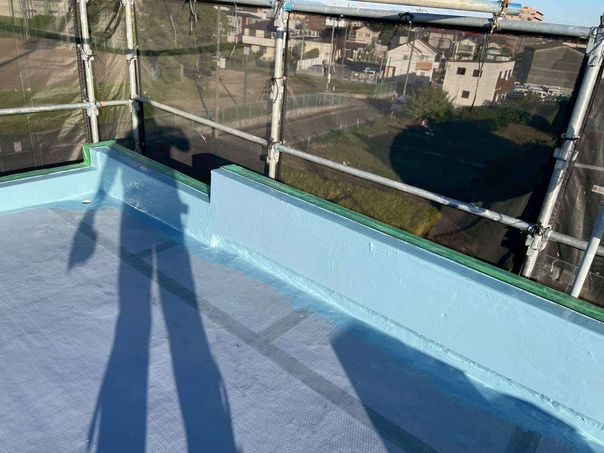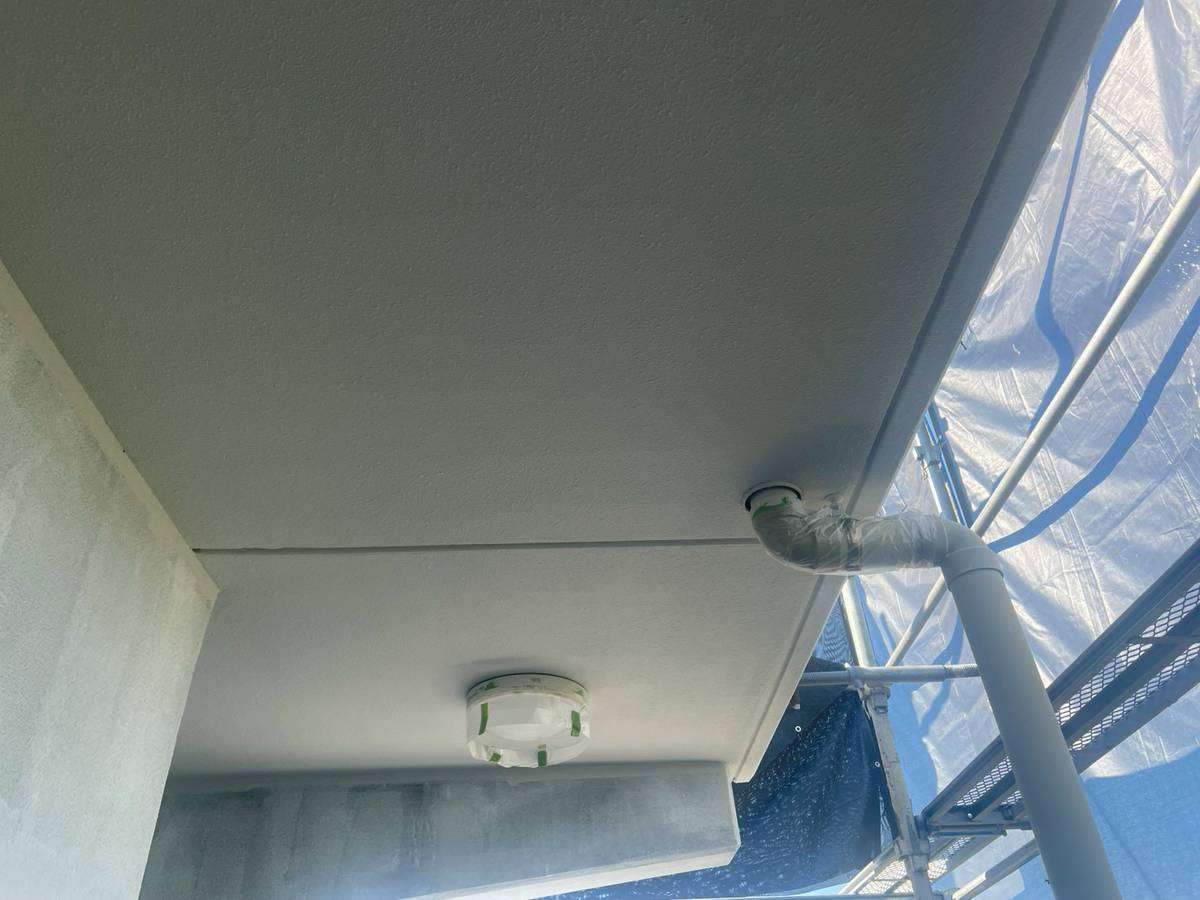 今日の作業は、軒天の上塗り2回目塗装・屋上の防水作業を予定しています。