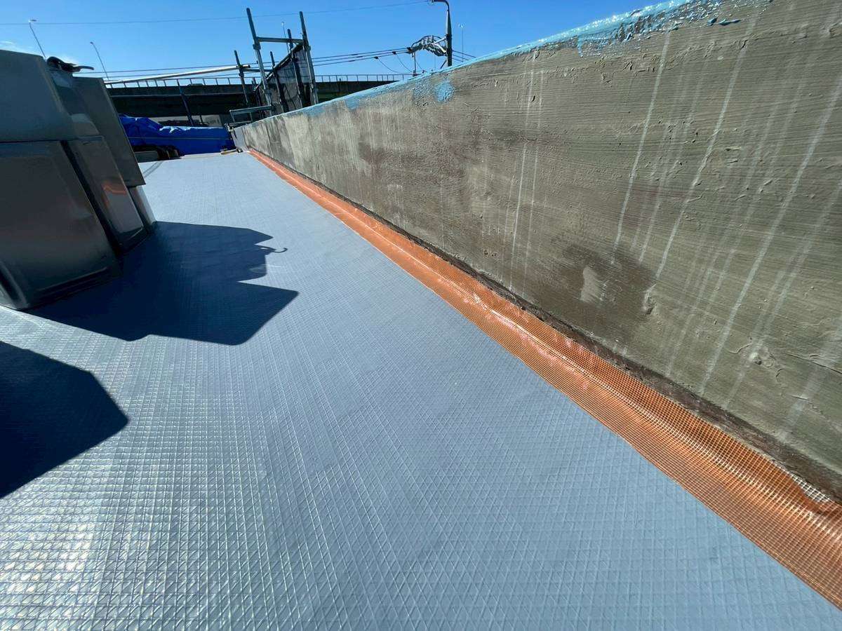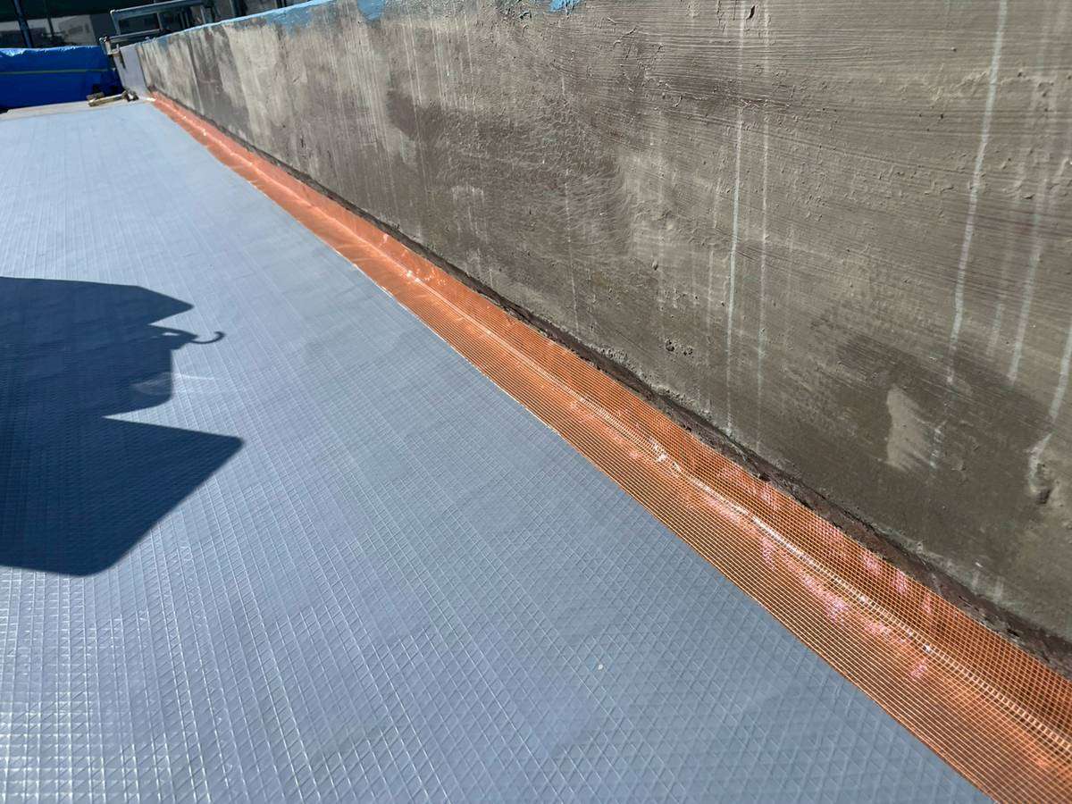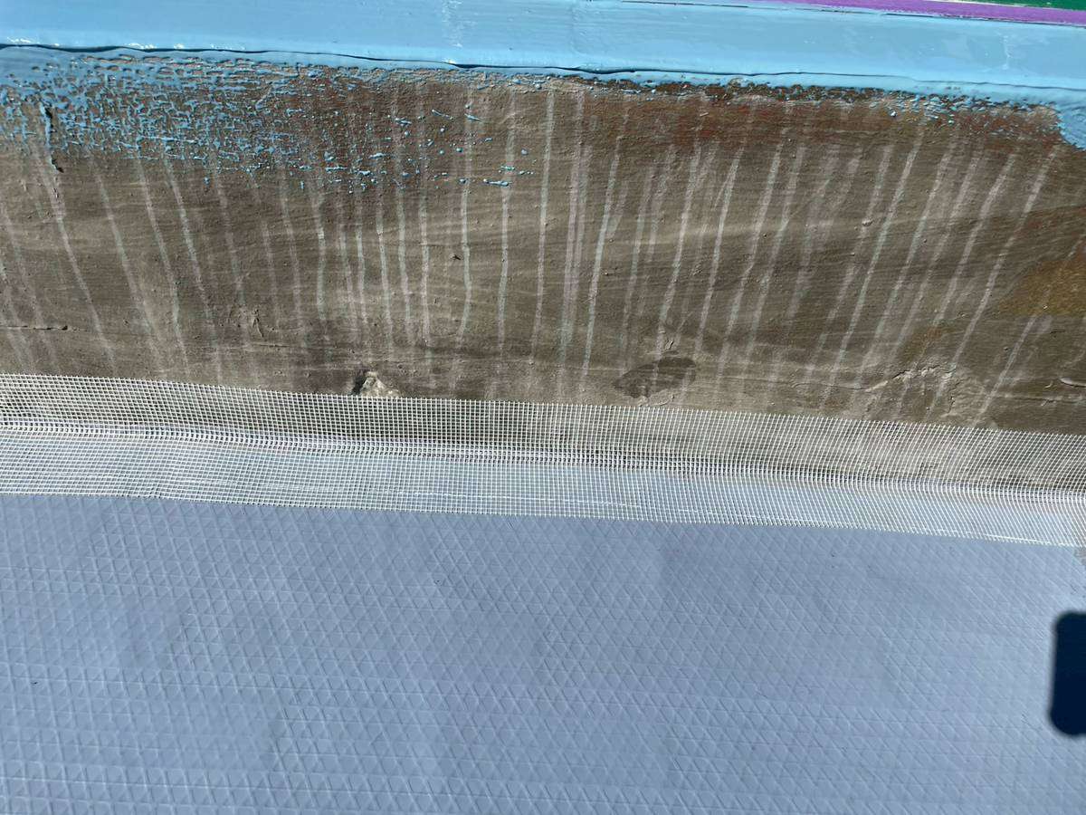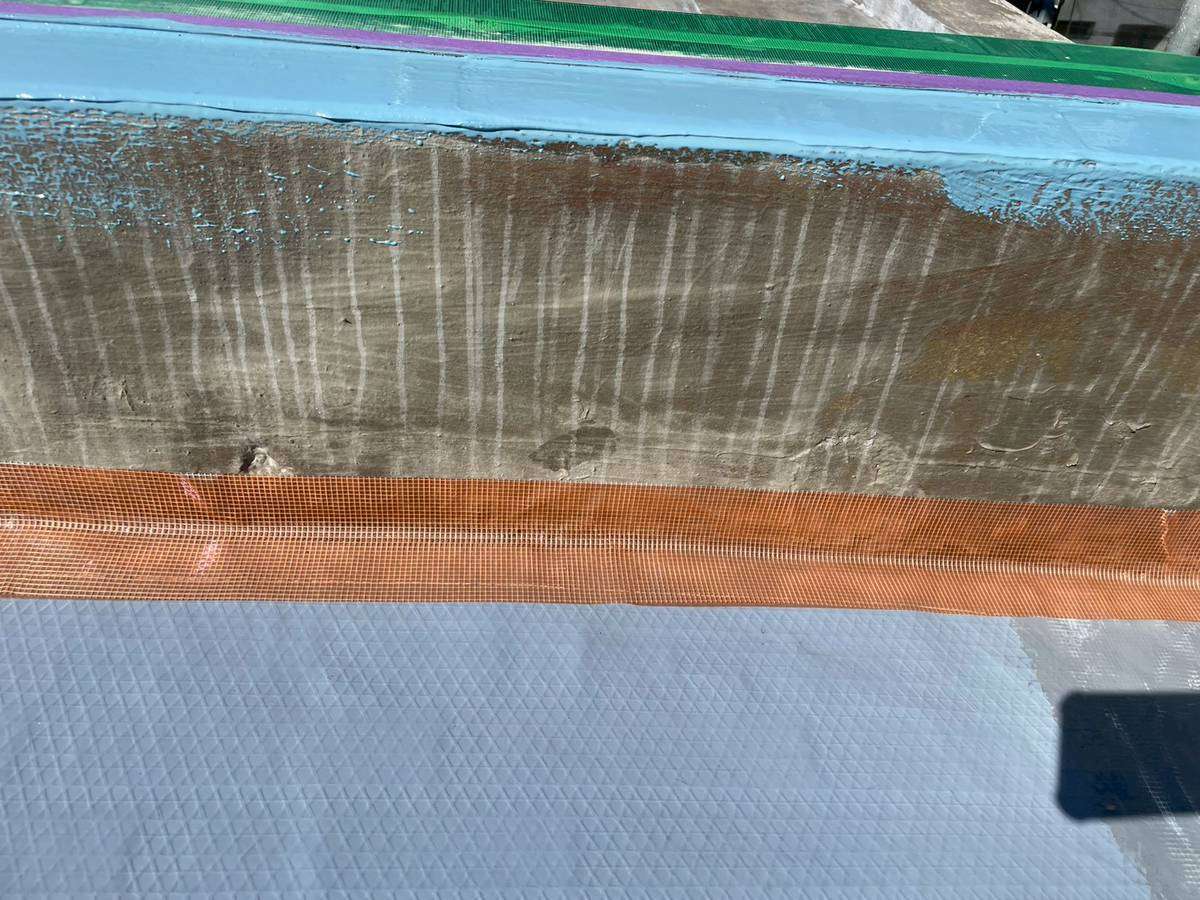 Kマンション様の昨日の作業は、軒天の補修後の柄付け・上塗り1回目塗装作業、通路中塗り塗装作業、屋上防水の脱気筒・改修ドレン取付け、エンドラップテープ・メッシュ・立ち上がり・平場部ウレタン樹脂1層目塗装作業を行いました。