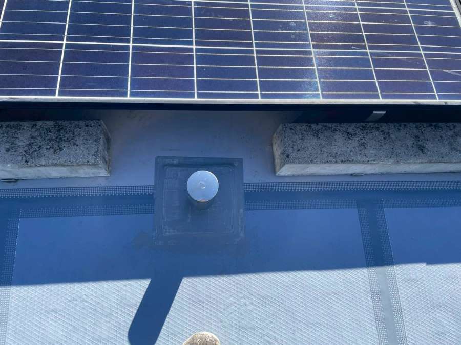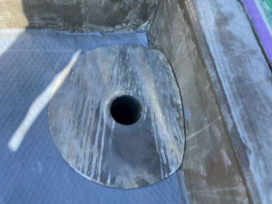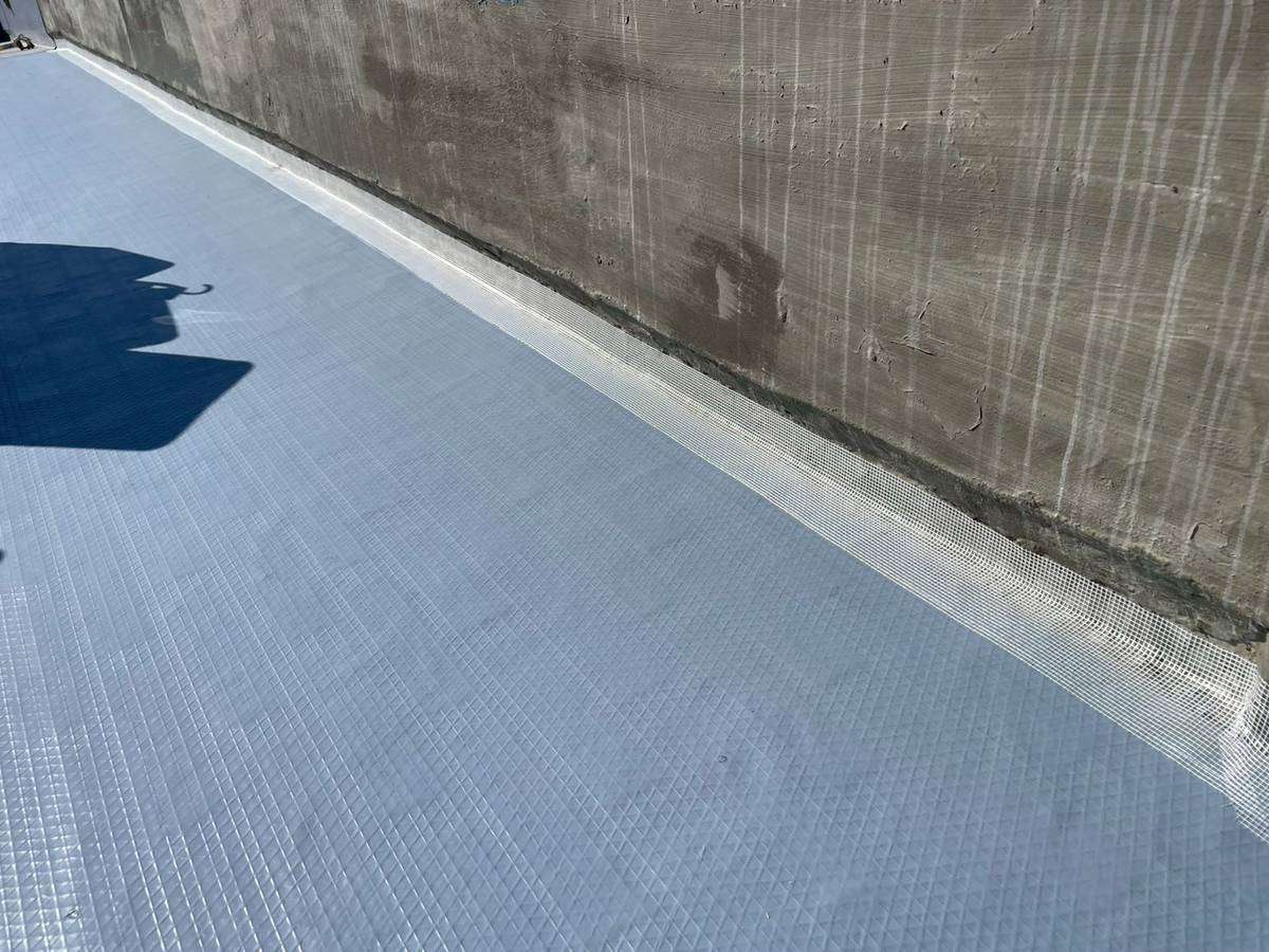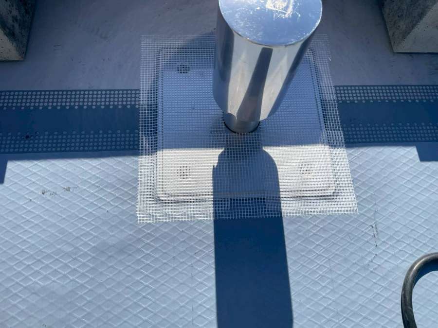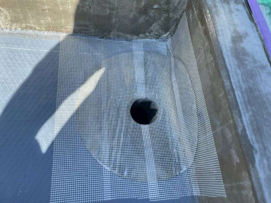 Kマンション様の昨日の作業は、軒天の補修後の柄付け・上塗り1回目塗装作業、通路中塗り塗装作業、屋上防水の脱気筒・改修ドレン取付け、エンドラップテープ・メッシュ・立ち上がり・平場部ウレタン樹脂1層目塗装作業を行いました。