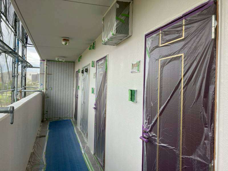 清須市Kマンション様の今日の作業は、通路・階段部の上塗り塗装作業予定です。