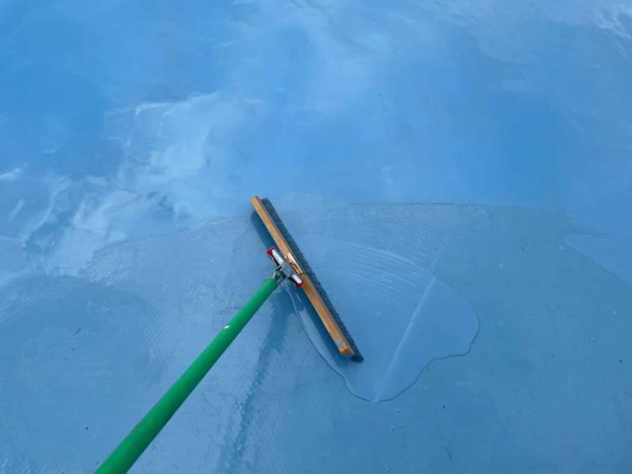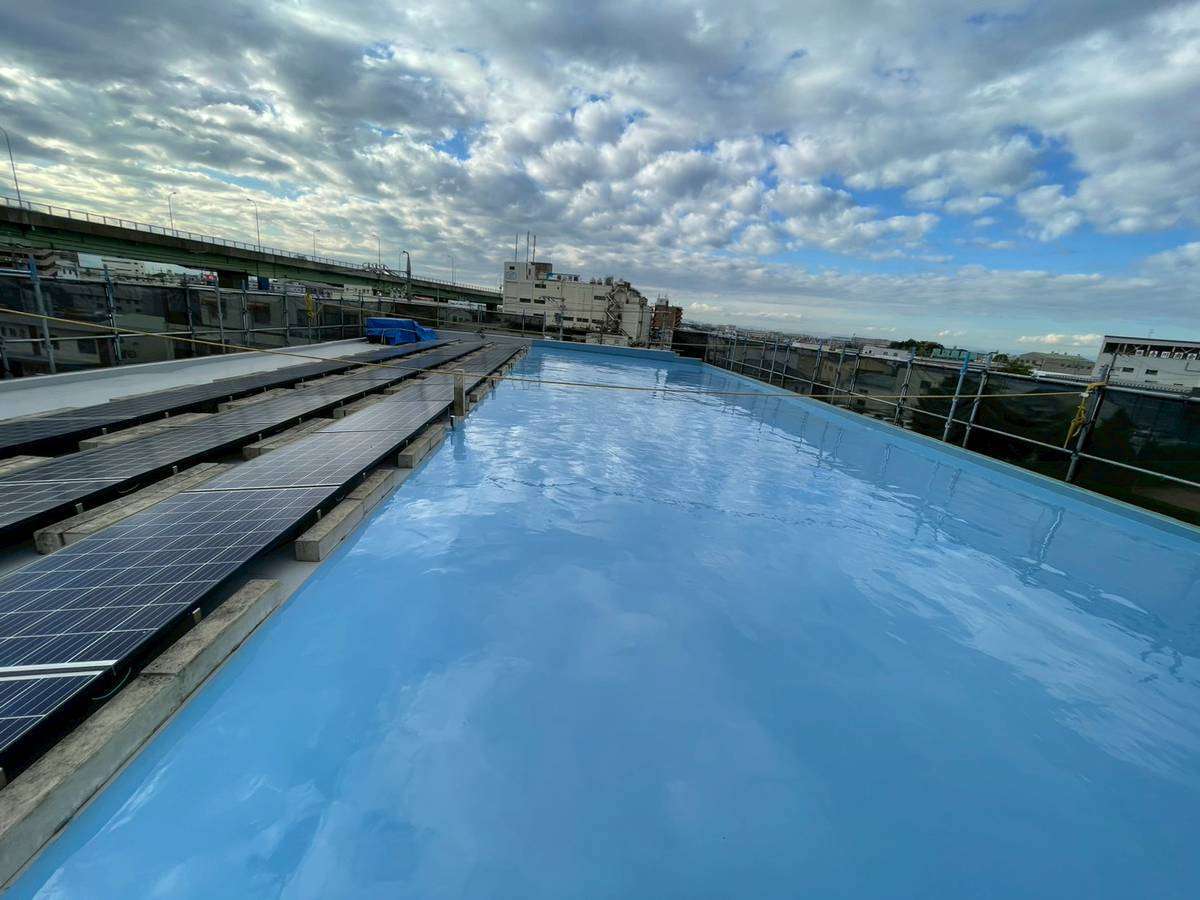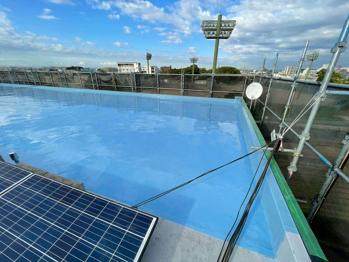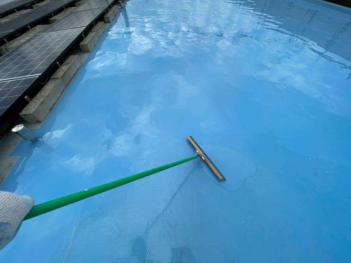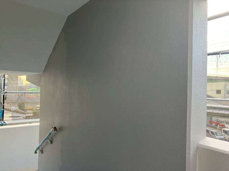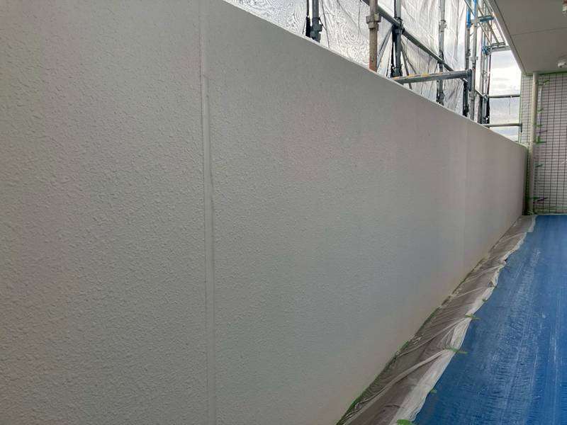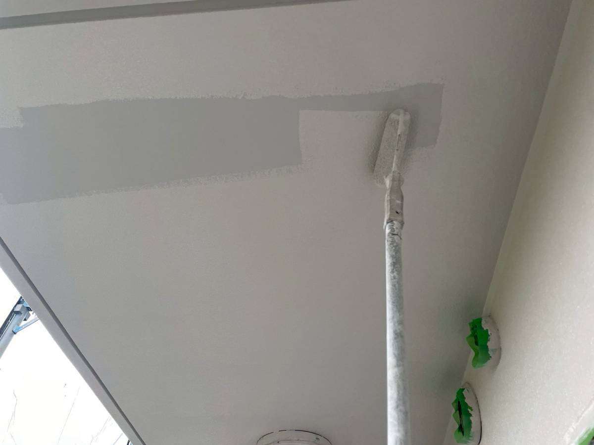 清須市Kマンション様の昨日の作業は、マンション通路・階段部の軒天2回目塗装、外壁中塗り塗装、屋上通気緩衝工法防水工事のウレタン樹脂2層目塗装作業を行っています。