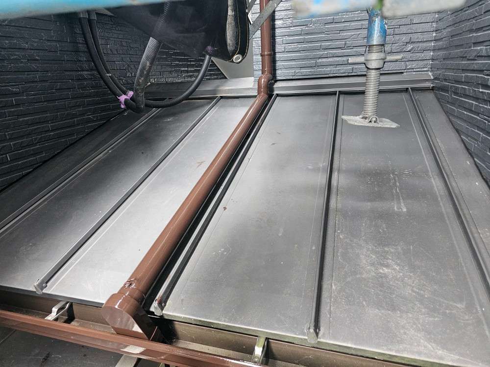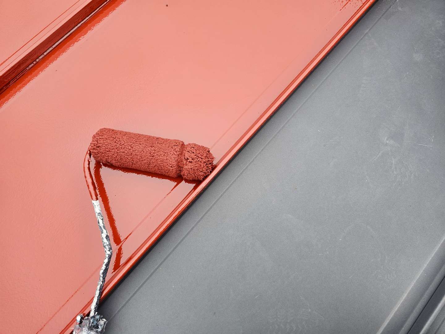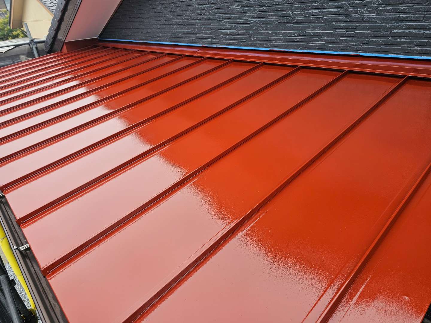 今日の作業は、板金屋根の中塗り塗装・コーキング作業を予定しています。