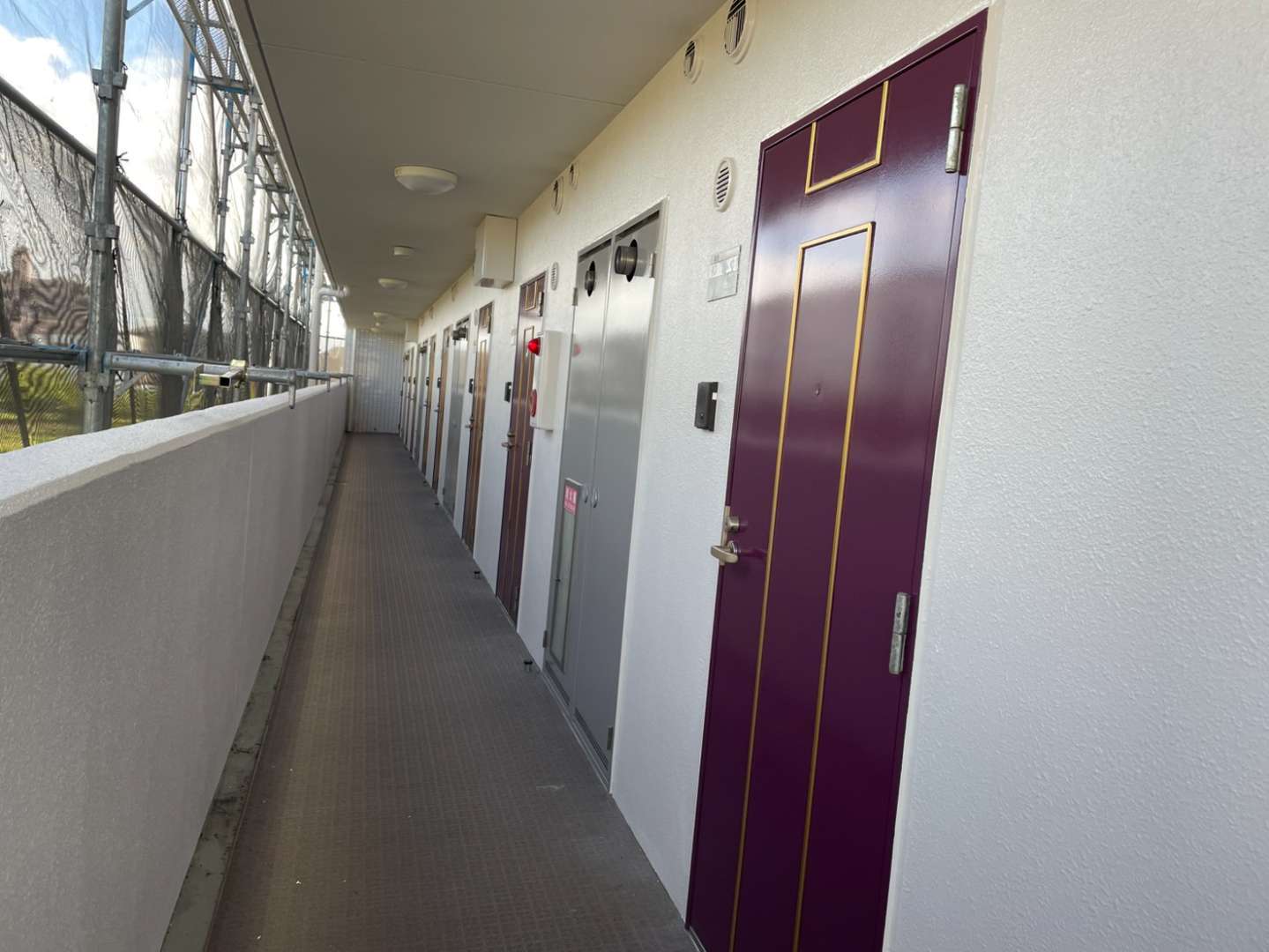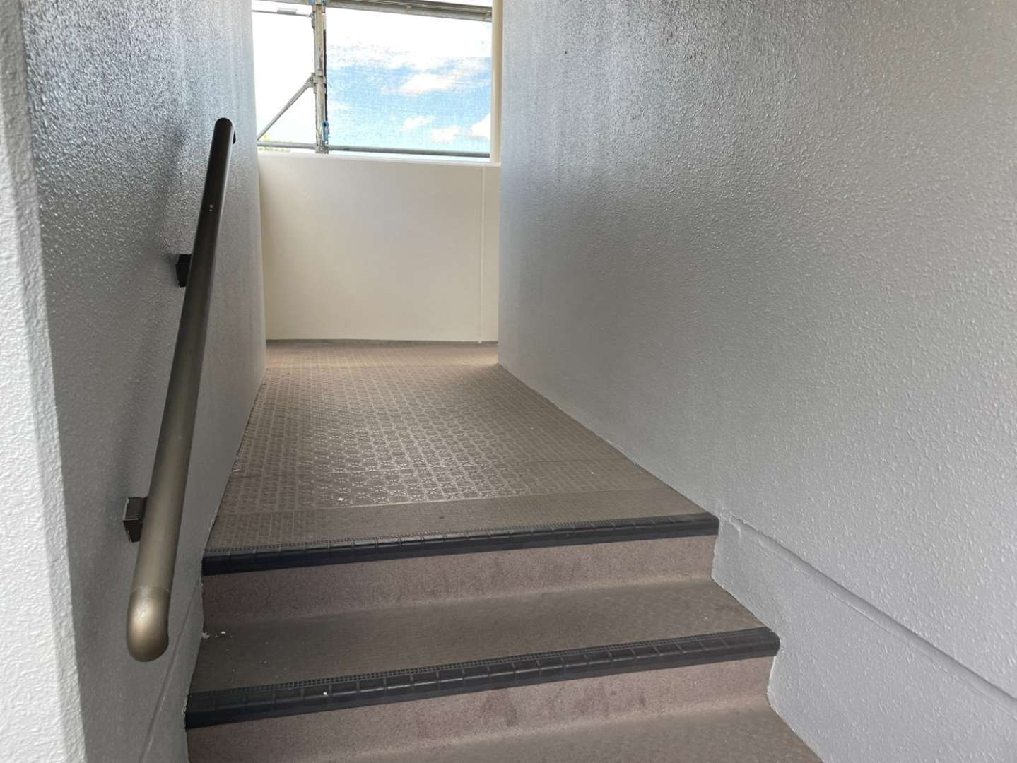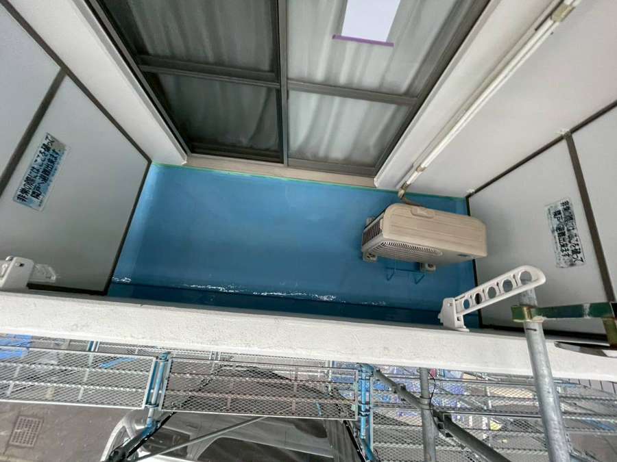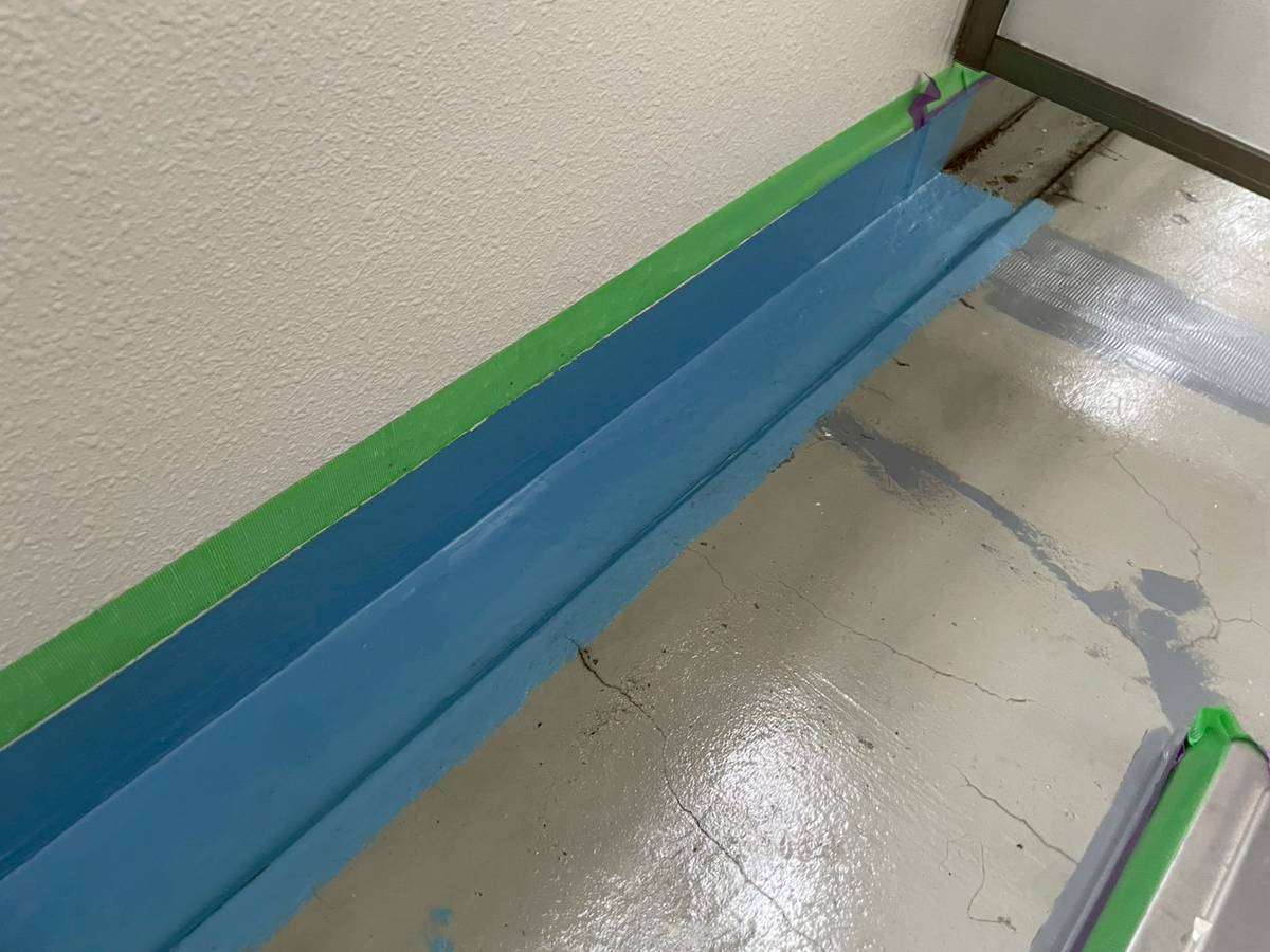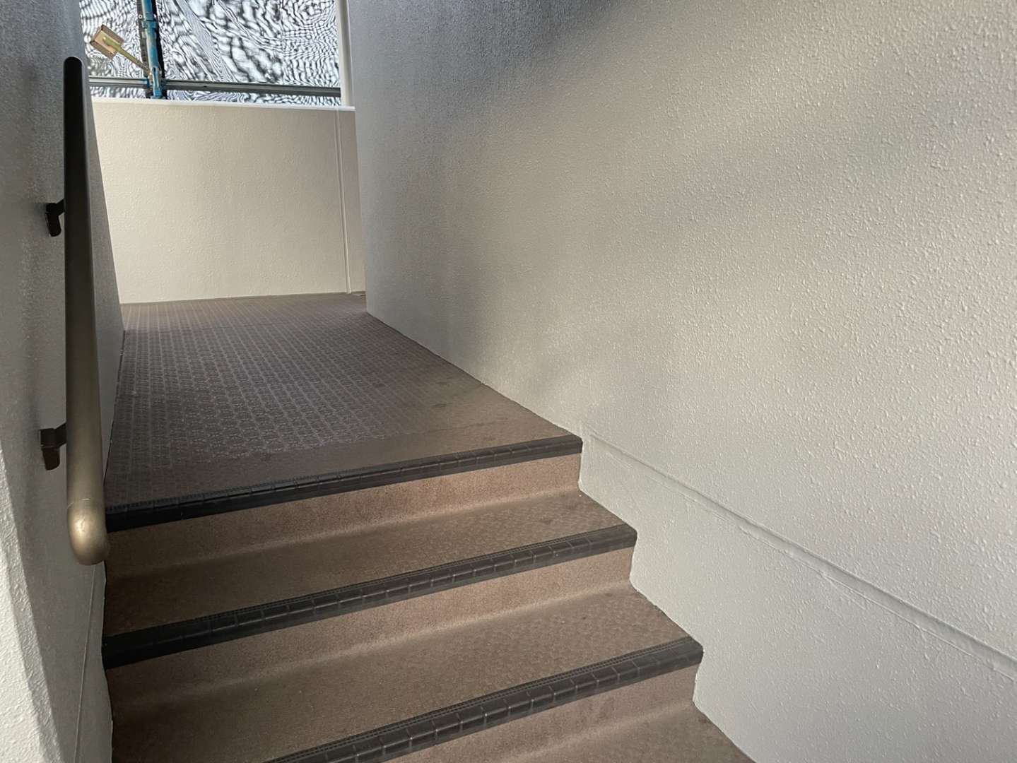 Kマンション様の作業は、2Fベランダのウレタン樹脂1層目塗装・1Fベランダのプライマー塗装まで進んでいます。階段・通路の塗装作業は、完了しました。