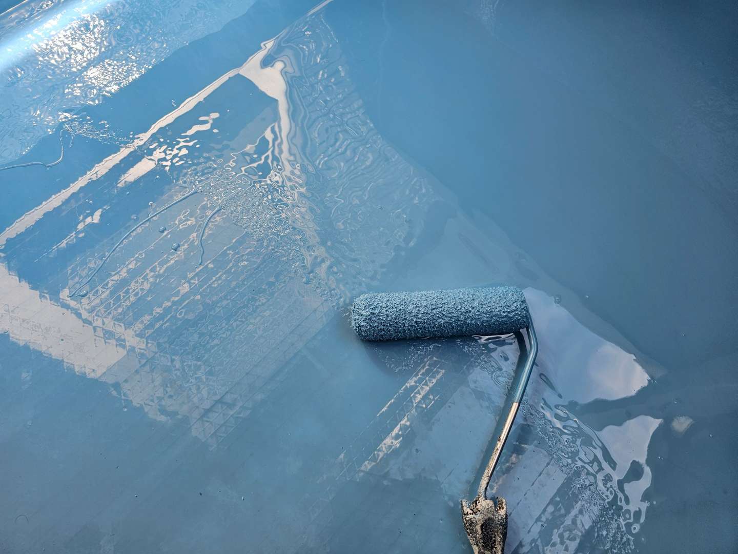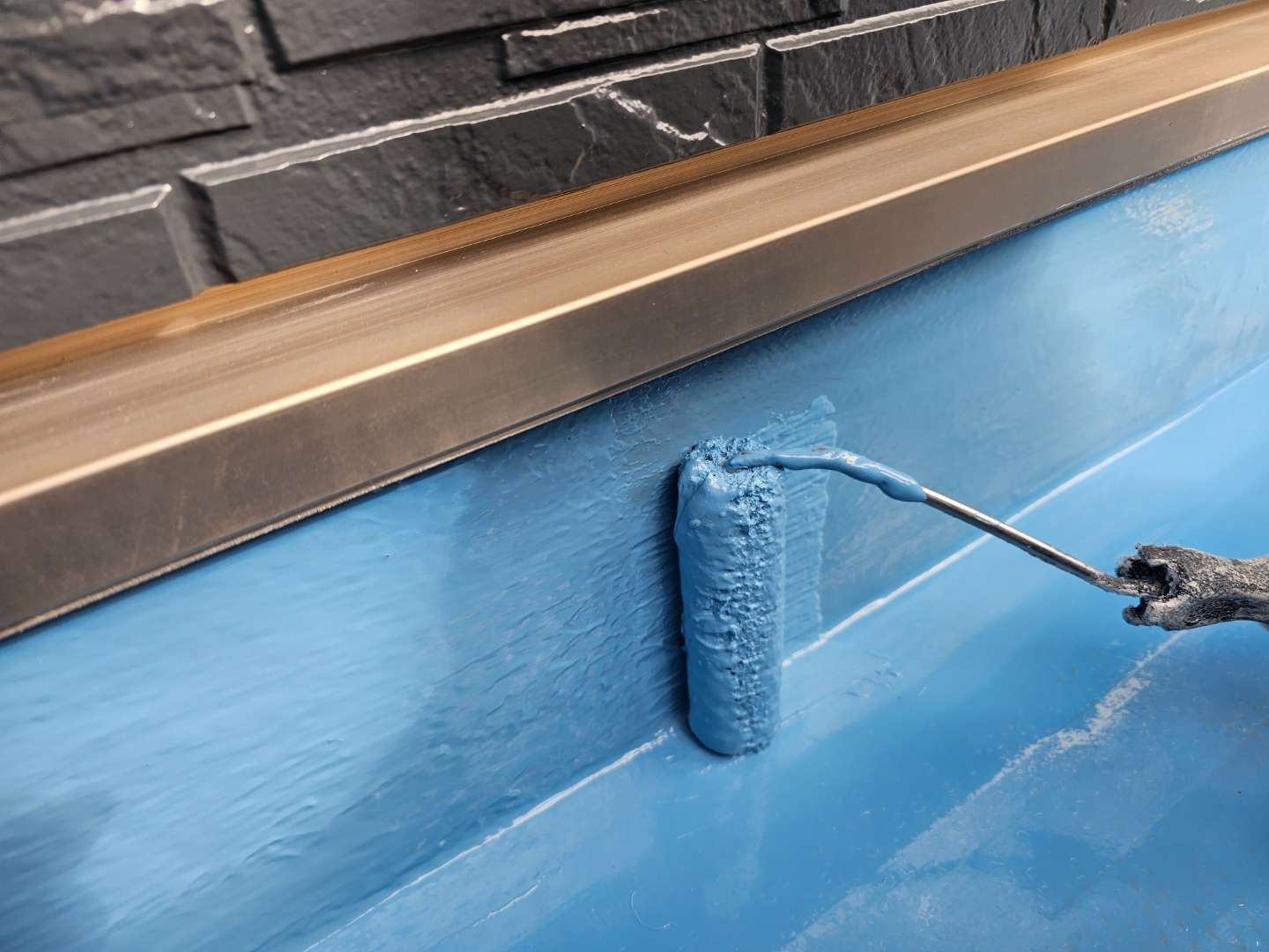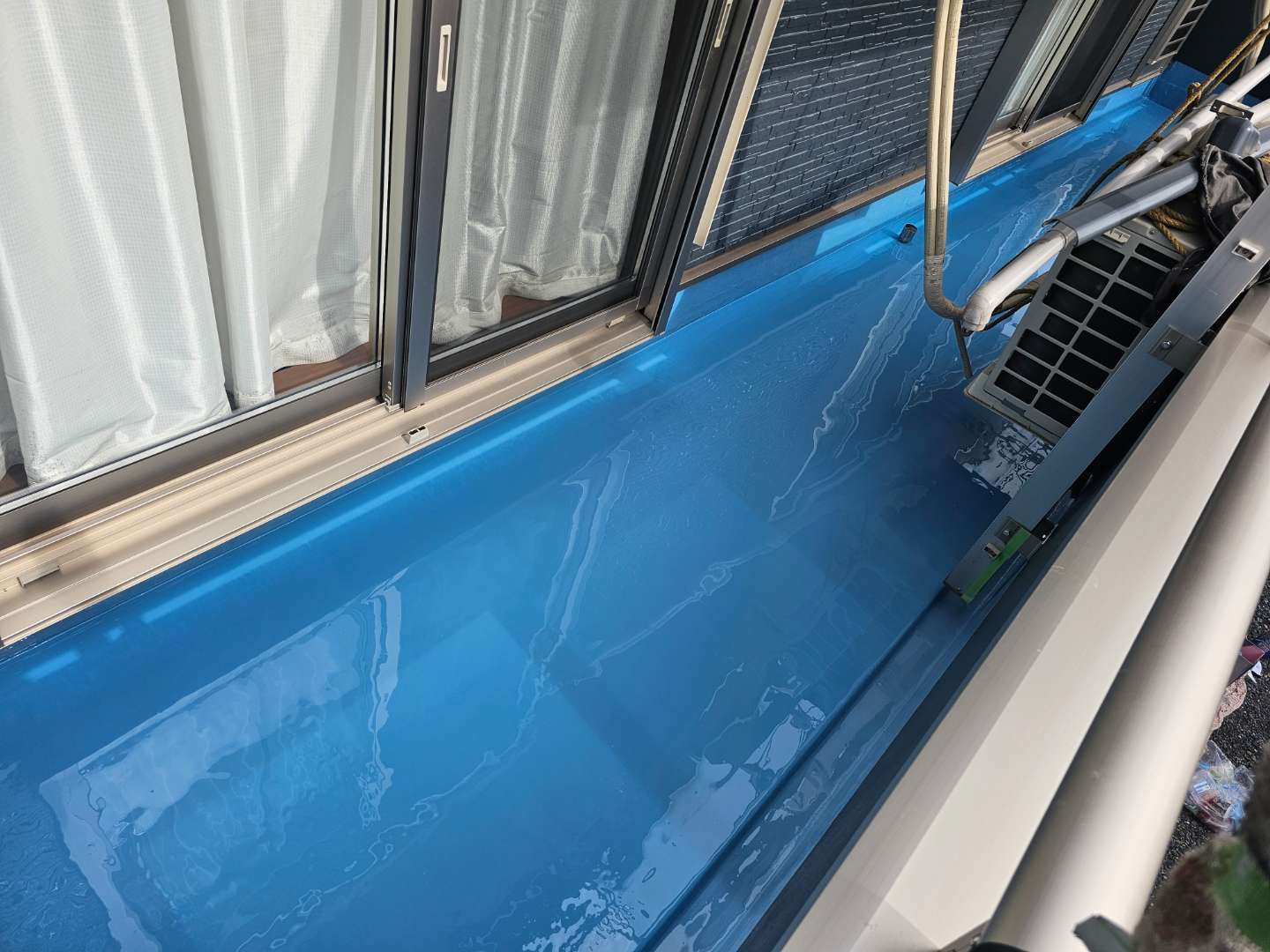 今日の作業は、ベランダ防水のトップコート塗装作業を予定しています。