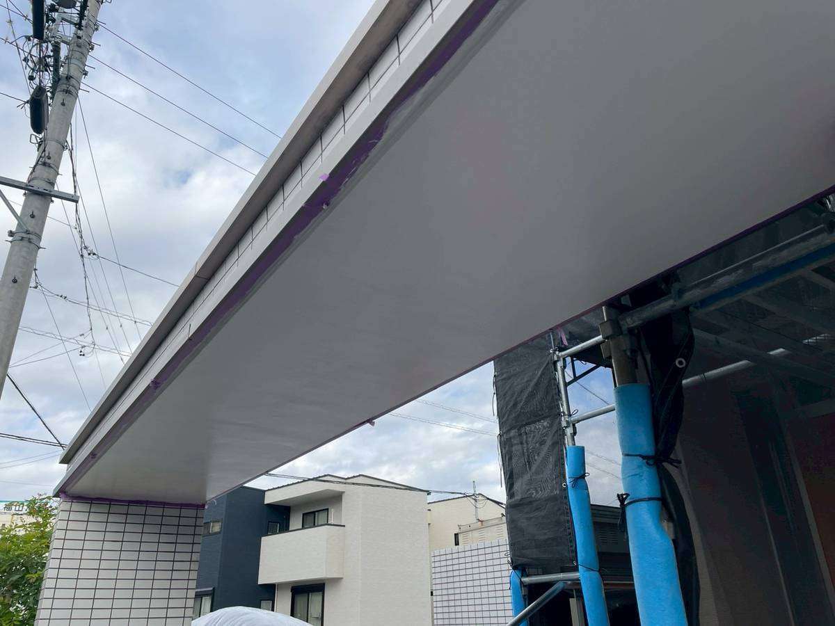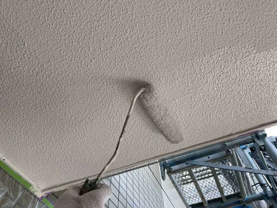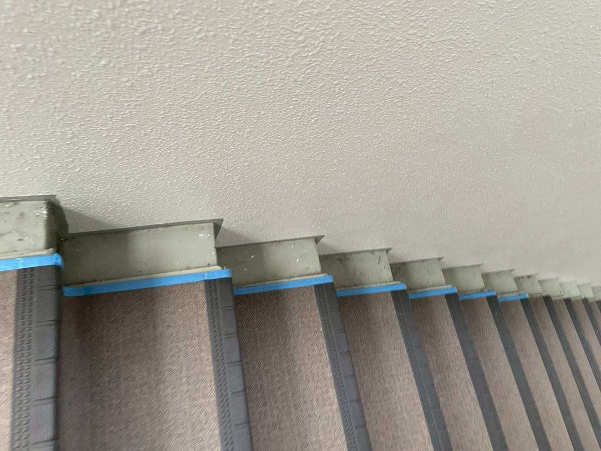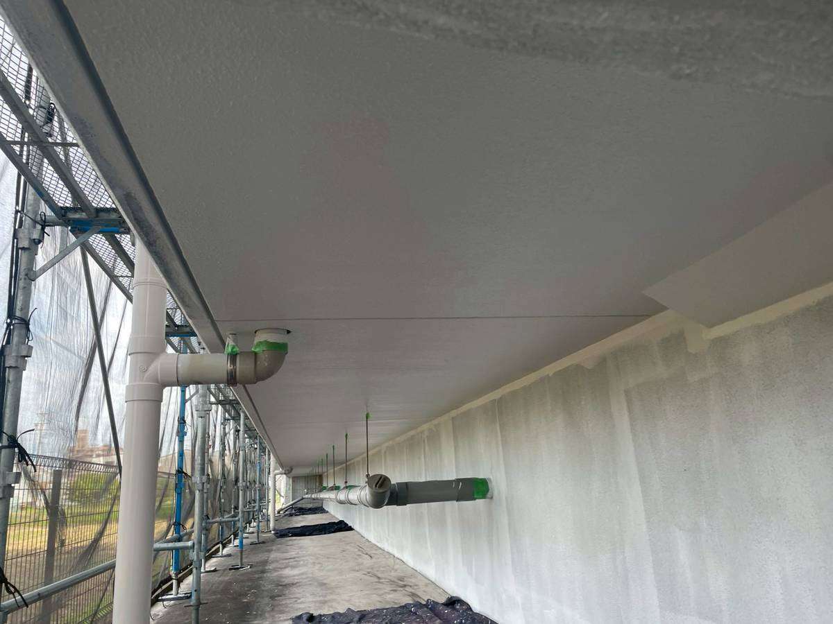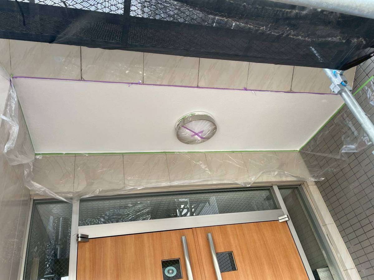 Kマンション様の昨日の作業は、エントランスの軒天塗装作業・駐輪場の壁塗装作業・基礎部軒天塗装作業・階段、通路脇の側溝のトップコート塗装前の養生作業・2Fベランダのウレタン2層目塗装・1Fベランダのウレタン樹脂1層目塗装作業・太陽光パネルの移動・設置作業を行っていました。