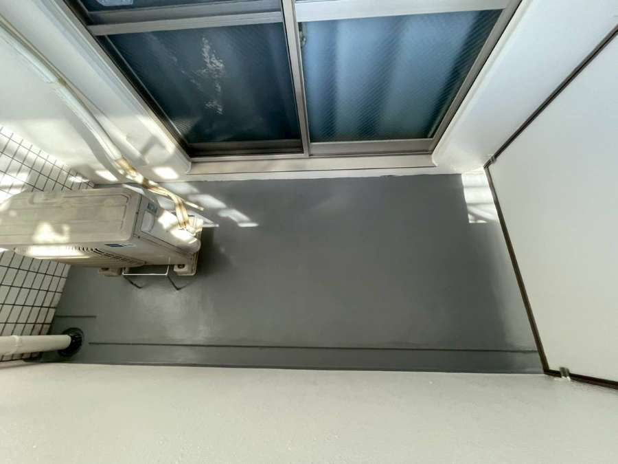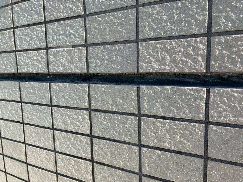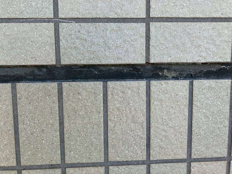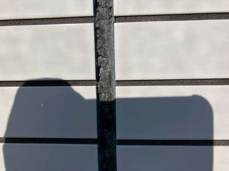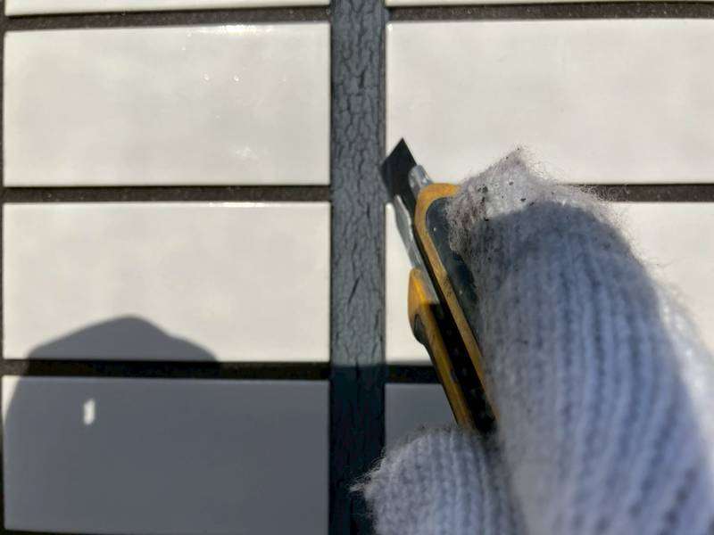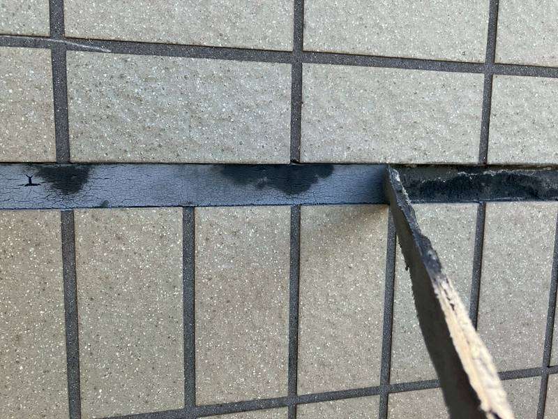 Kマンション様昨日の作業は、1Fベランダのトップコート塗装作業・タイル目地のコーキング打替え作業で旧シーリング材の撤去作業を行っていました。