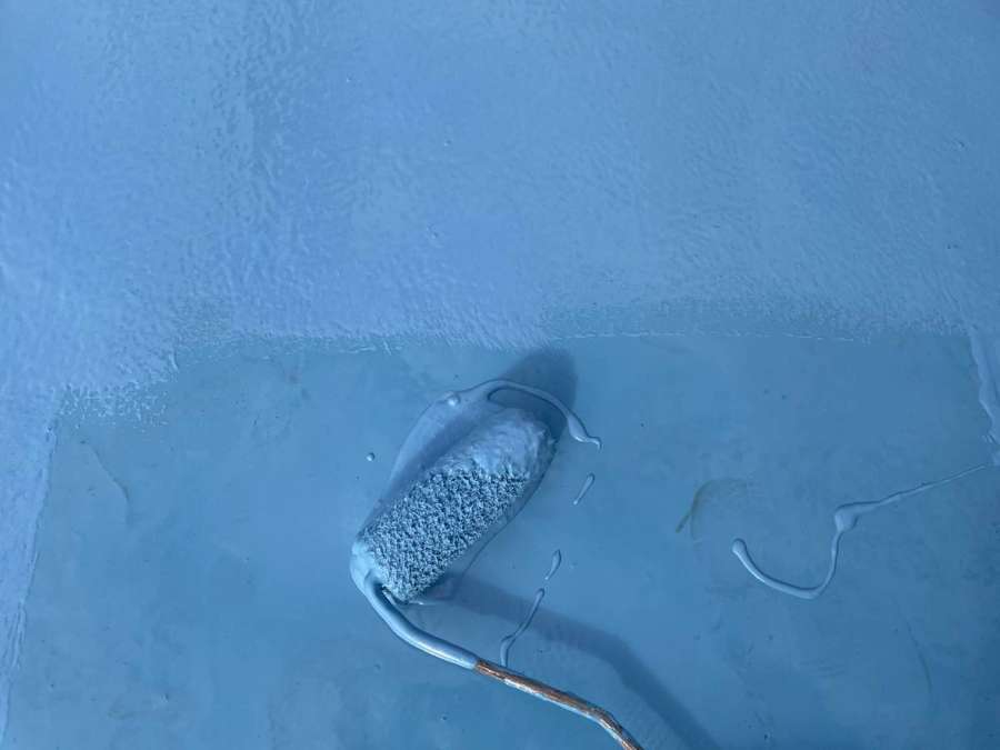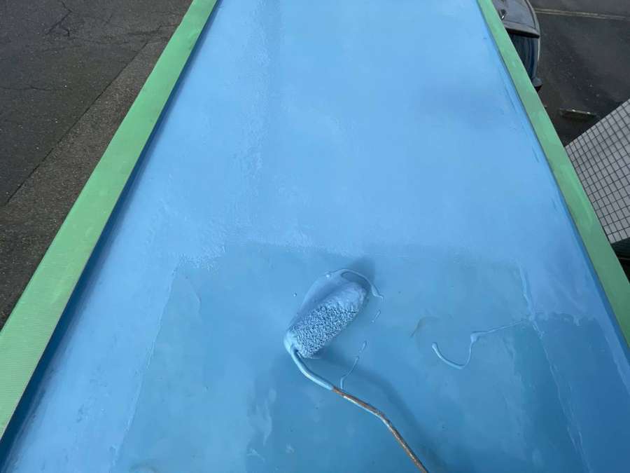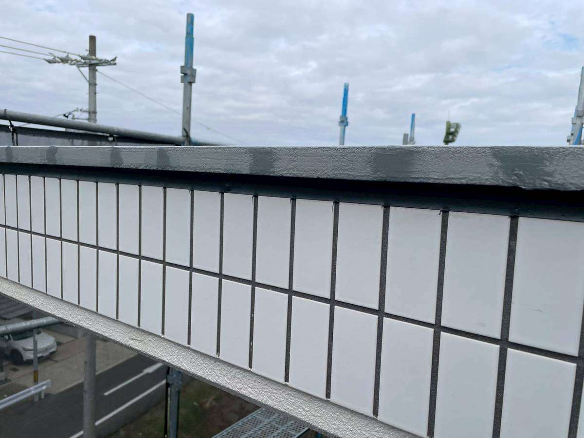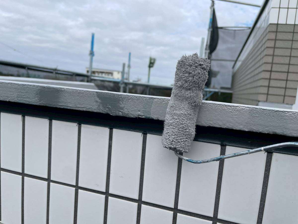エントランス屋根の立上り部ウレタン樹脂1層目・2層目塗装、門柱天板のウレタン樹脂2層目塗装作業まで完了しています。