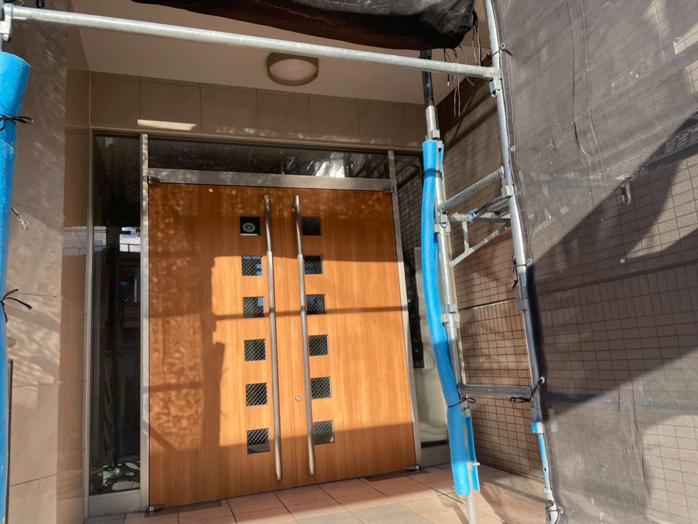 本日、駐車場の屋根塗装・駐車場のライン引き・エントランス屋根の防水作業を行っています。