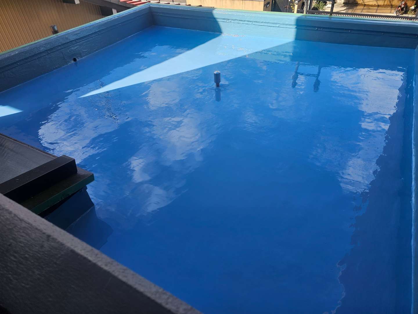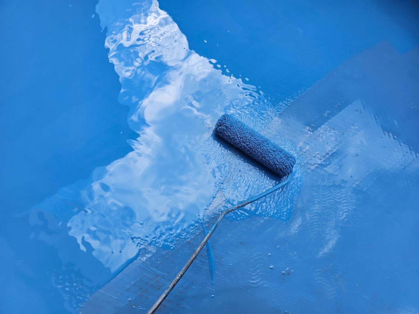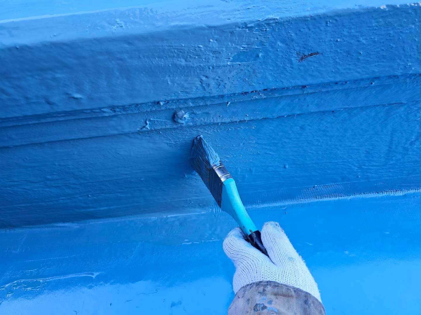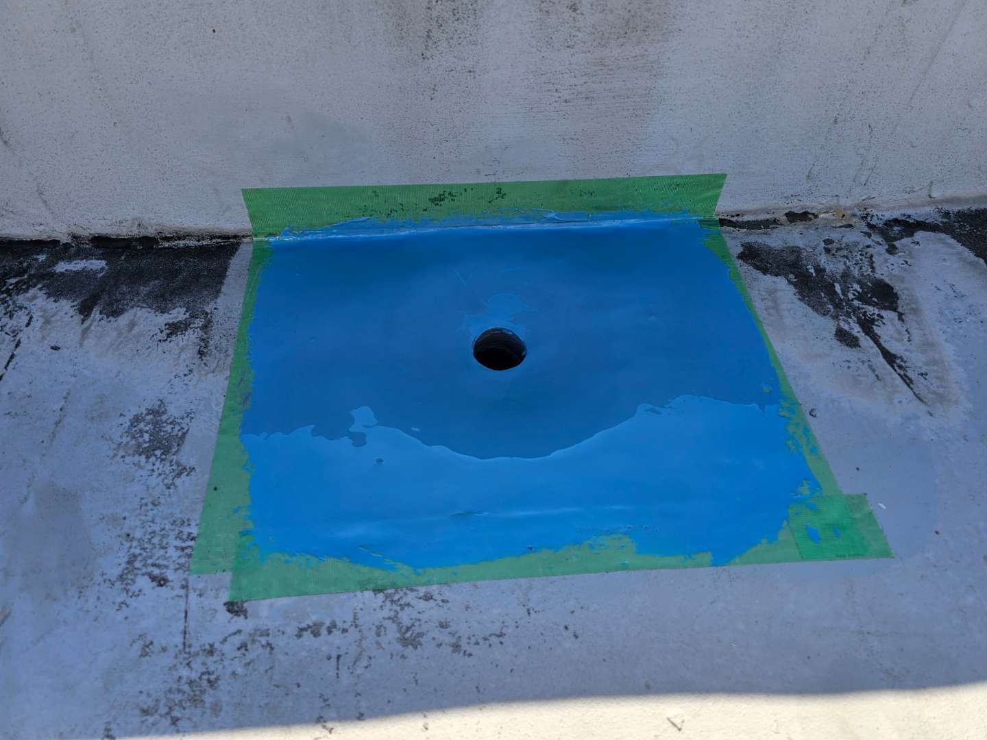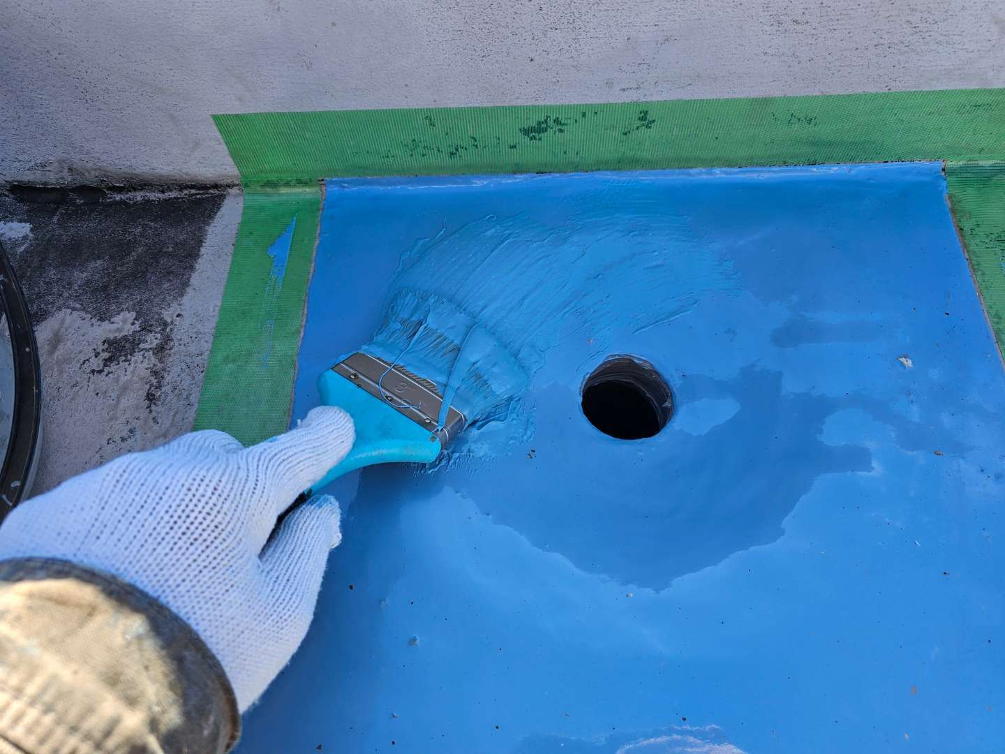 エントランス屋根・屋上の改修ドレン廻りのウレタン樹脂2層目塗装作業を行っていました。