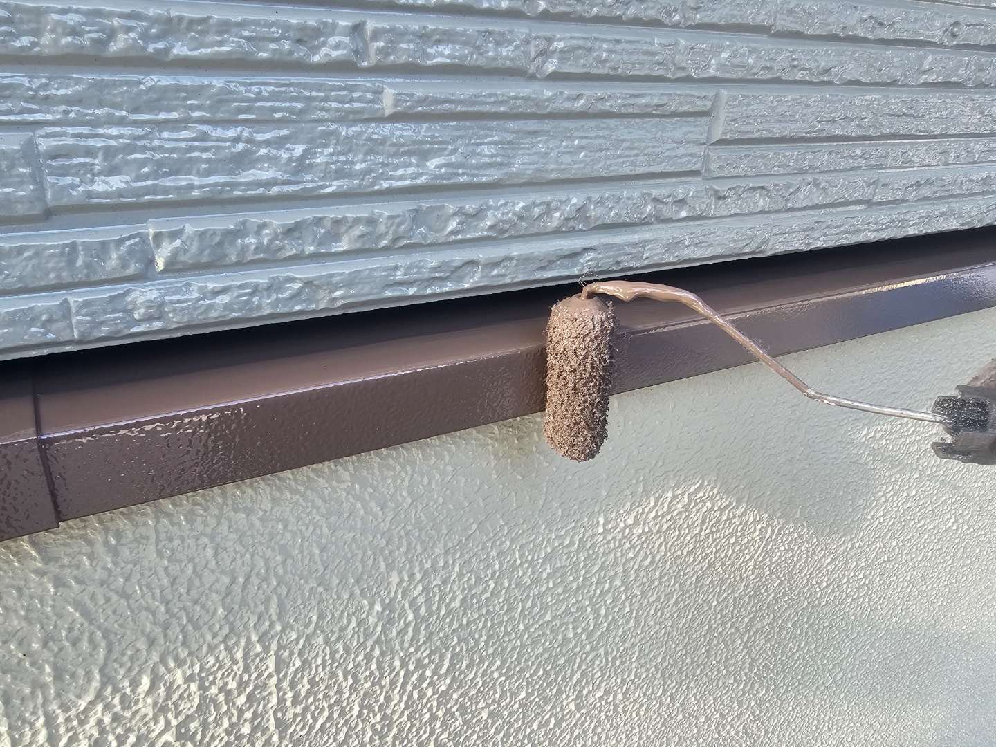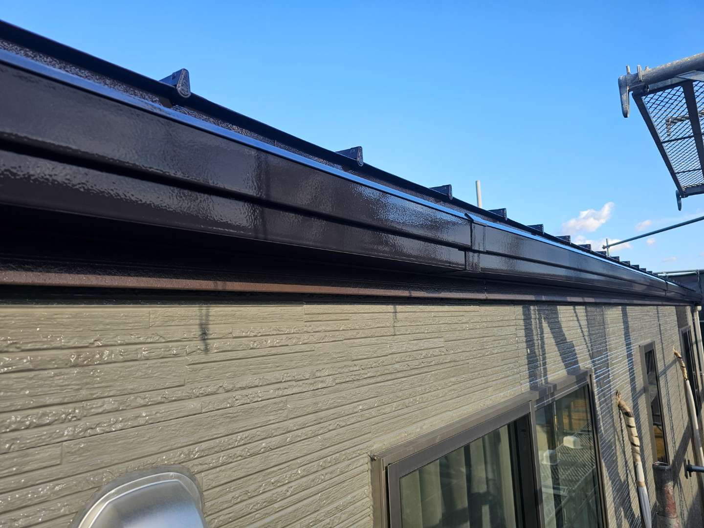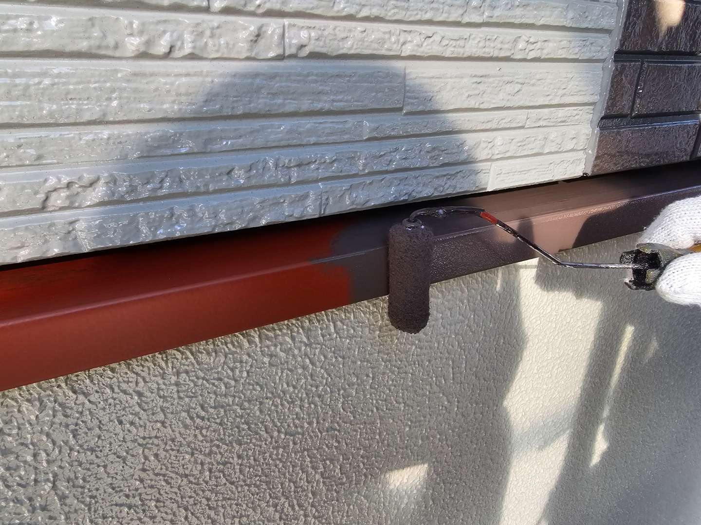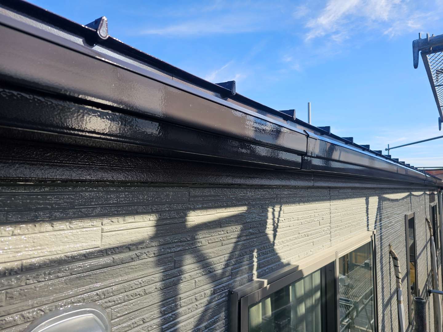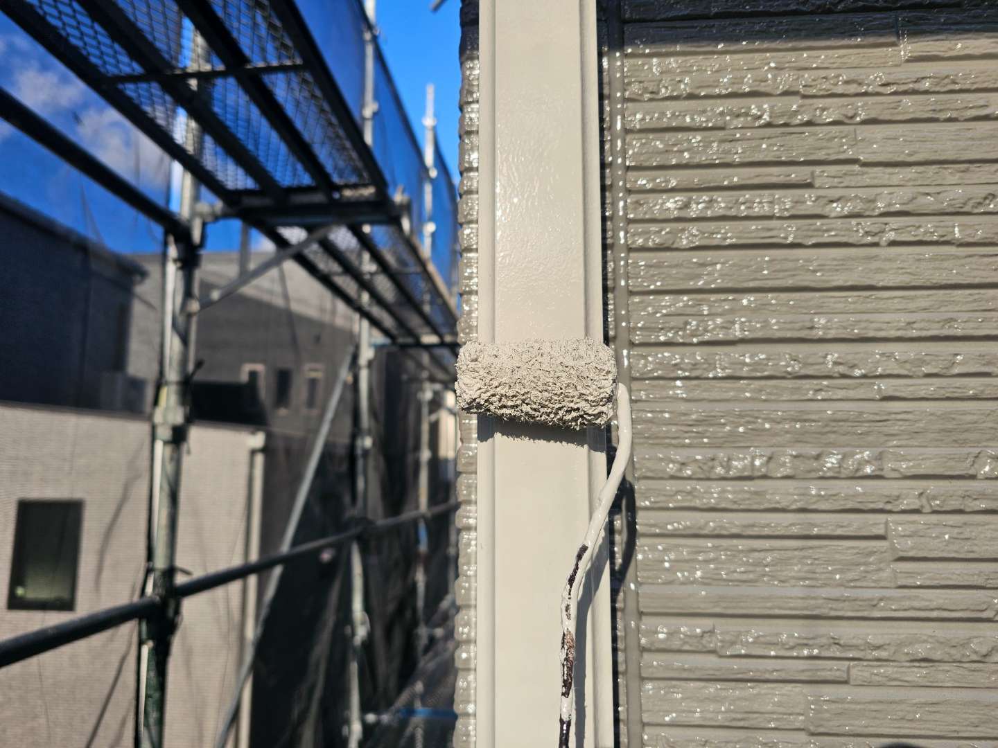 Y様邸の昨日の作業内容は、付帯部塗装の水切り・軒樋・縦樋の上塗り1回目・2回目塗装作業を行っていました。