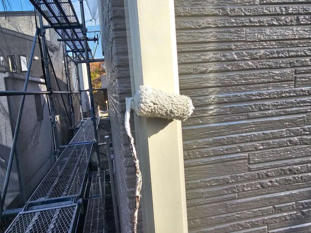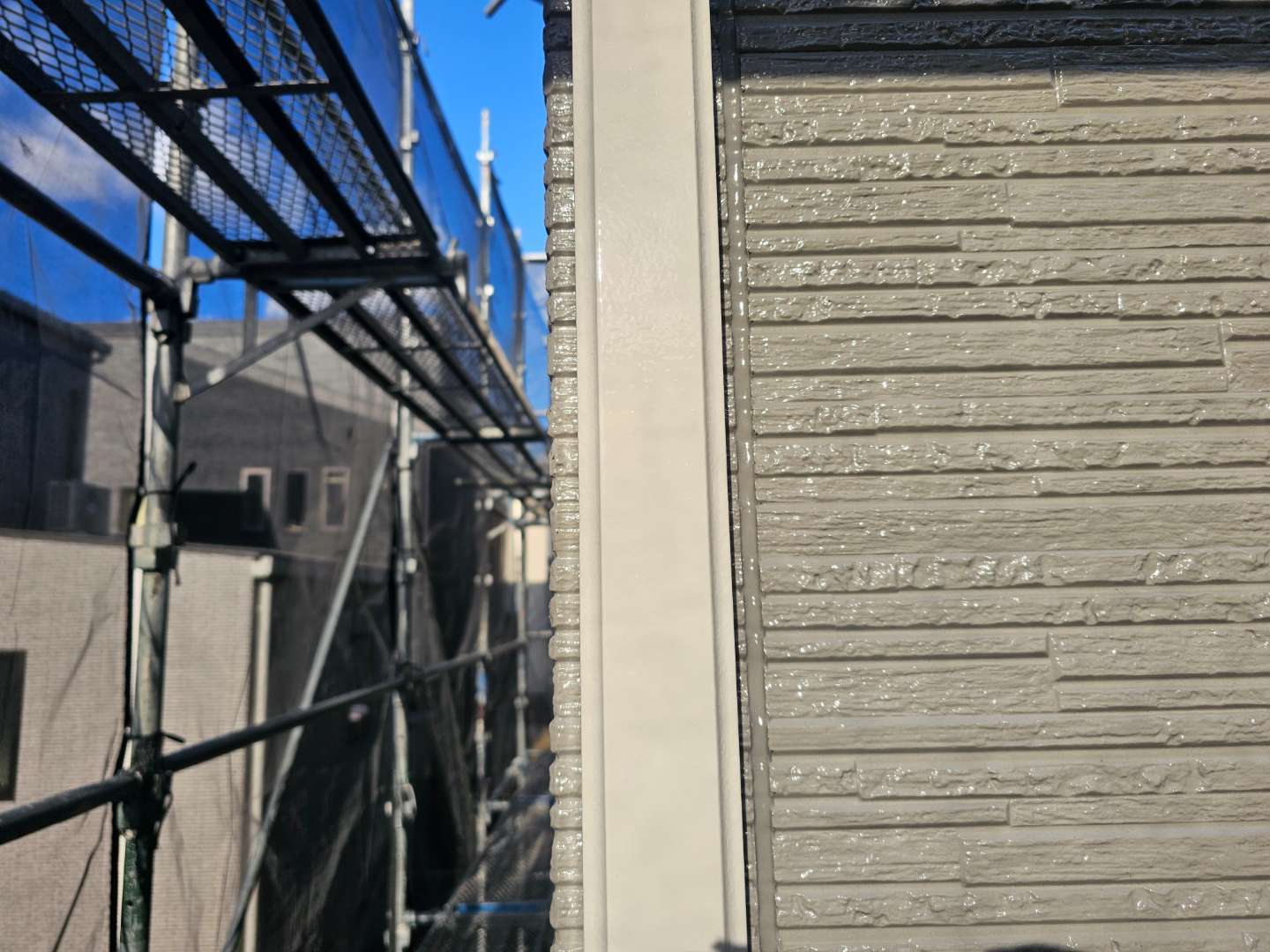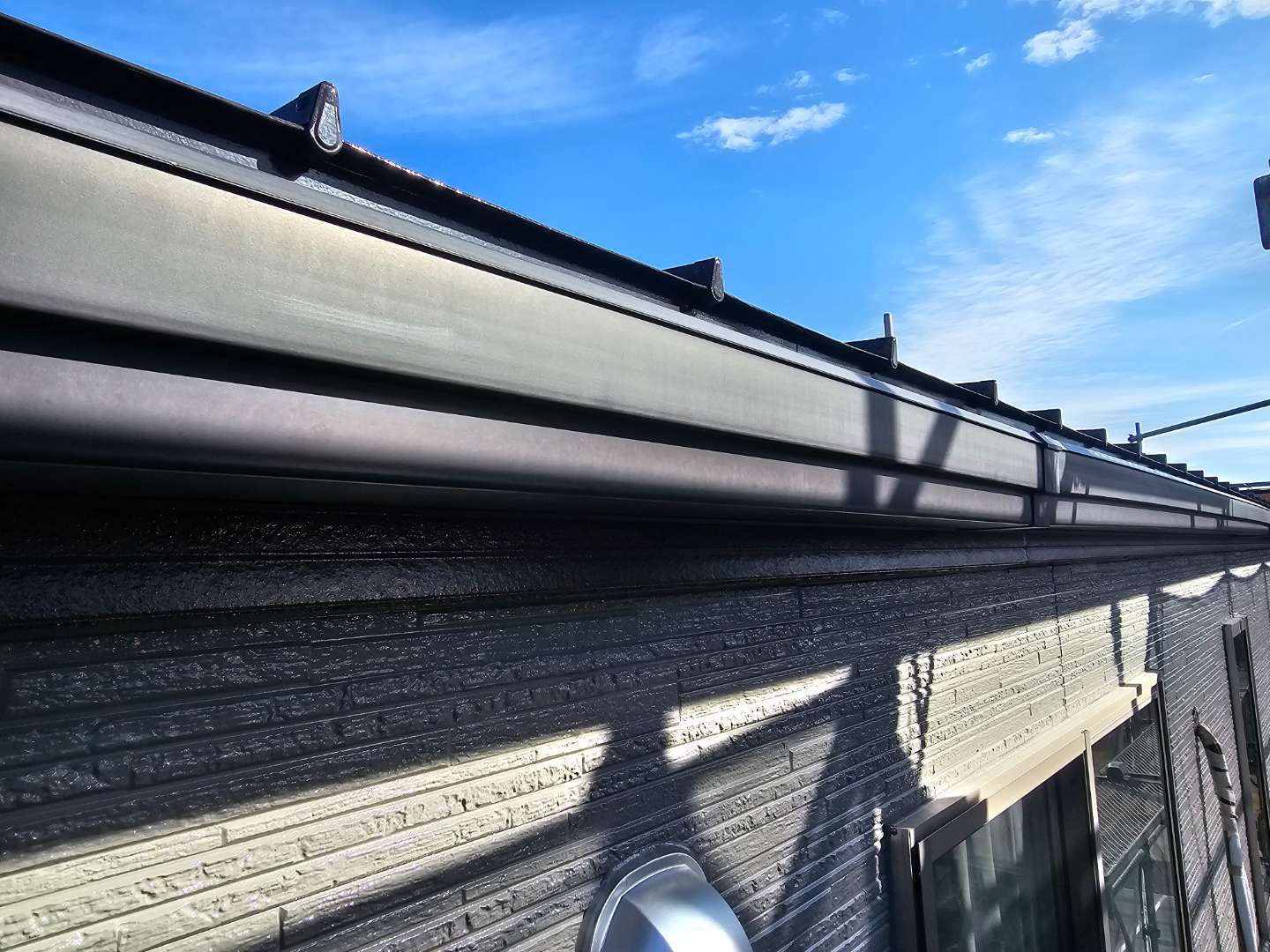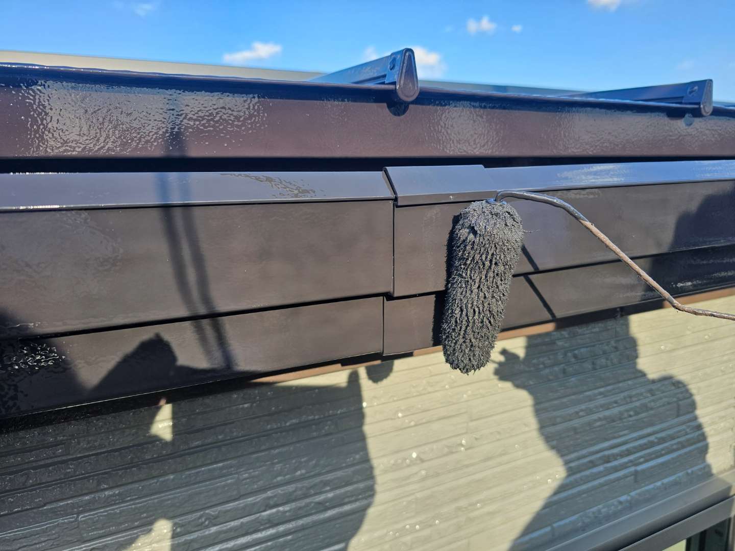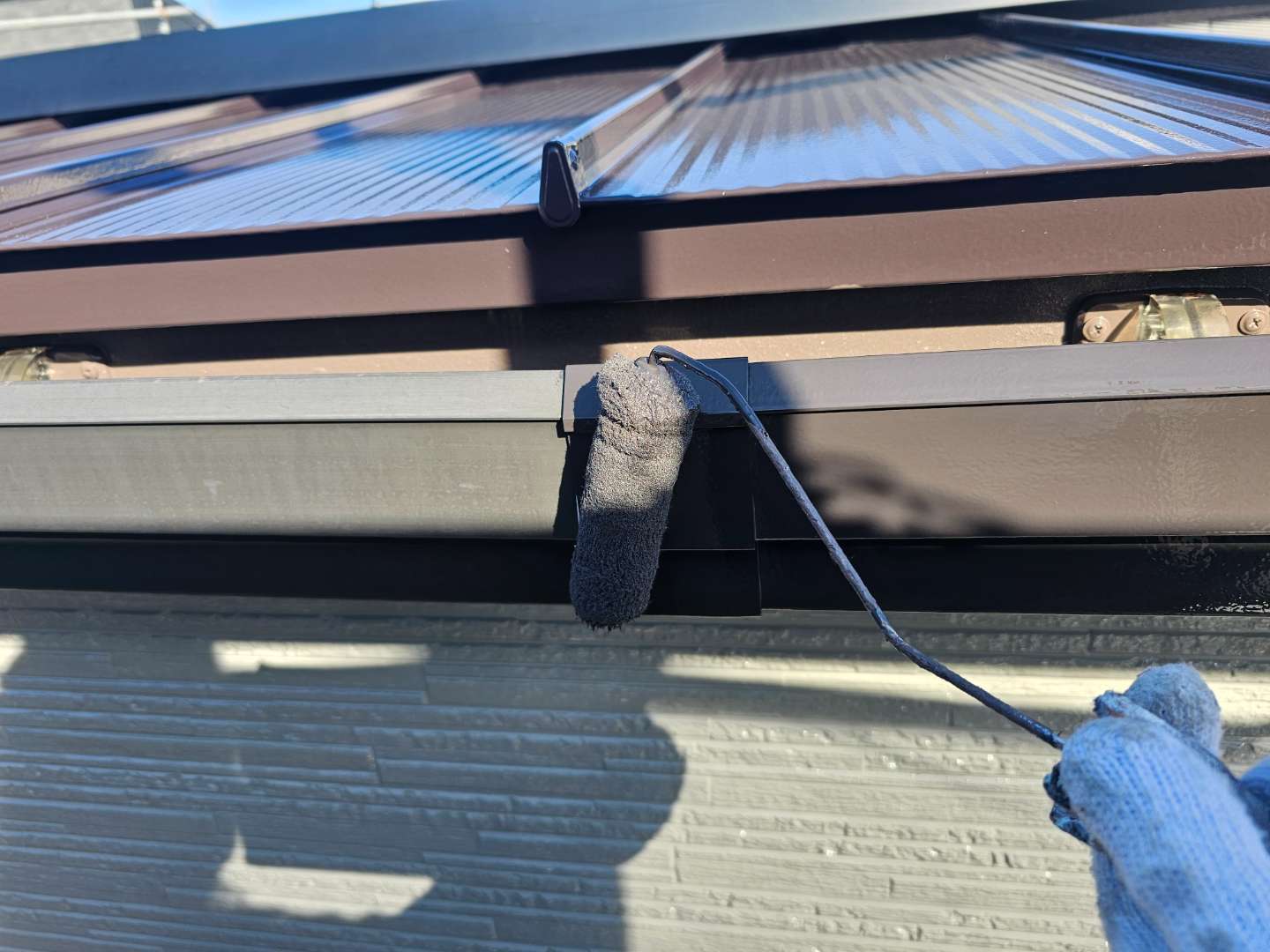 Y様邸の昨日の作業内容は、付帯部塗装の水切り・軒樋・縦樋の上塗り1回目・2回目塗装作業を行っていました。