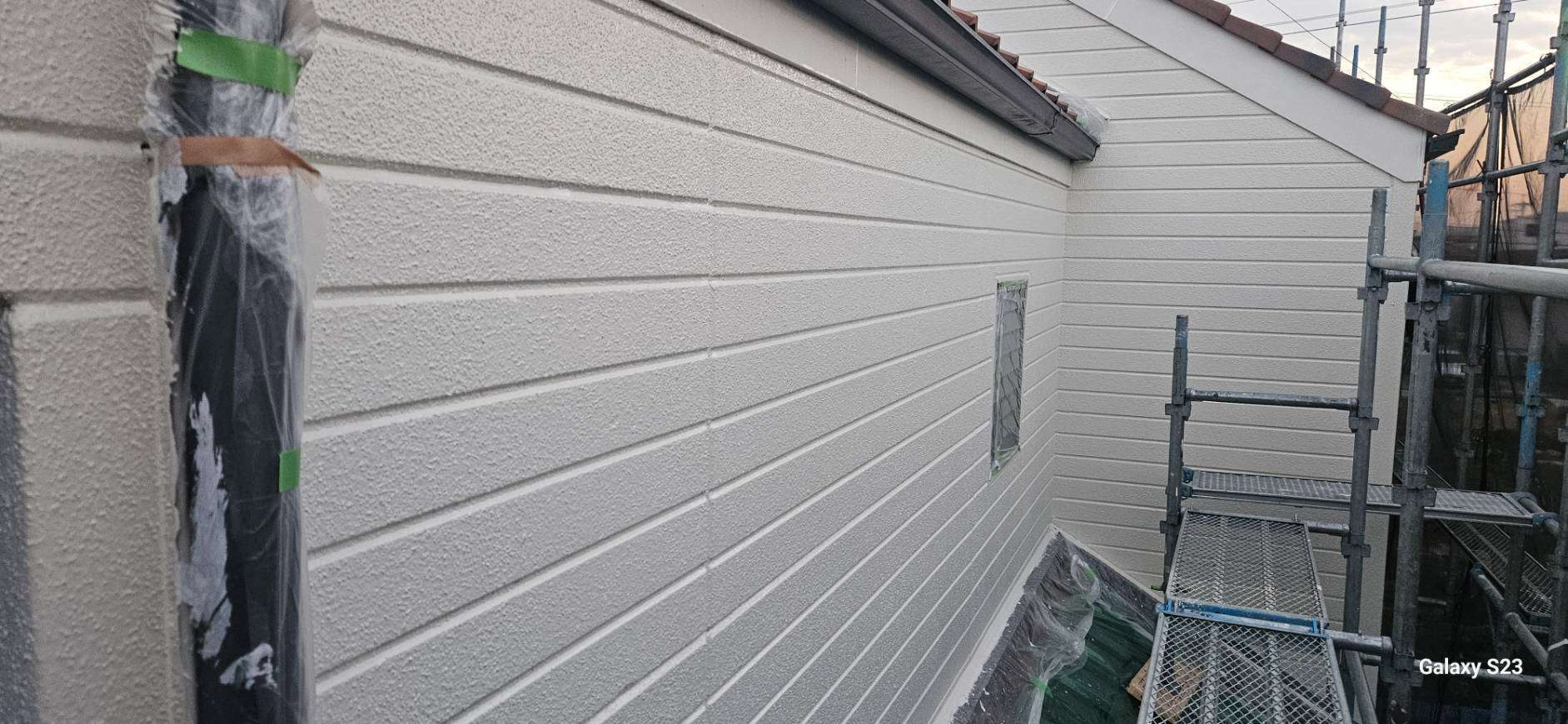 T様邸の昨日の作業内容は、前日に続き外壁の下塗り塗装と中塗り塗装作業を行っていました。