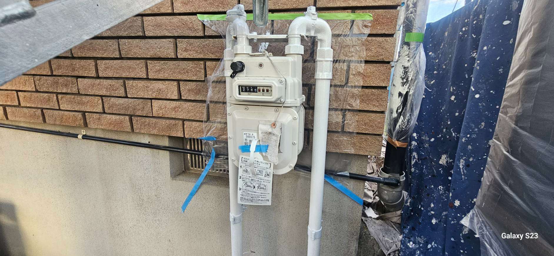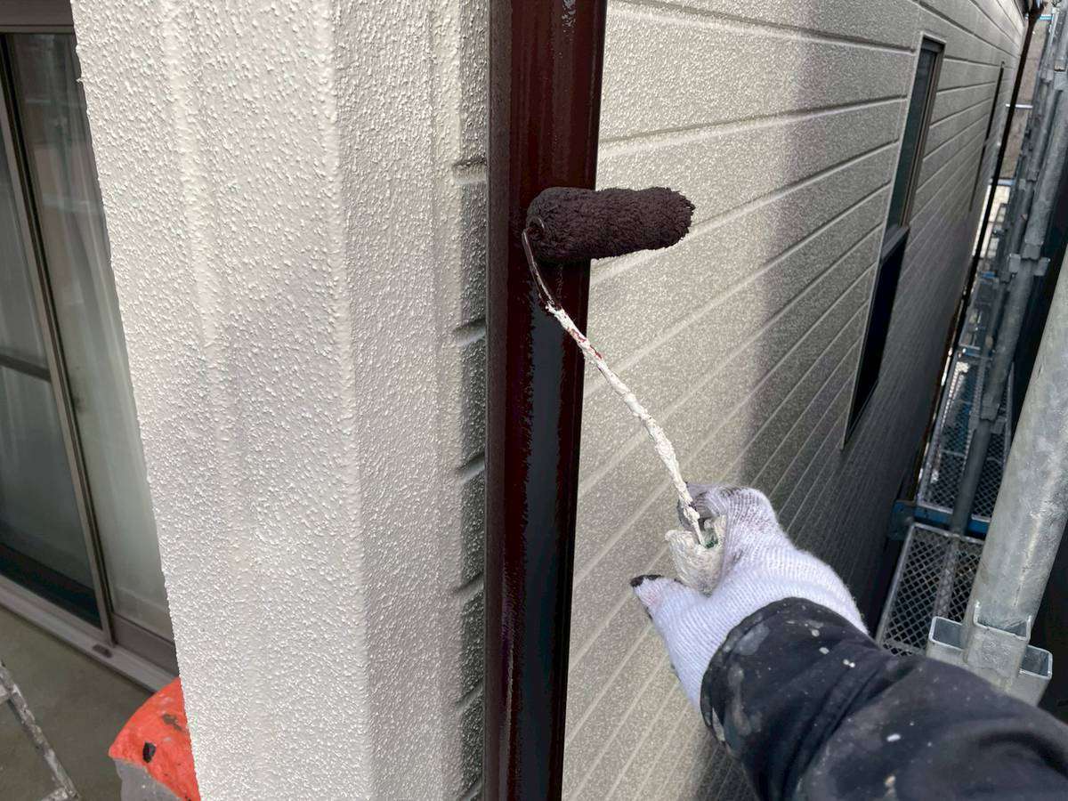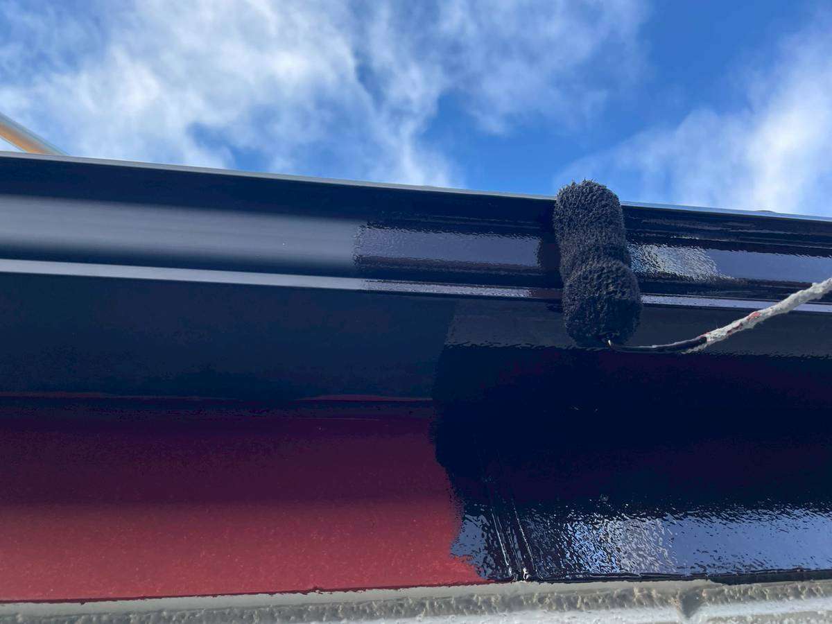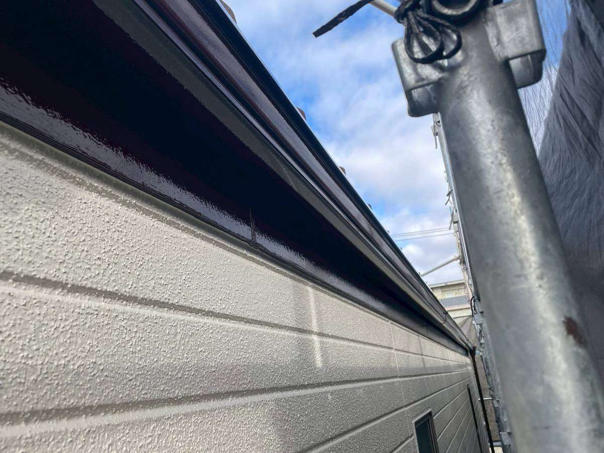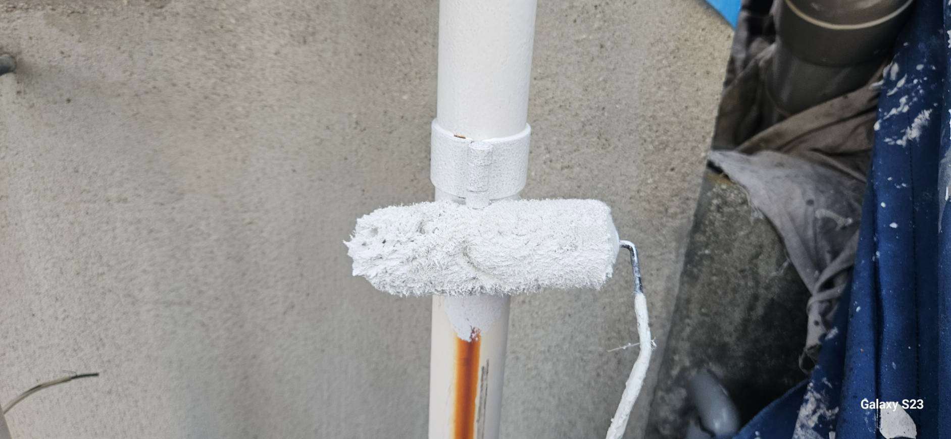 破風板・鼻隠し板・軒樋・縦樋の上塗り1回目塗装、シャッターボックスは、上塗り1回目・2回目塗装、軒天の換気口は下塗り、上塗り1回目・2回目塗装、鉄部ガス管は、下塗り(錆止め)塗装まで進んでいます。