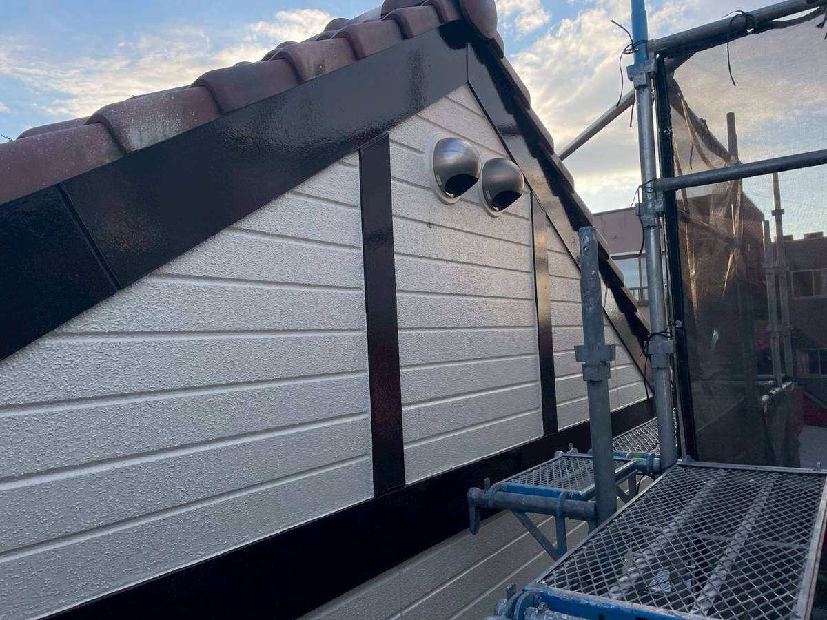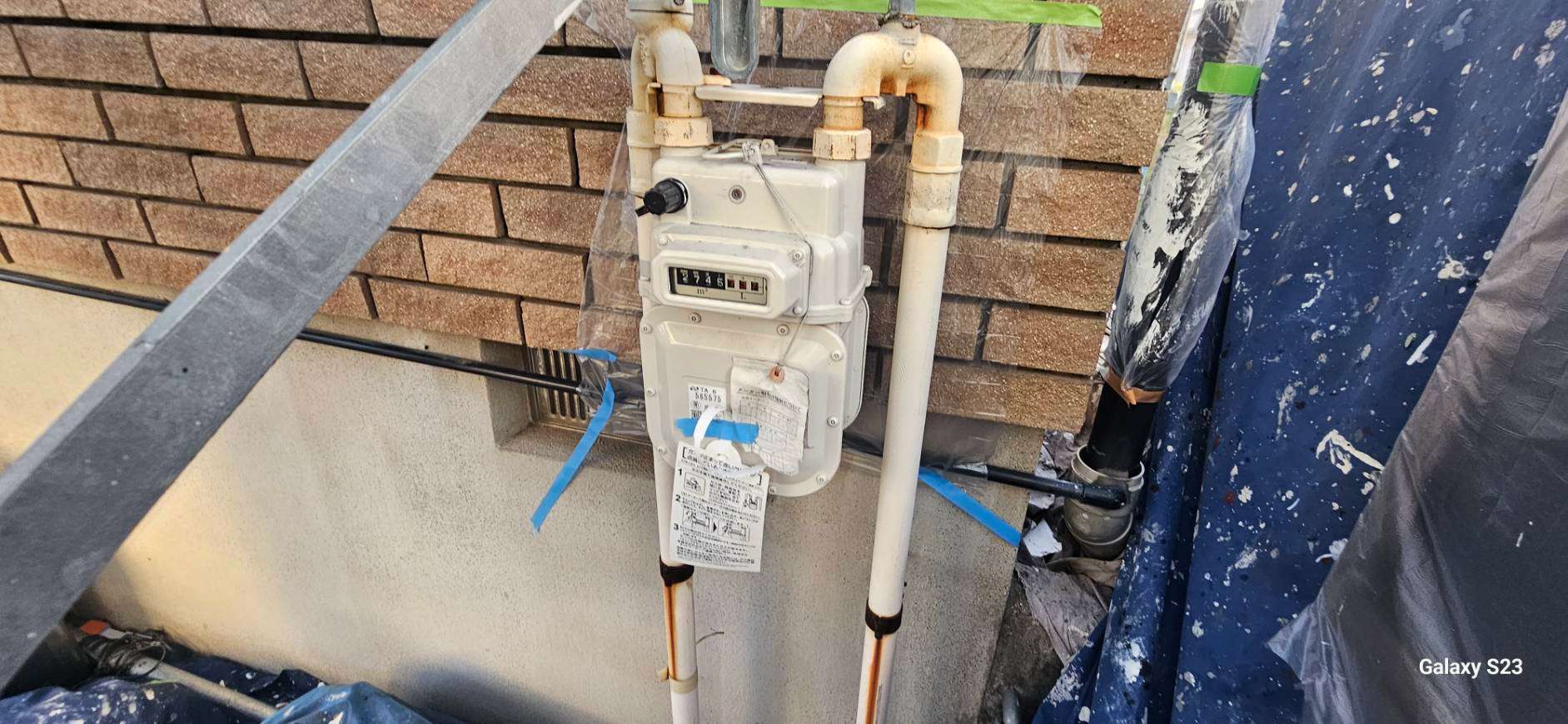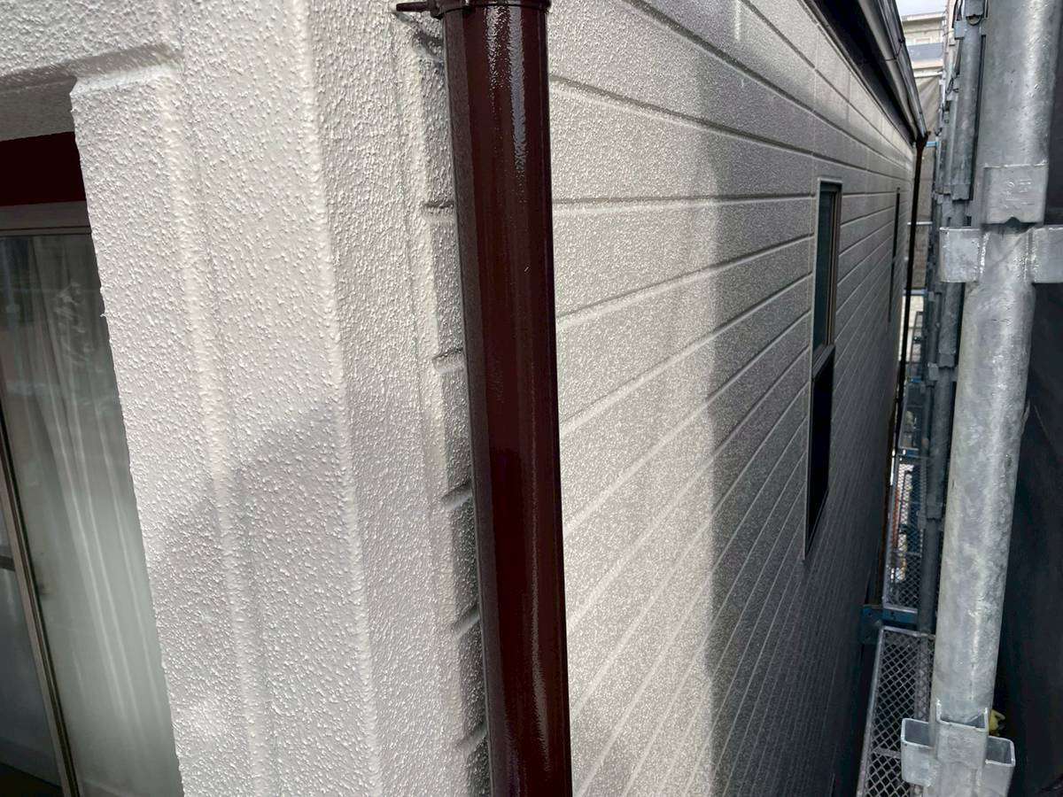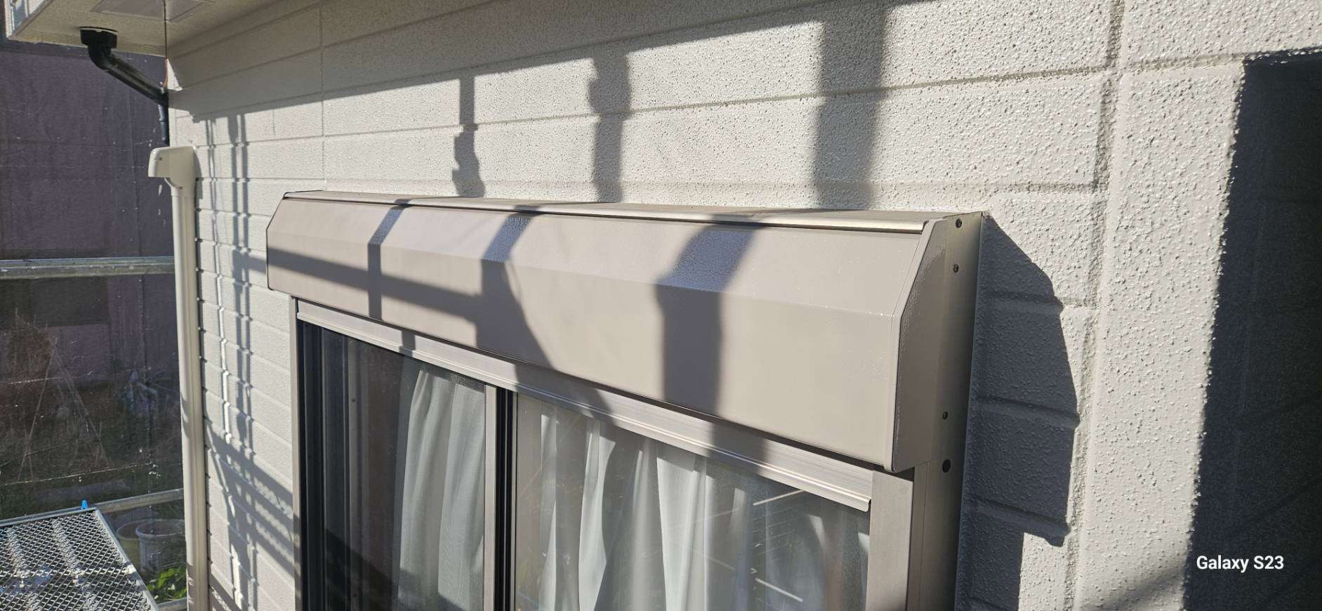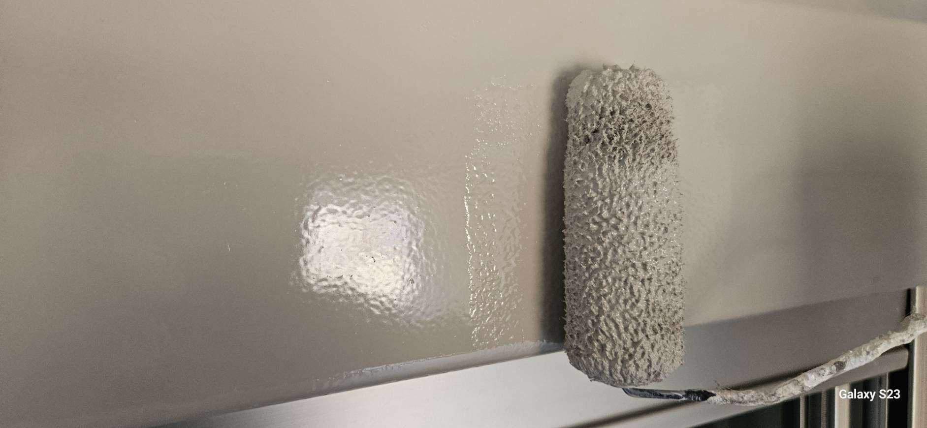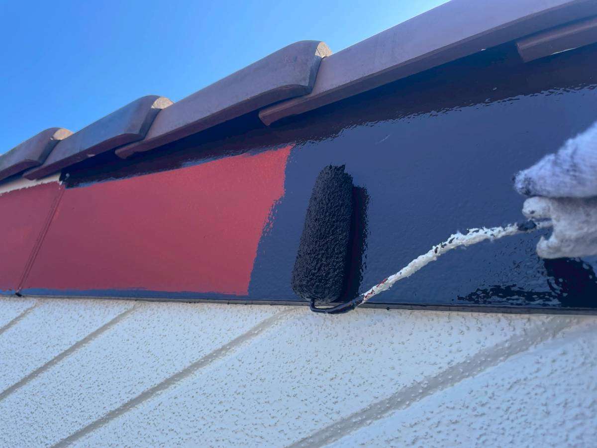 破風板・鼻隠し板・軒樋・縦樋の上塗り1回目塗装、シャッターボックスは、上塗り1回目・2回目塗装、軒天の換気口は下塗り、上塗り1回目・2回目塗装、鉄部ガス管は、下塗り(錆止め)塗装まで進んでいます。