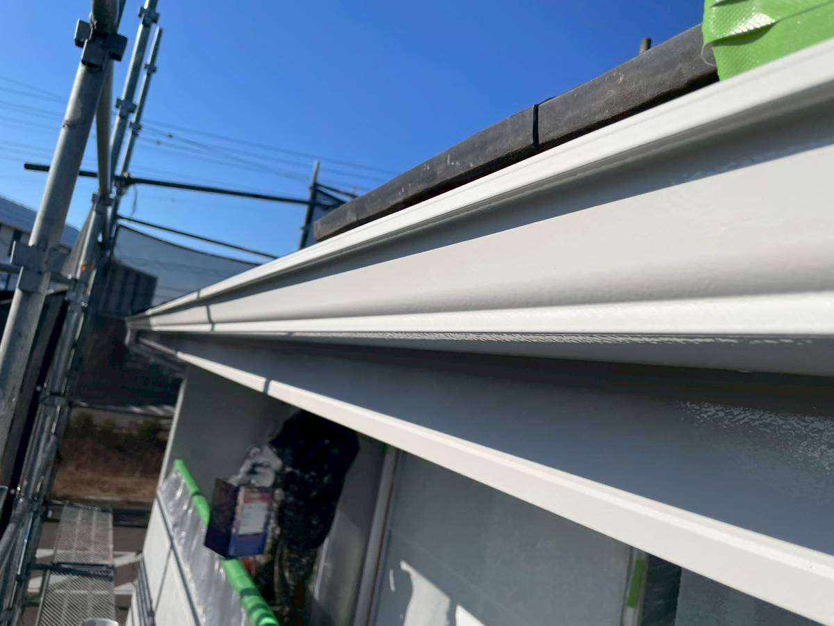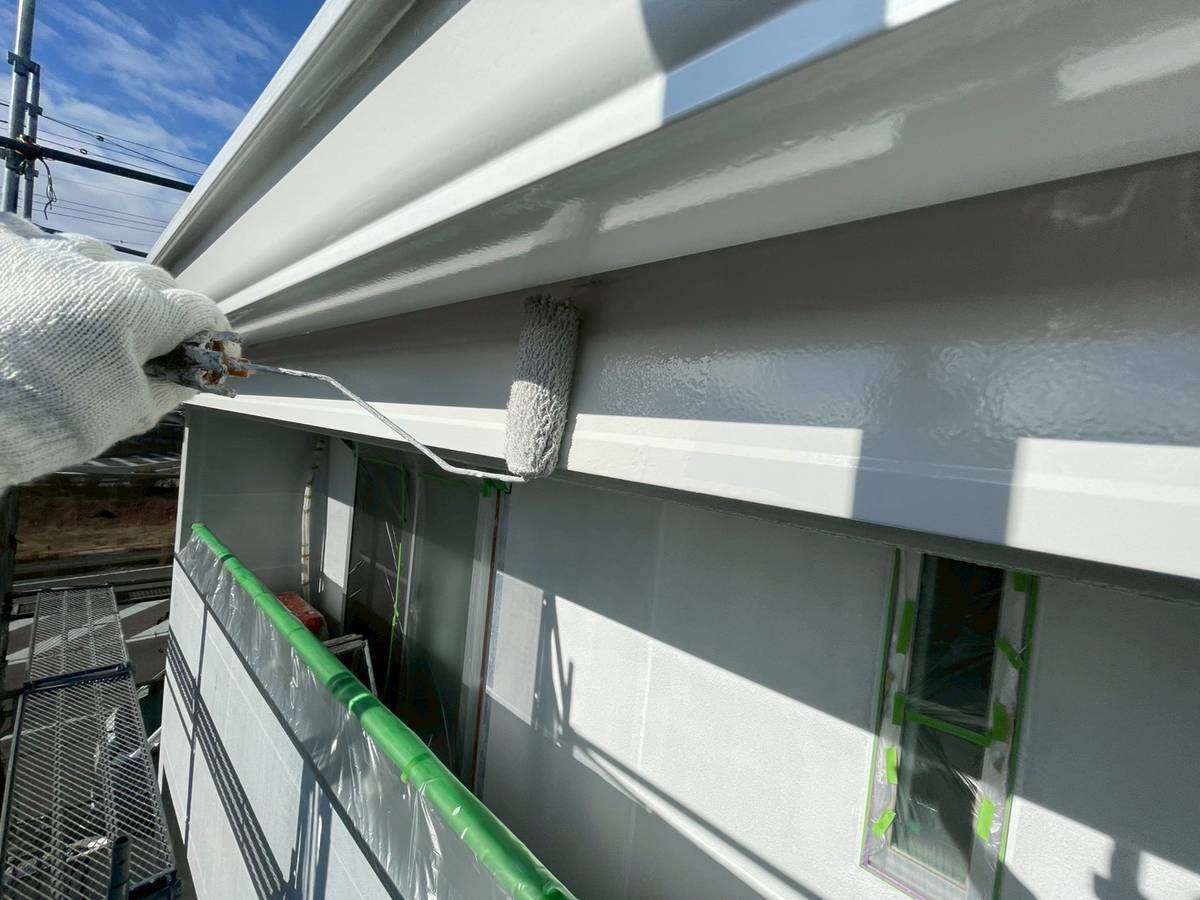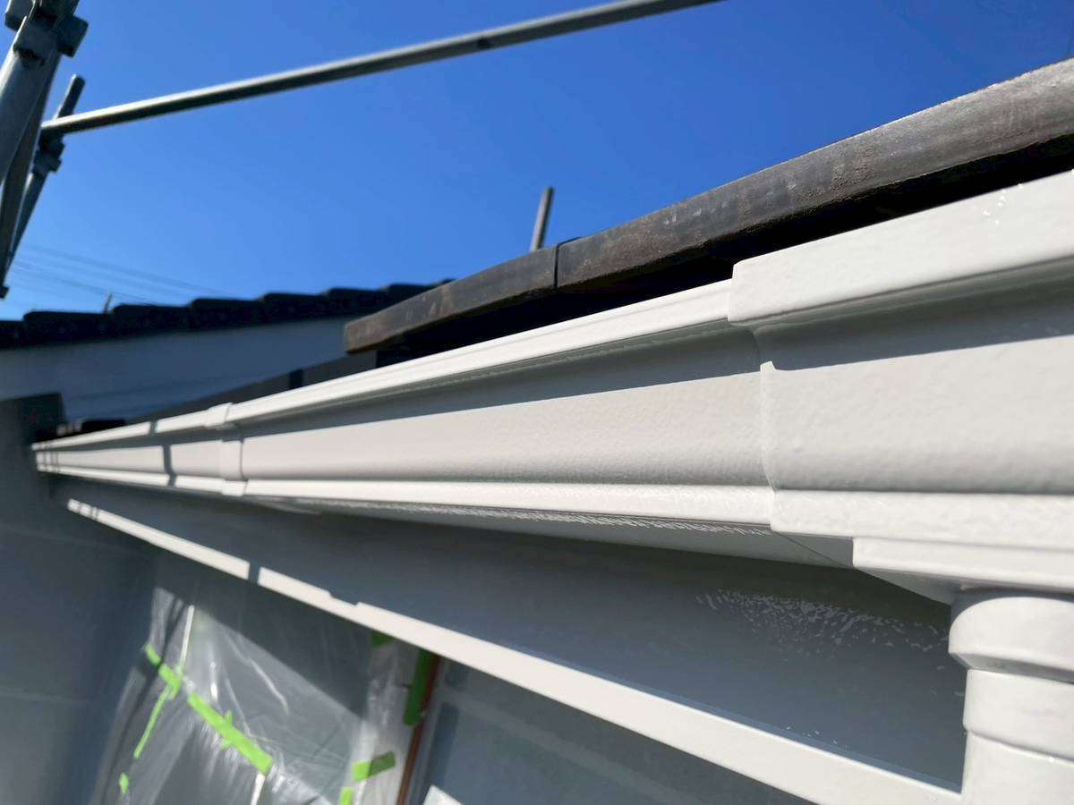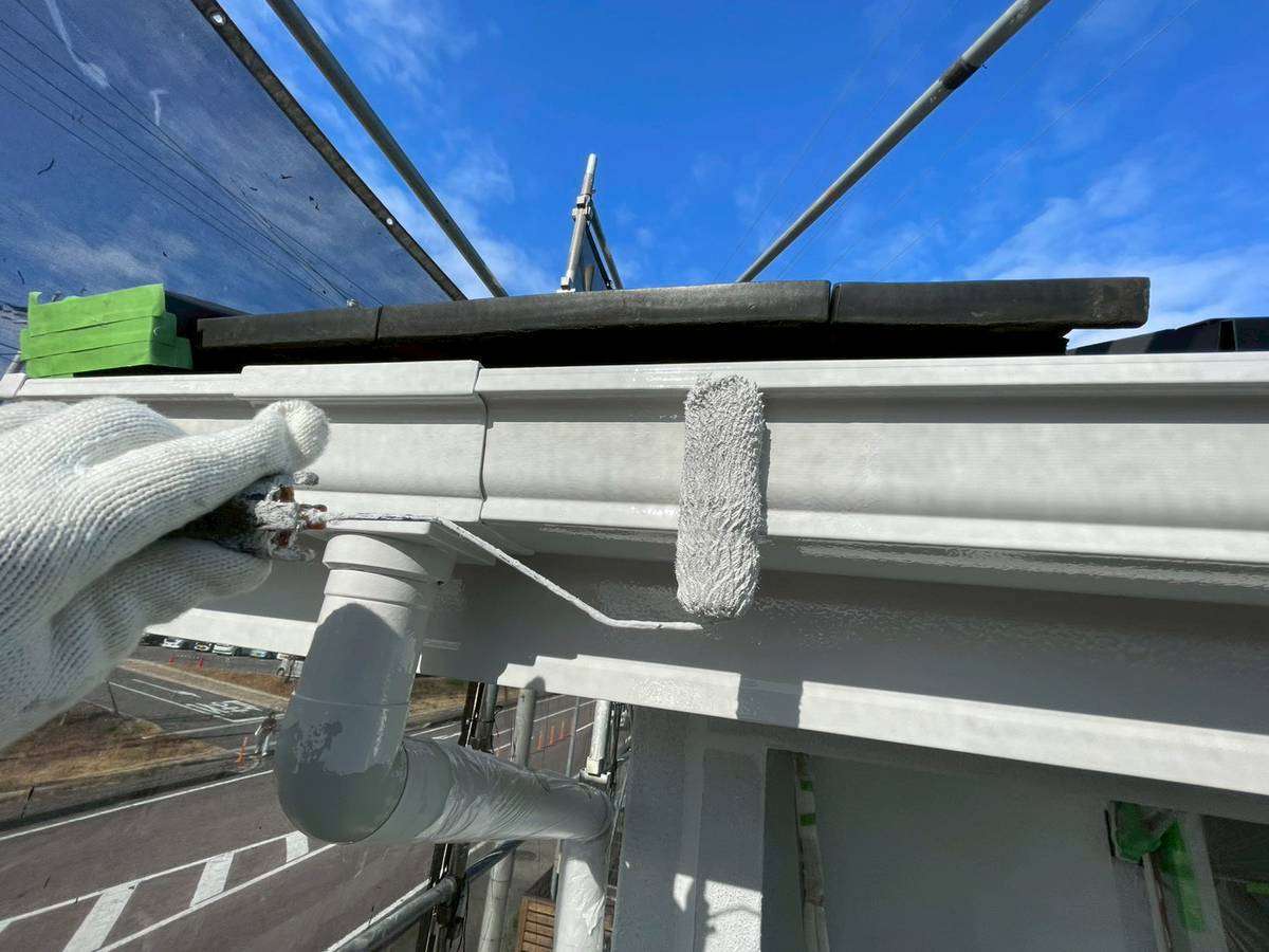 美濃加茂市のE様邸の昨日の作業内容は、外壁の中塗り塗装作業と破風板・鼻隠し板・軒樋の上塗り2回目塗装作業を行っています。