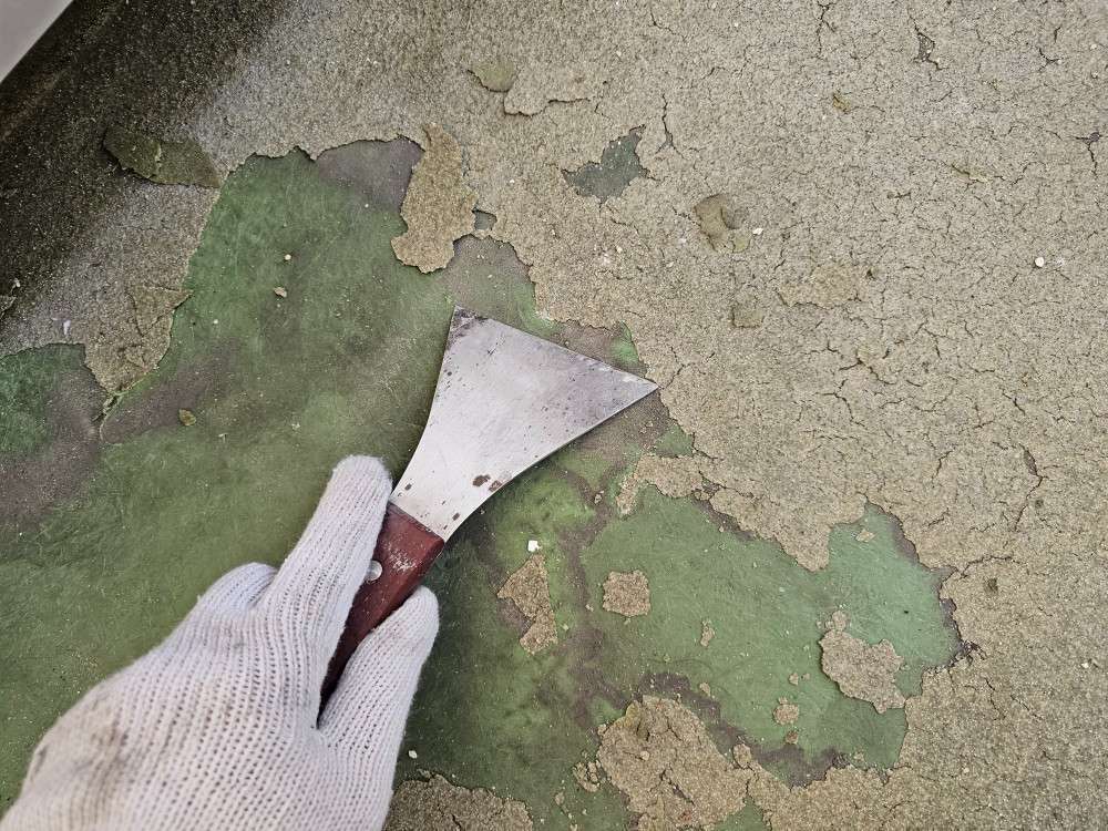 北区のT様邸の昨日の作業は、破風板の上塗り2回目塗装作業、ベランダ防水工事のケレン作業と下地処理作業を行っています。