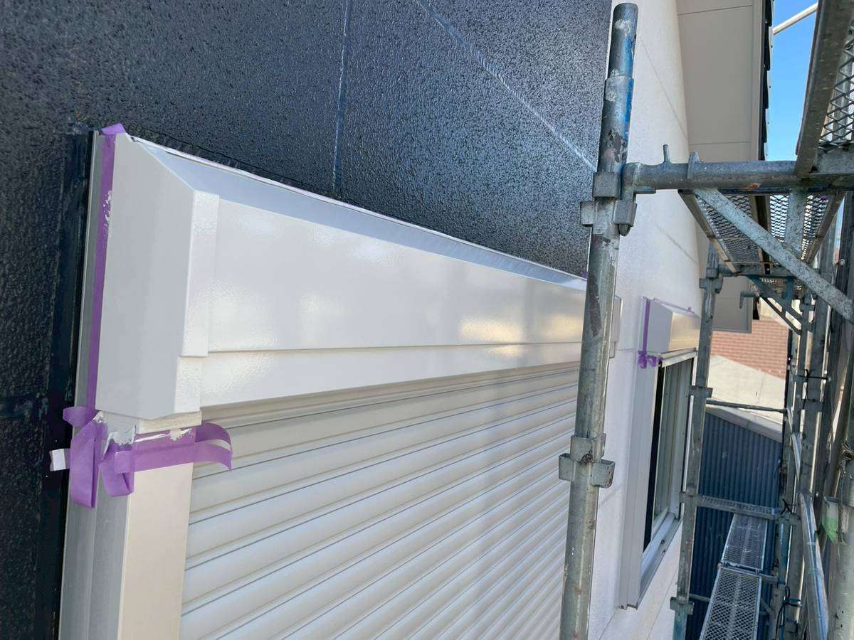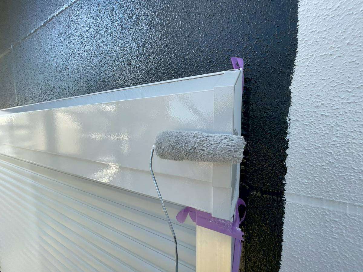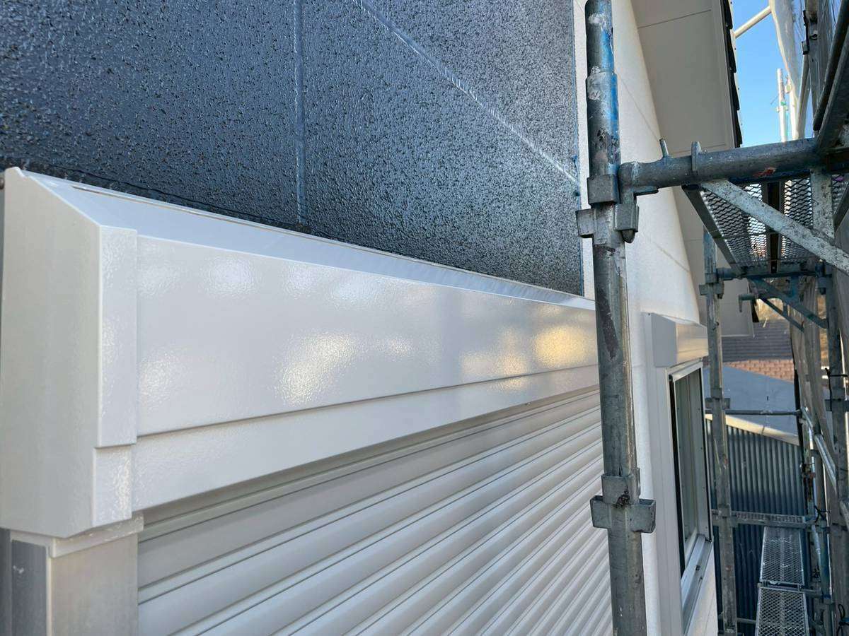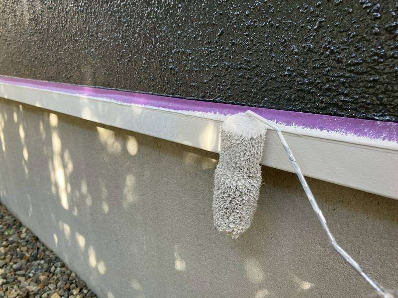 E様邸の昨日の作業は、付帯部塗装作業の土台水切りの下塗りと、水切り・シャッターボックス・庇の上塗り1回目・2回目塗装、塀の下塗り・上塗り1回目塗装作業を行っていました。