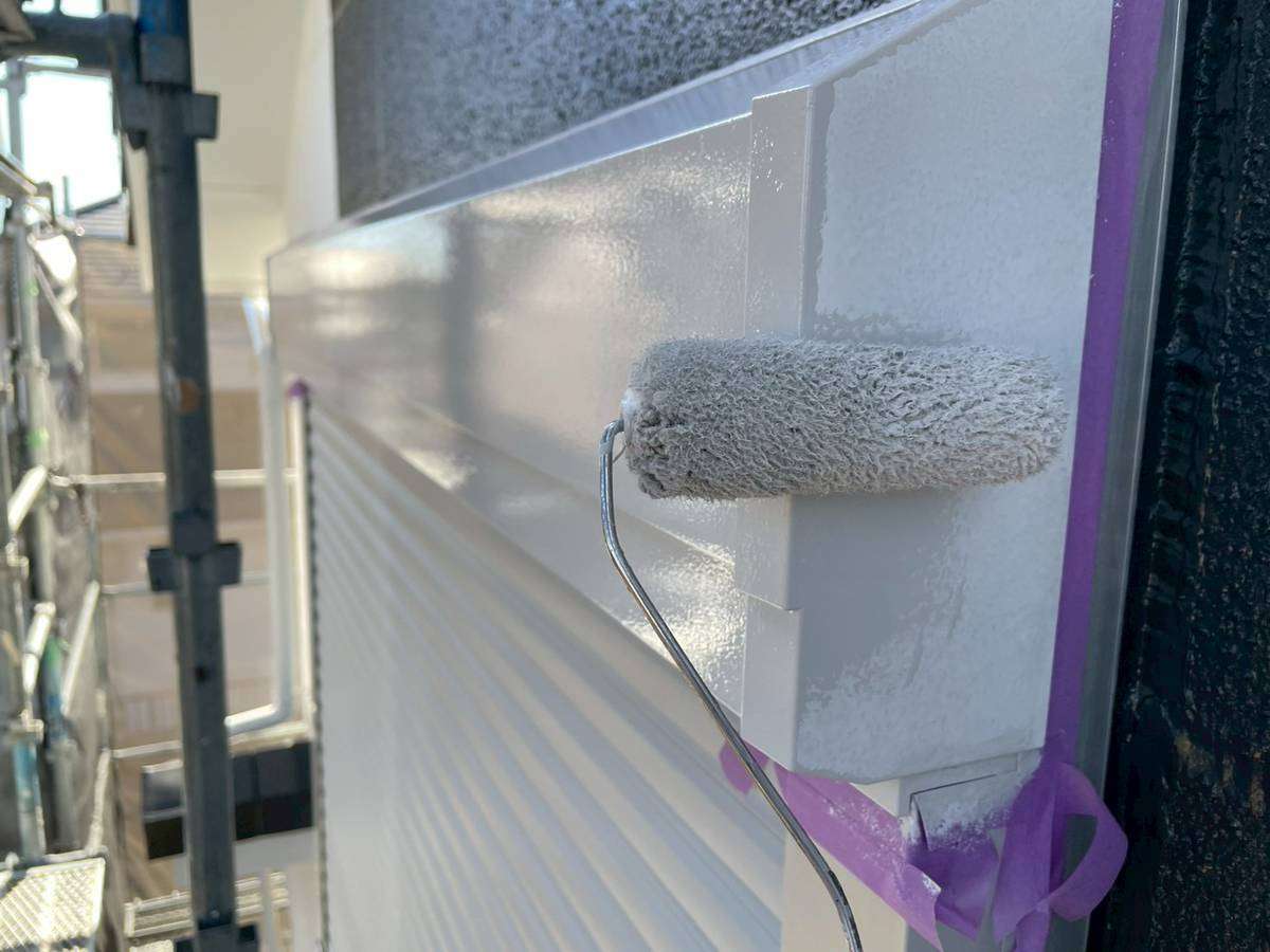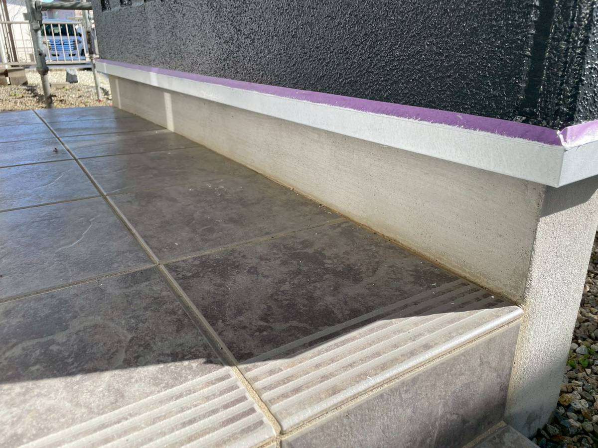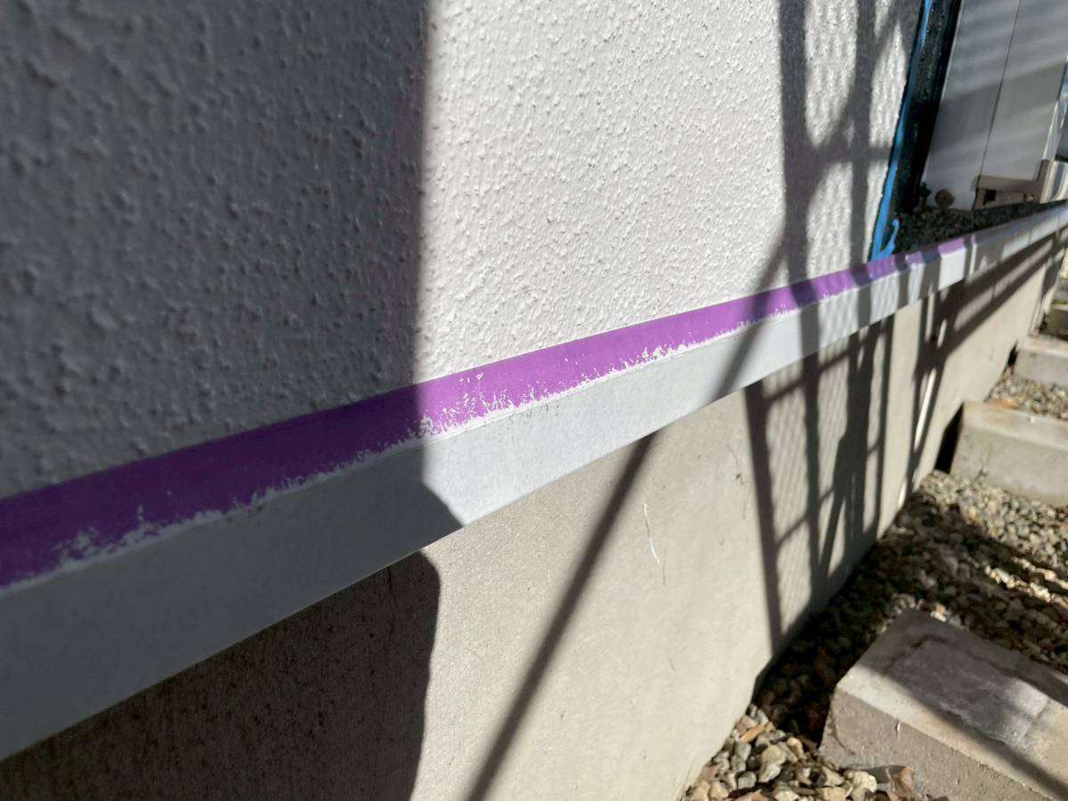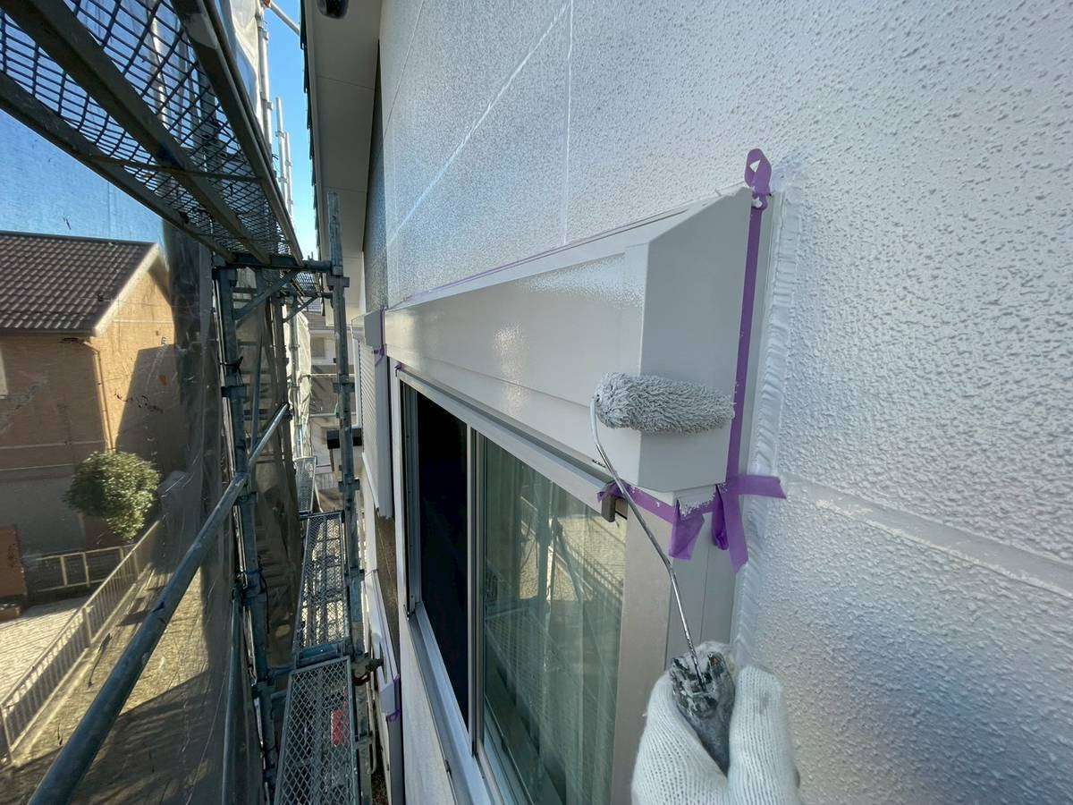 E様邸の昨日の作業は、付帯部塗装作業の土台水切りの下塗りと、水切り・シャッターボックス・庇の上塗り1回目・2回目塗装、塀の下塗り・上塗り1回目塗装作業を行っていました。