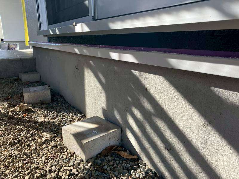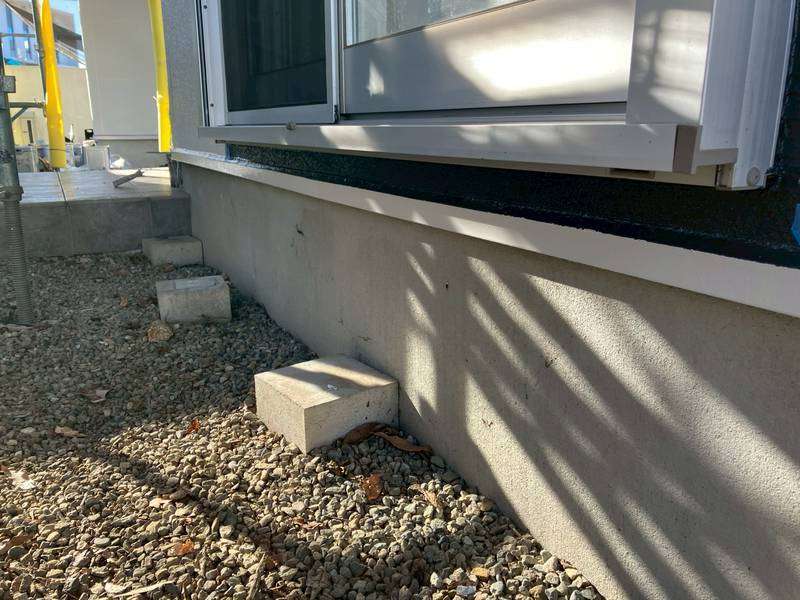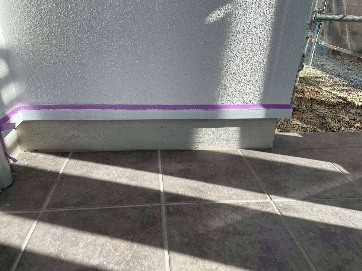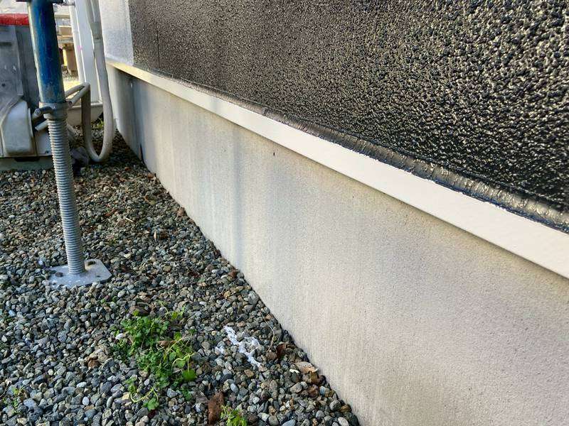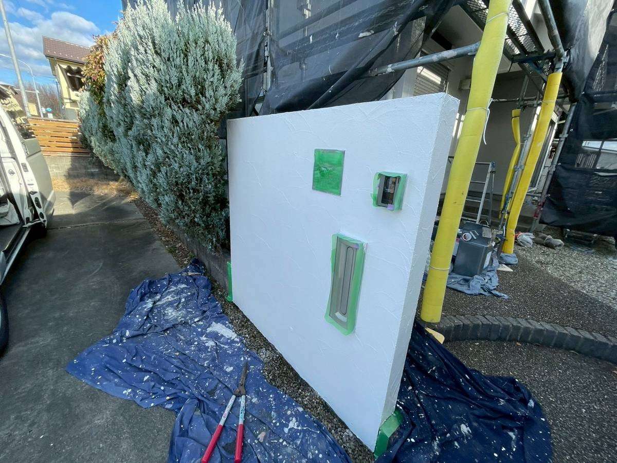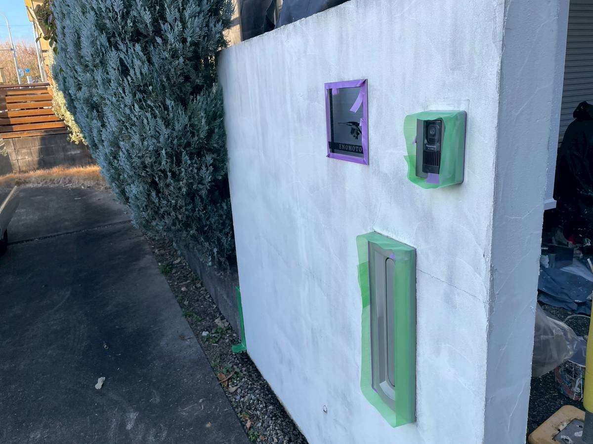E様邸の昨日の作業は、付帯部塗装作業の土台水切りの下塗りと、水切り・シャッターボックス・庇の上塗り1回目・2回目塗装、塀の下塗り・上塗り1回目塗装作業を行っていました。