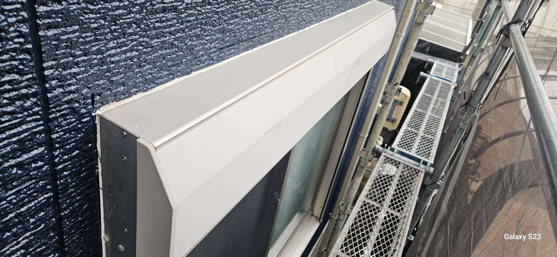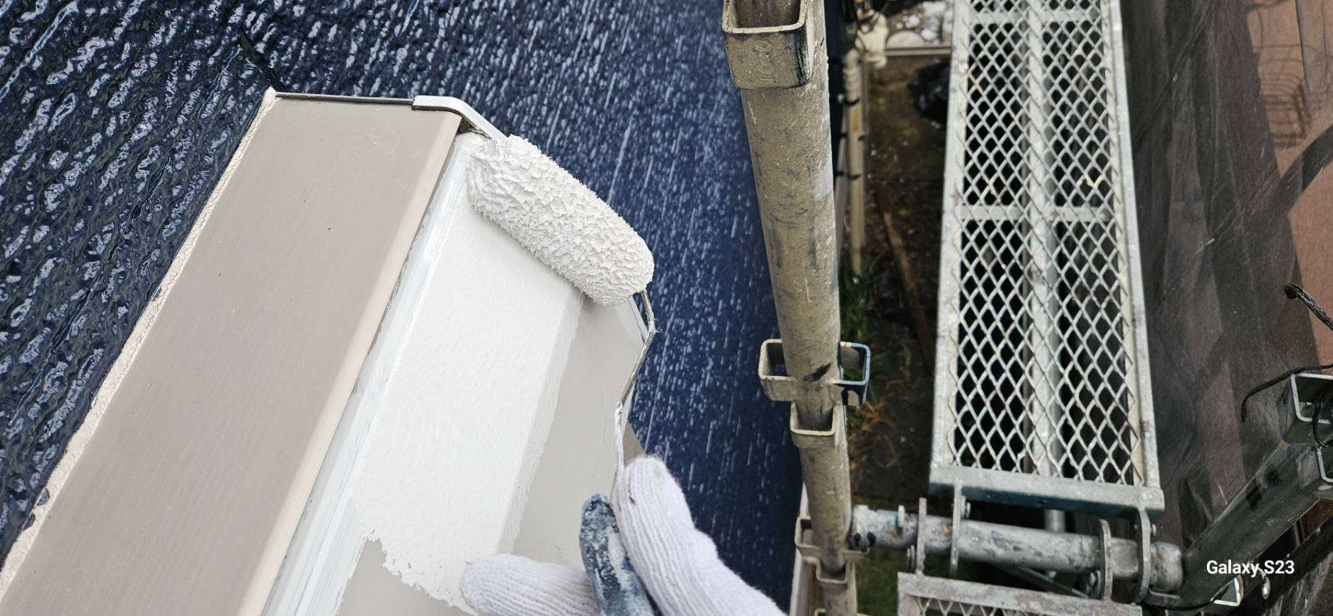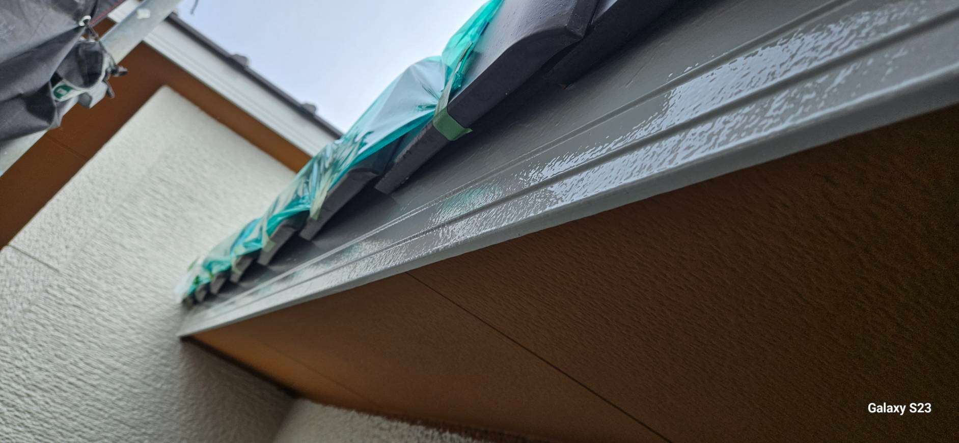 大垣市のI様邸の昨日の作業は、破風板・鼻隠し板の上塗り1回目塗装、付帯部(シャッターボックス・水切り・フード)の下塗り(サビ止め)塗装作業を行っています。