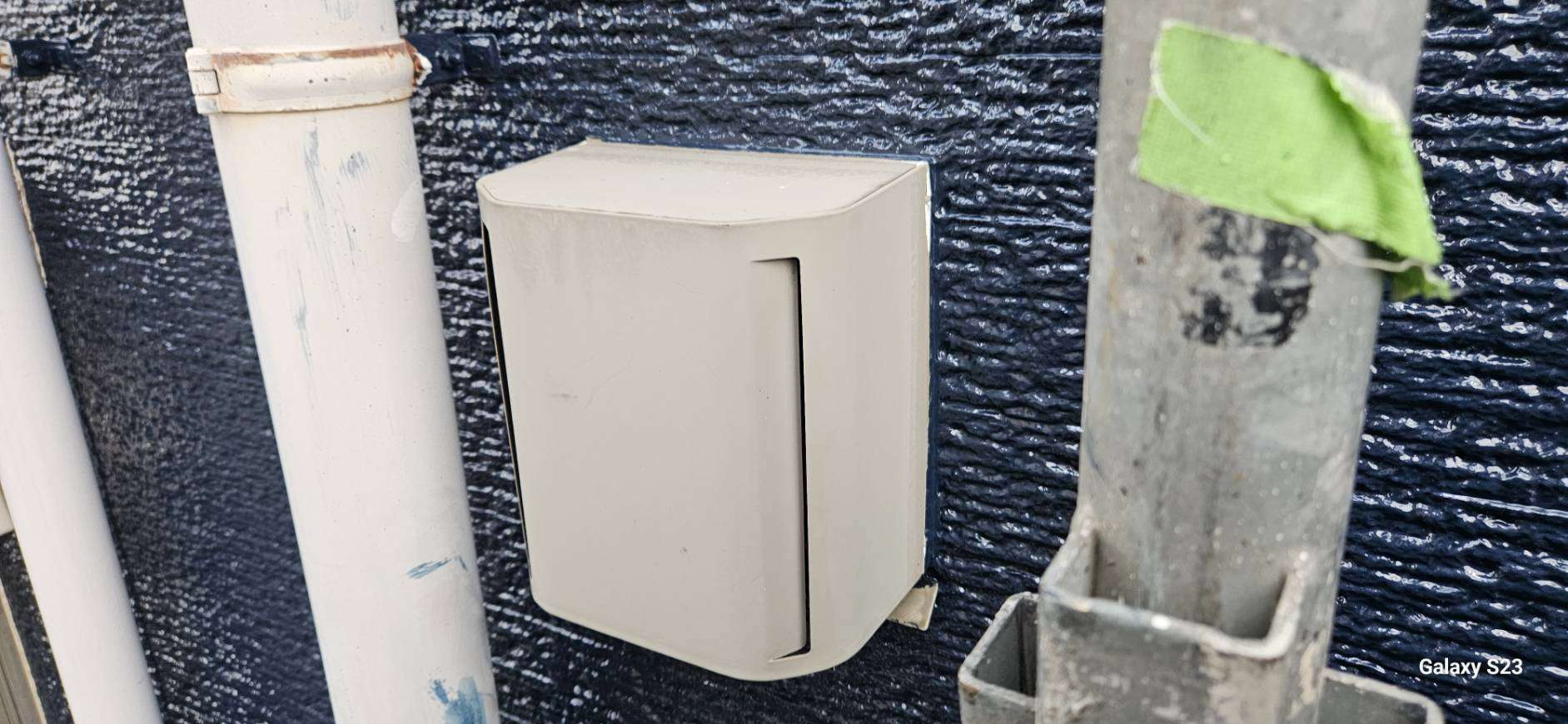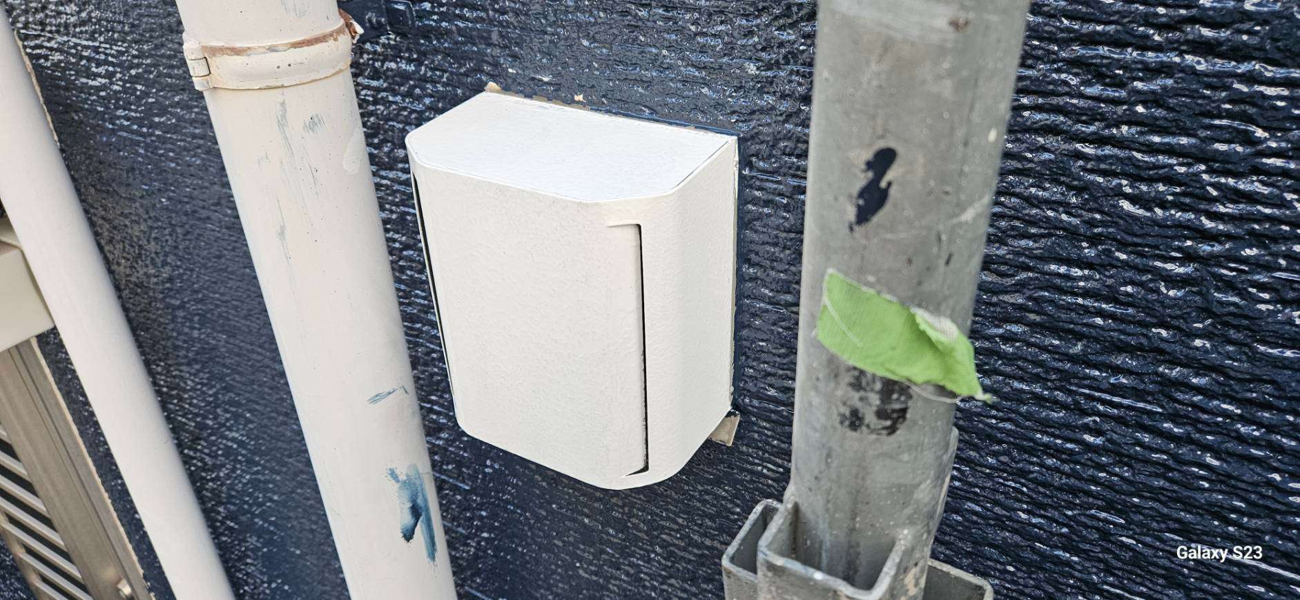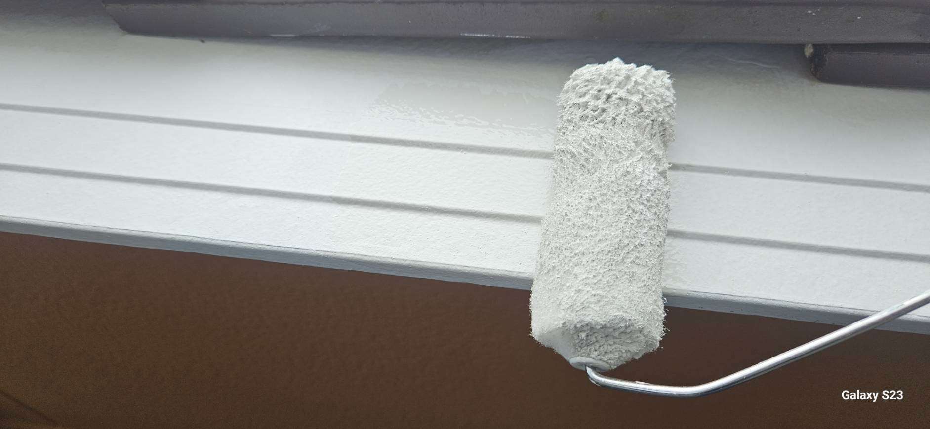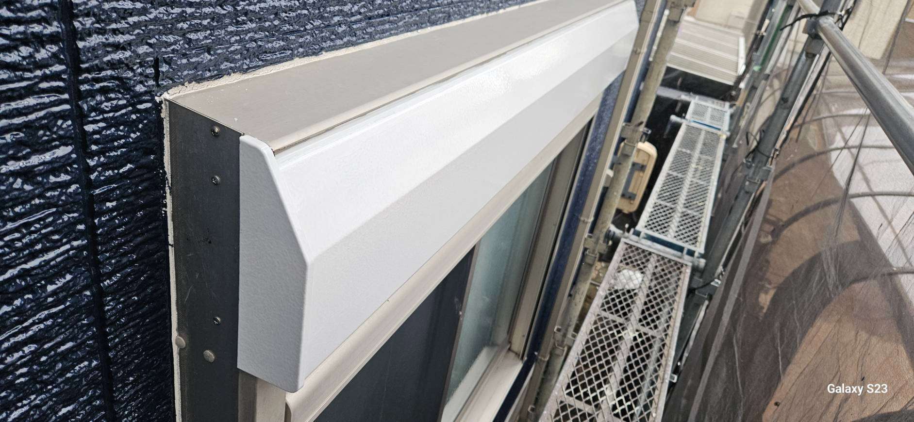 大垣市のI様邸の昨日の作業は、破風板・鼻隠し板の上塗り1回目塗装、付帯部(シャッターボックス・水切り・フード)の下塗り(サビ止め)塗装作業を行っています。