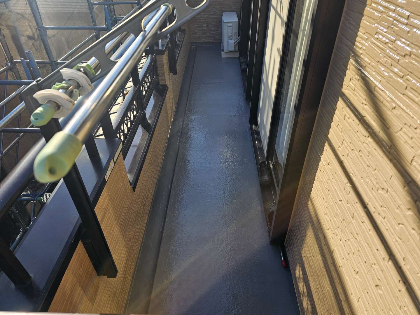 北区A様邸の昨日の作業は、ベランダウレタン2回目塗装作業と塗装部分の点検作業を行っています。
