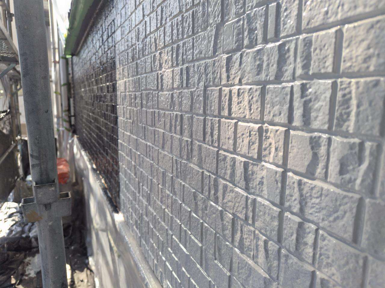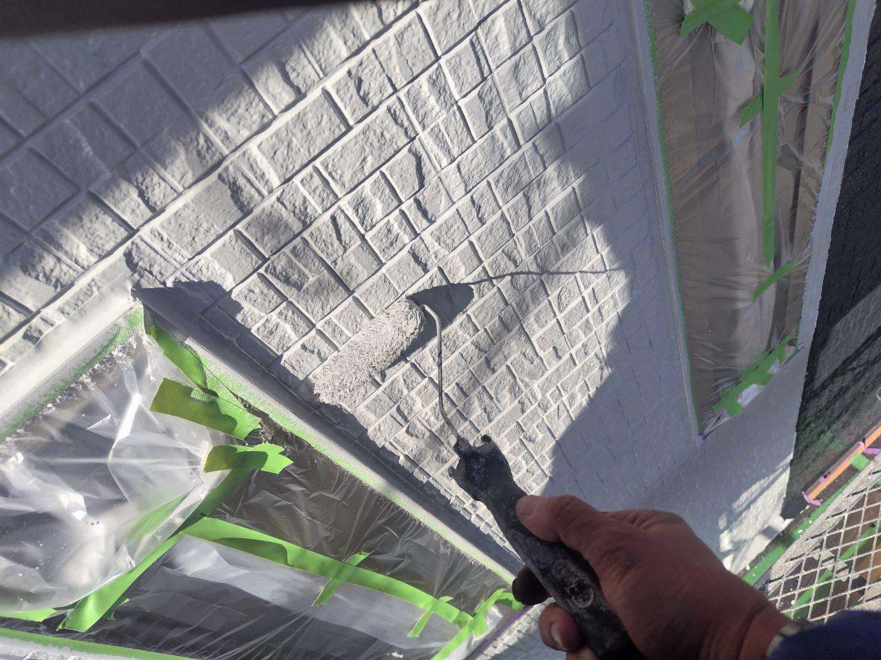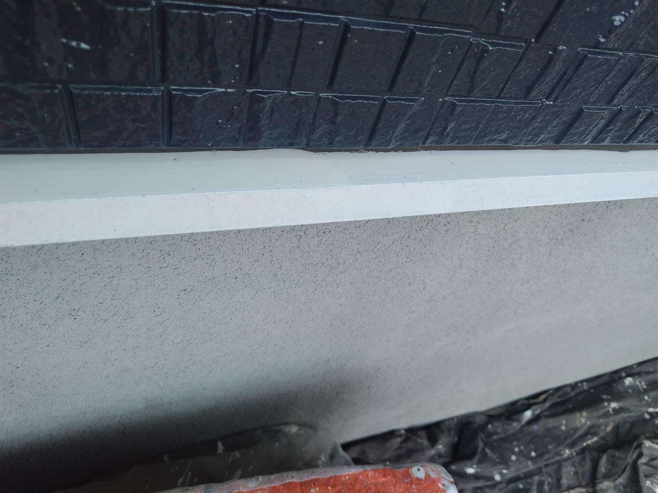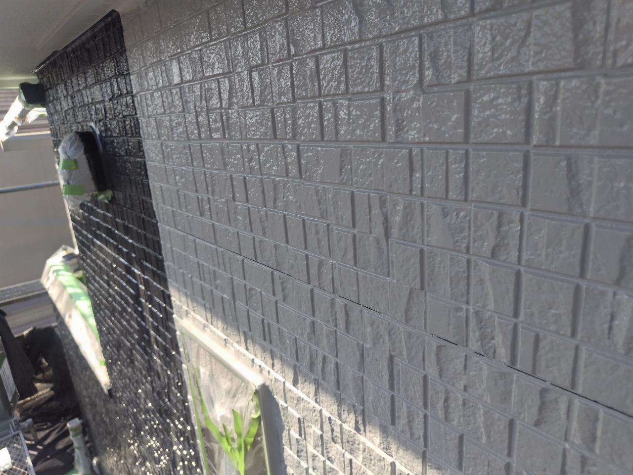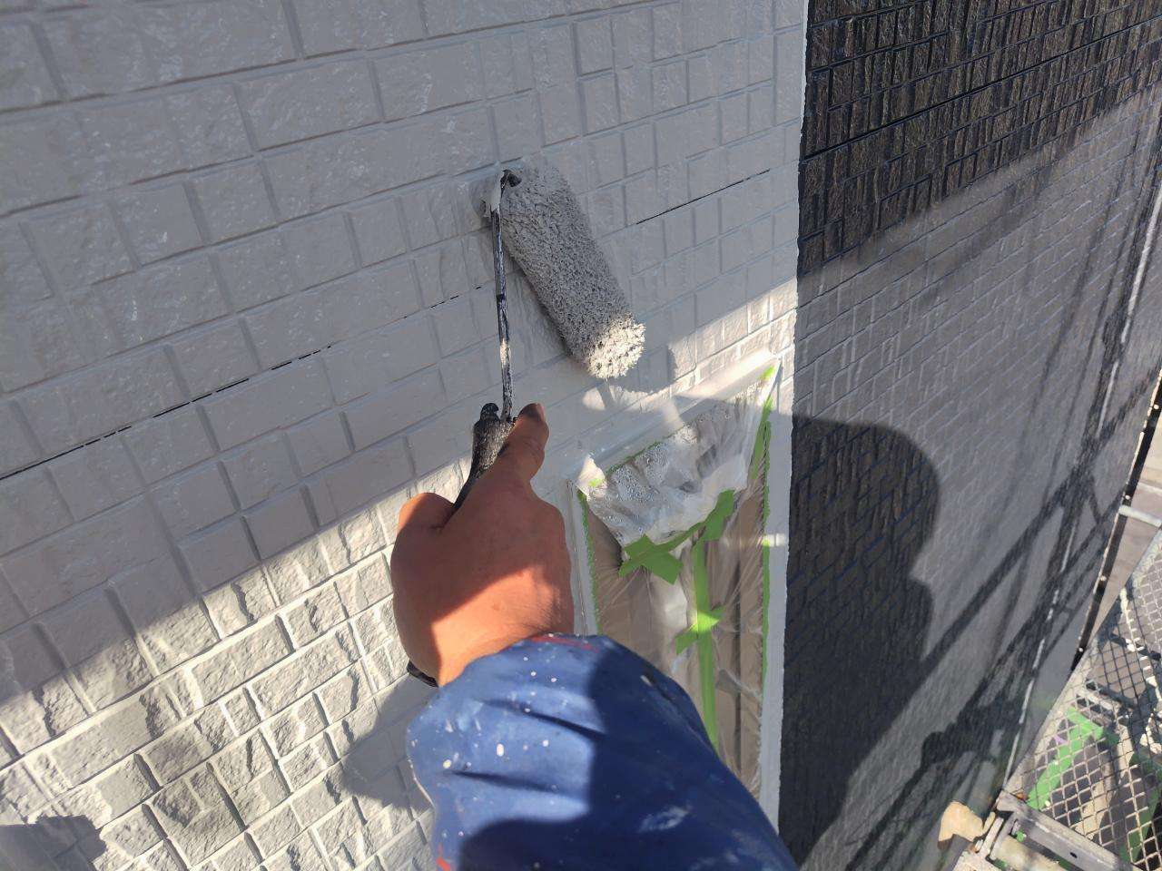 K様邸の昨日の作業は、外壁の上塗り塗装、付帯部塗装の破風板・水切りの下塗り塗装、下屋根の下塗り塗装作業を行いました。