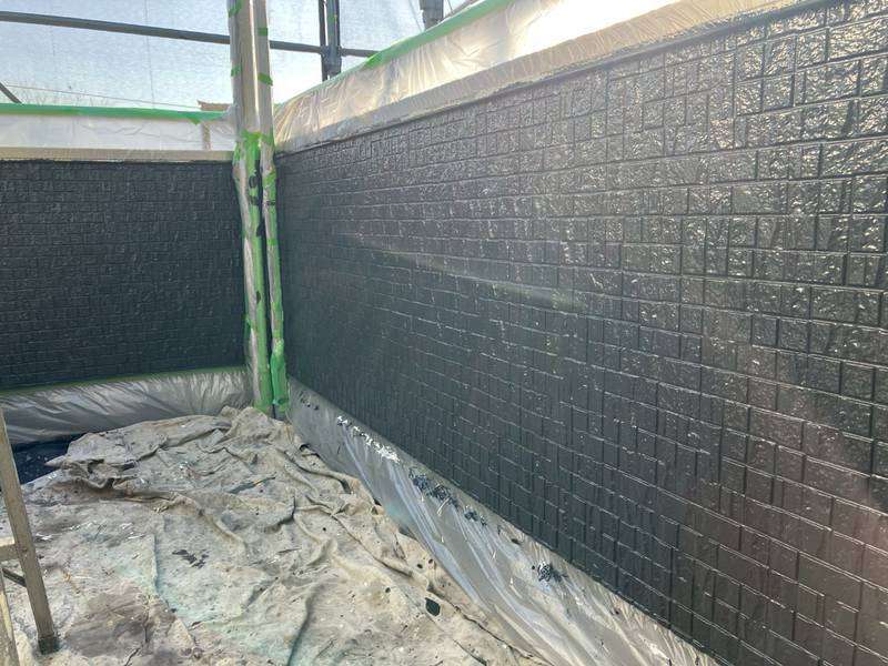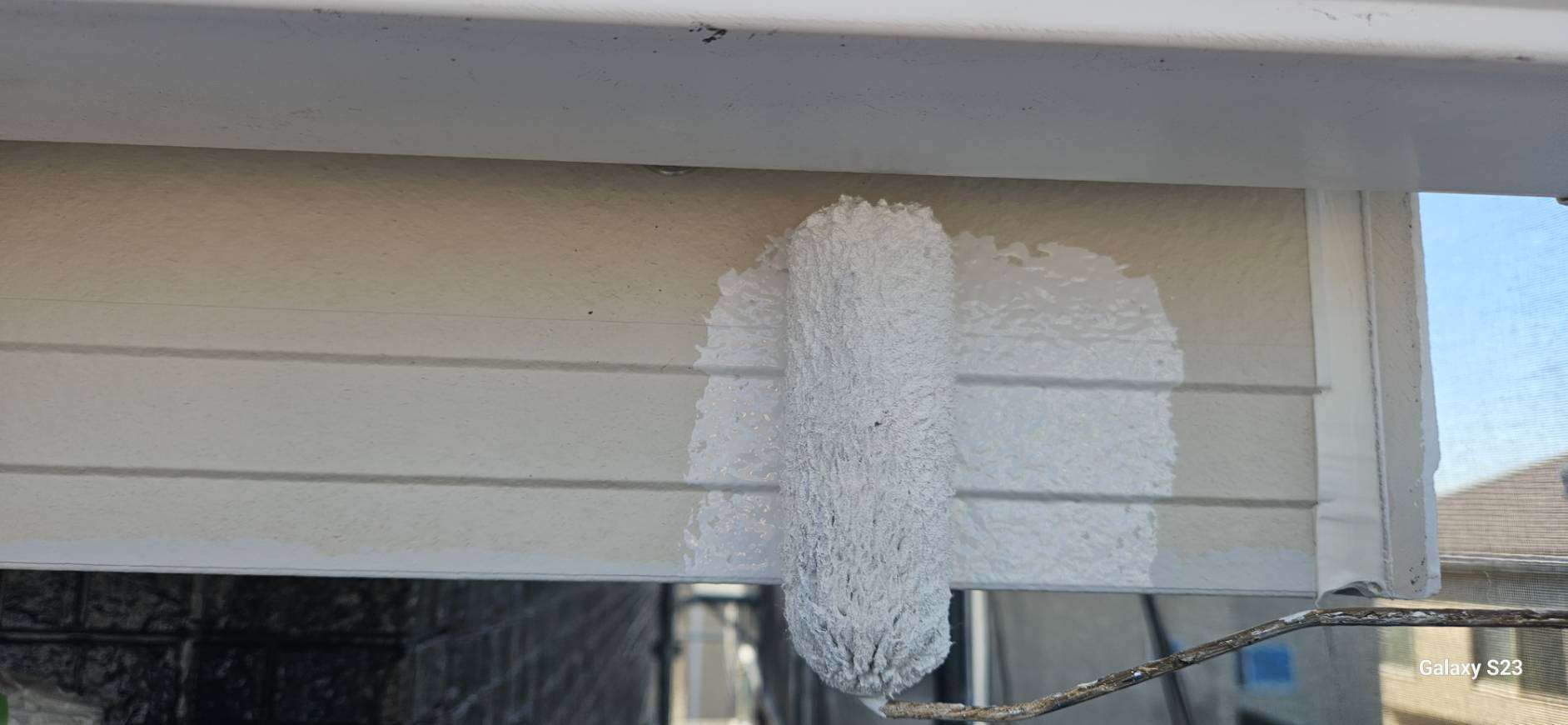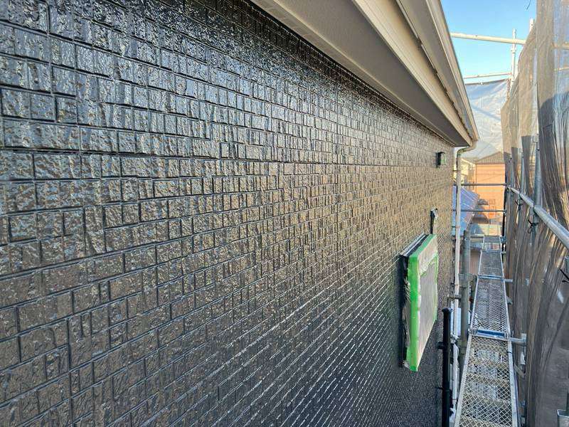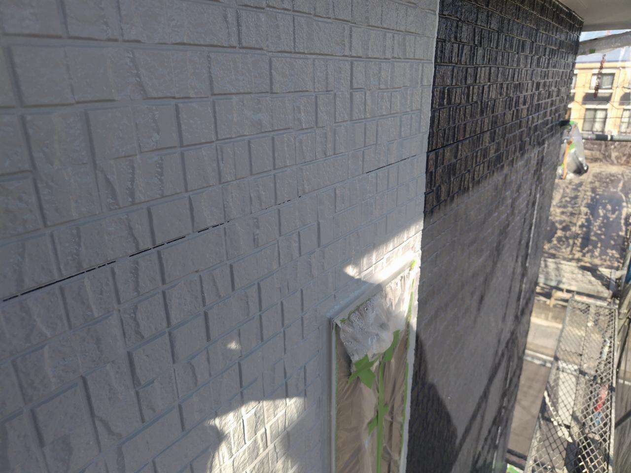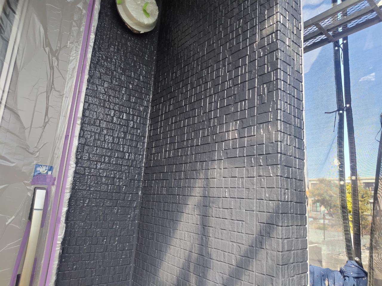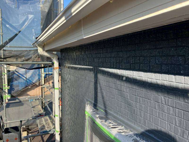K様邸の昨日の作業は、外壁の上塗り塗装、付帯部塗装の破風板・水切りの下塗り塗装、下屋根の下塗り塗装作業を行いました。