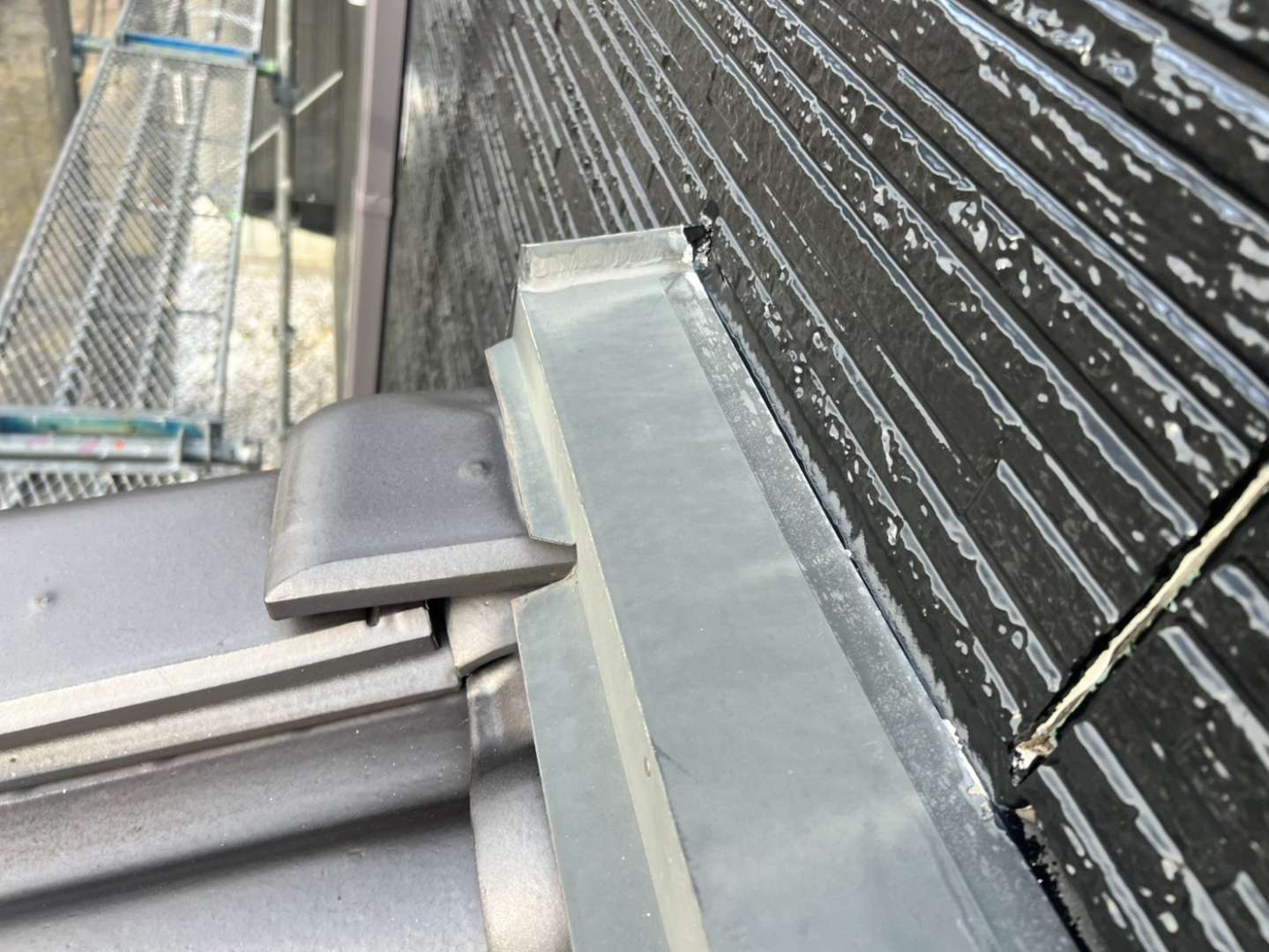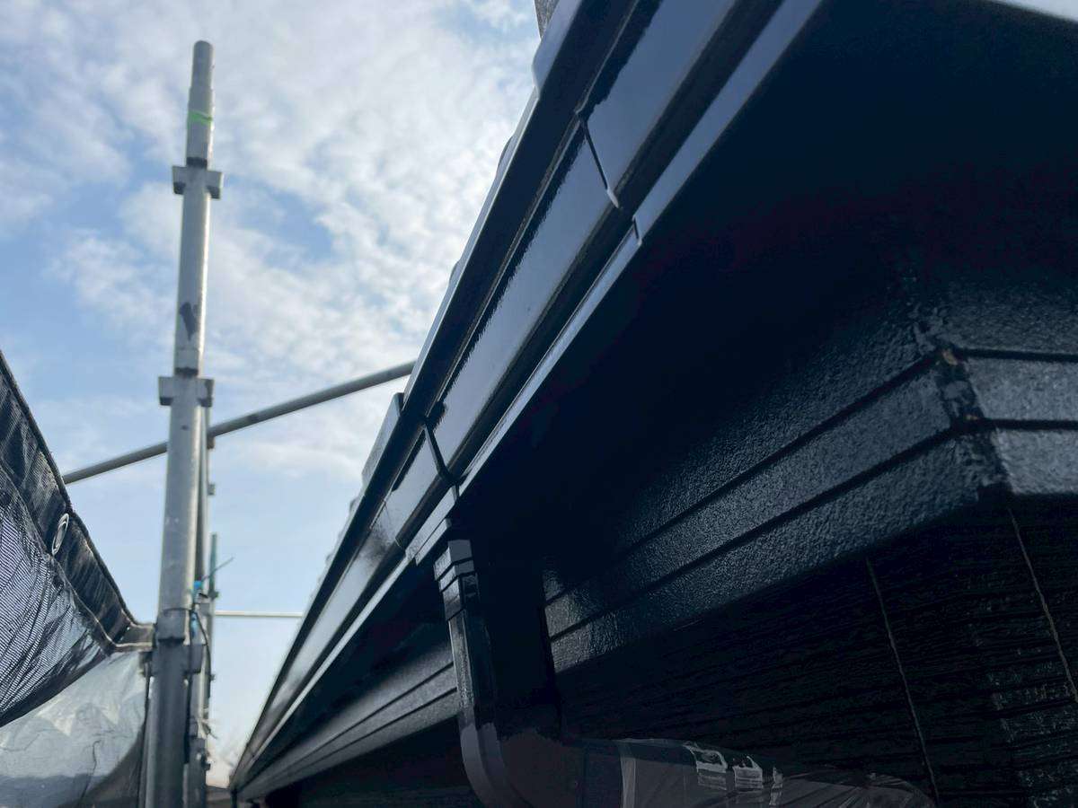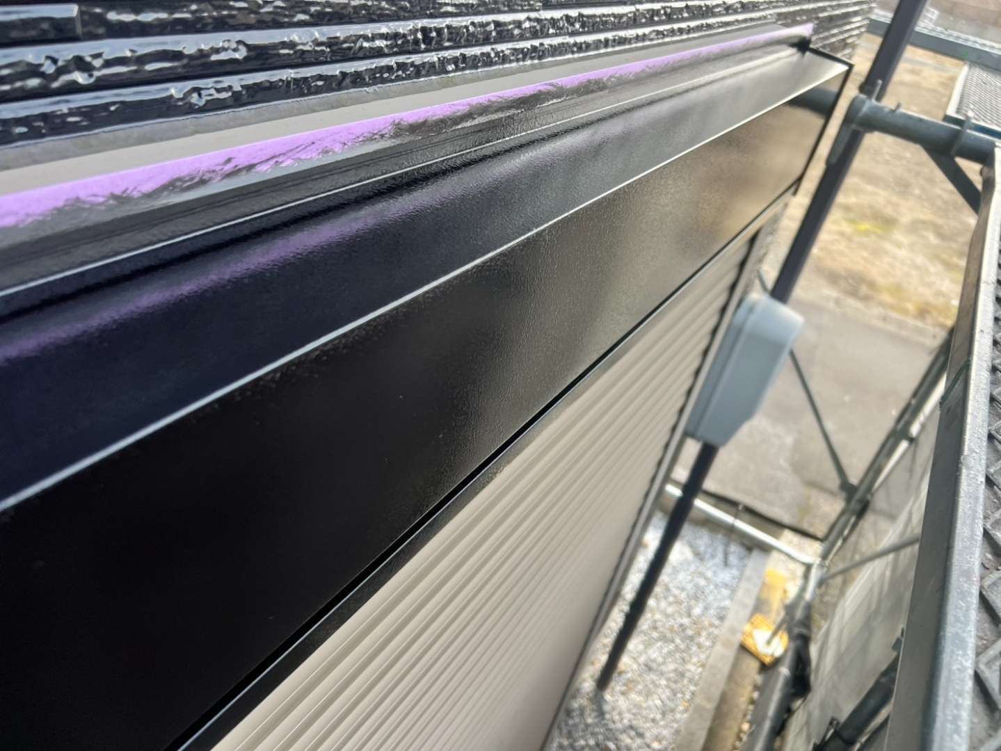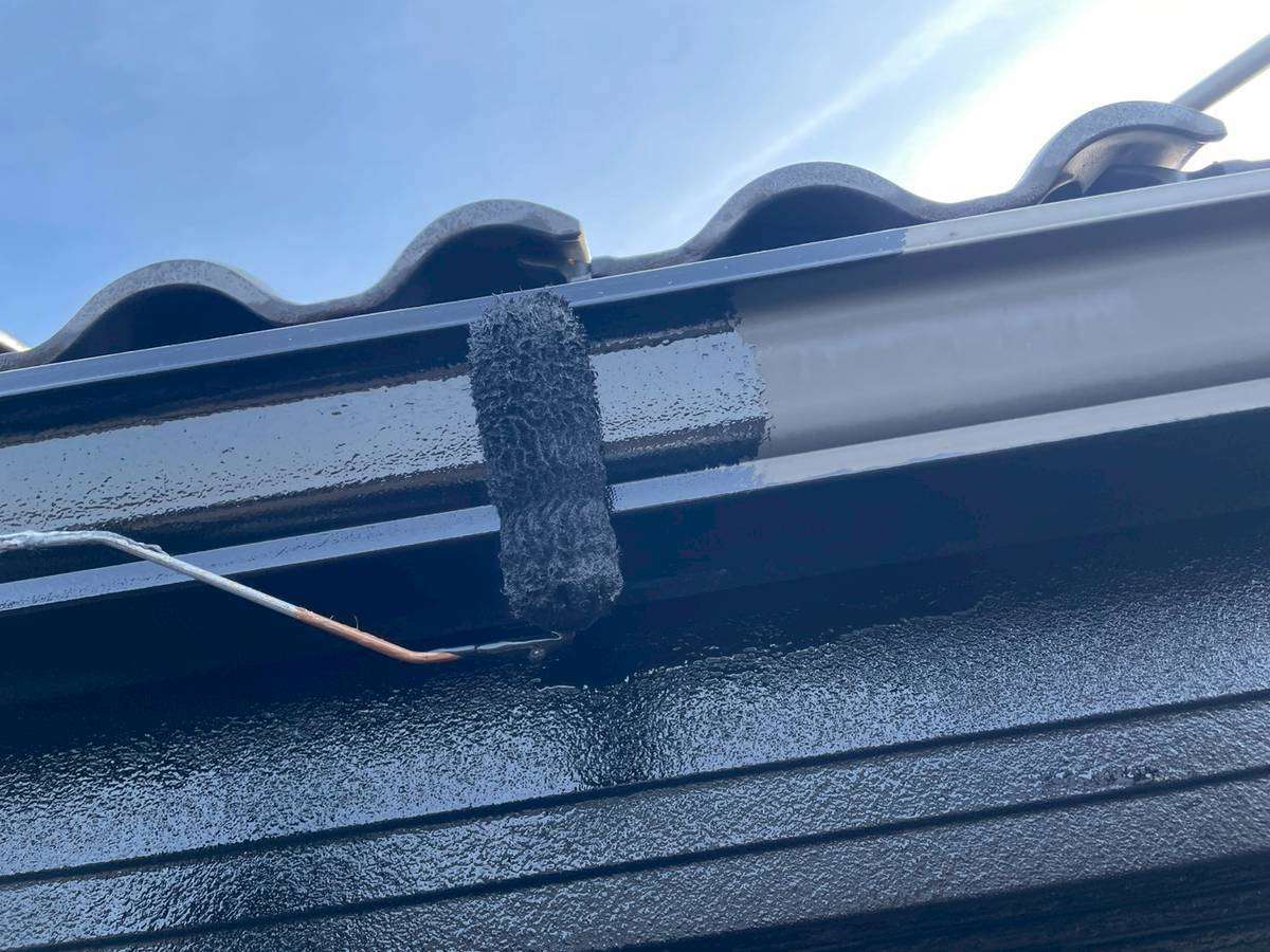 I様邸の昨日の作業は、付帯部塗装のシャッターボックス・壁取り合い水切りの下塗り(さび止め)と破風板・鼻隠し板・軒樋の上塗り1回目・2回目塗装を行っていました。