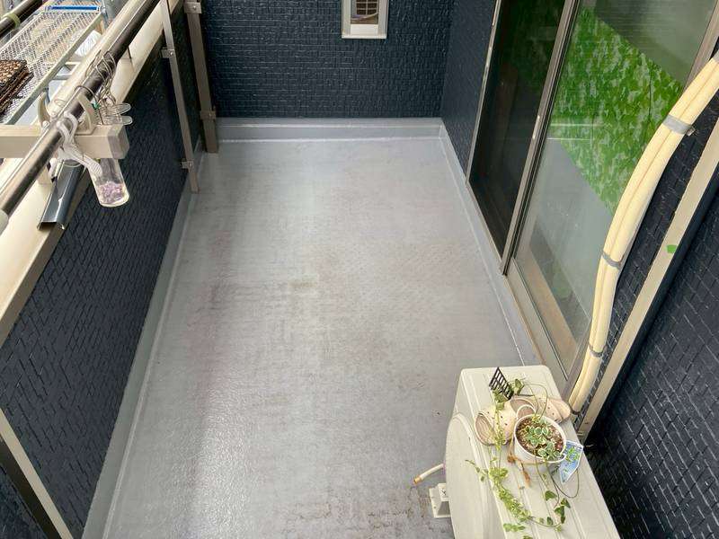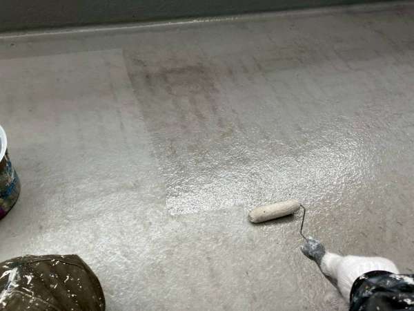 清須市のK様邸の昨日の作業は、塗装部分が完了し、取り外したエアコン配管カバーやポリカ板の取り付けとベランダトップコート塗装のプライマー塗装作業を行っています。
