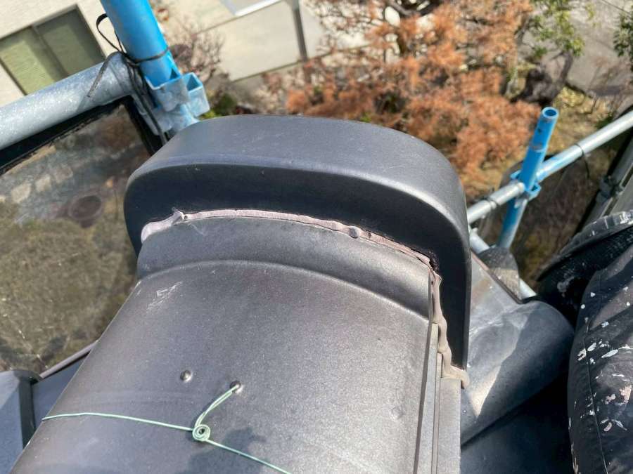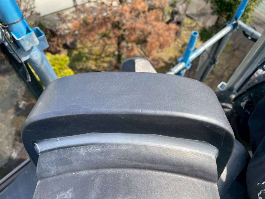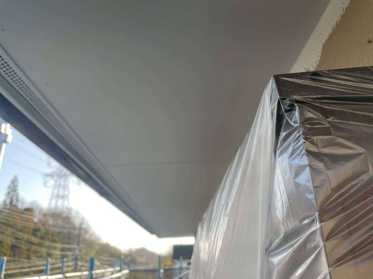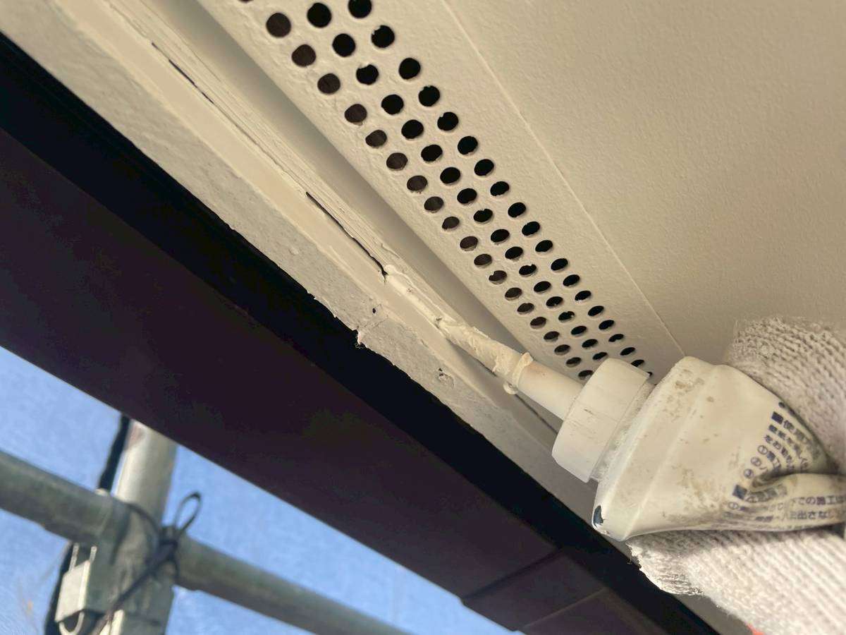 春日井市のN様邸の昨日の作業内容は、屋根漆喰鬼瓦部のラバーコーキングと、下屋根の養生、軒天部の補修と上塗り1回目塗装作業を行っています。