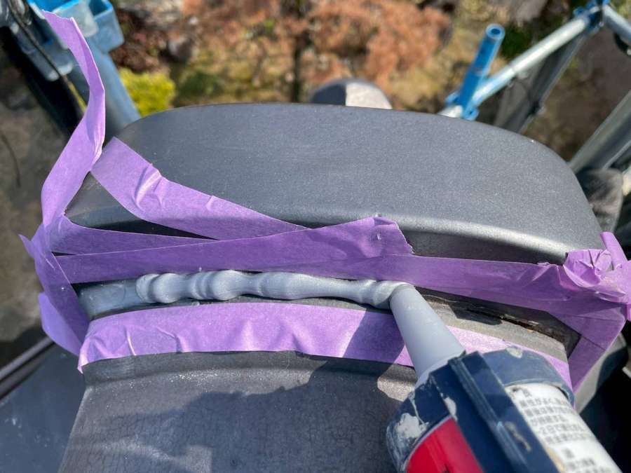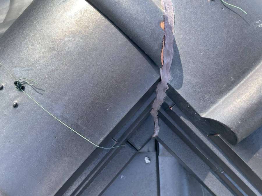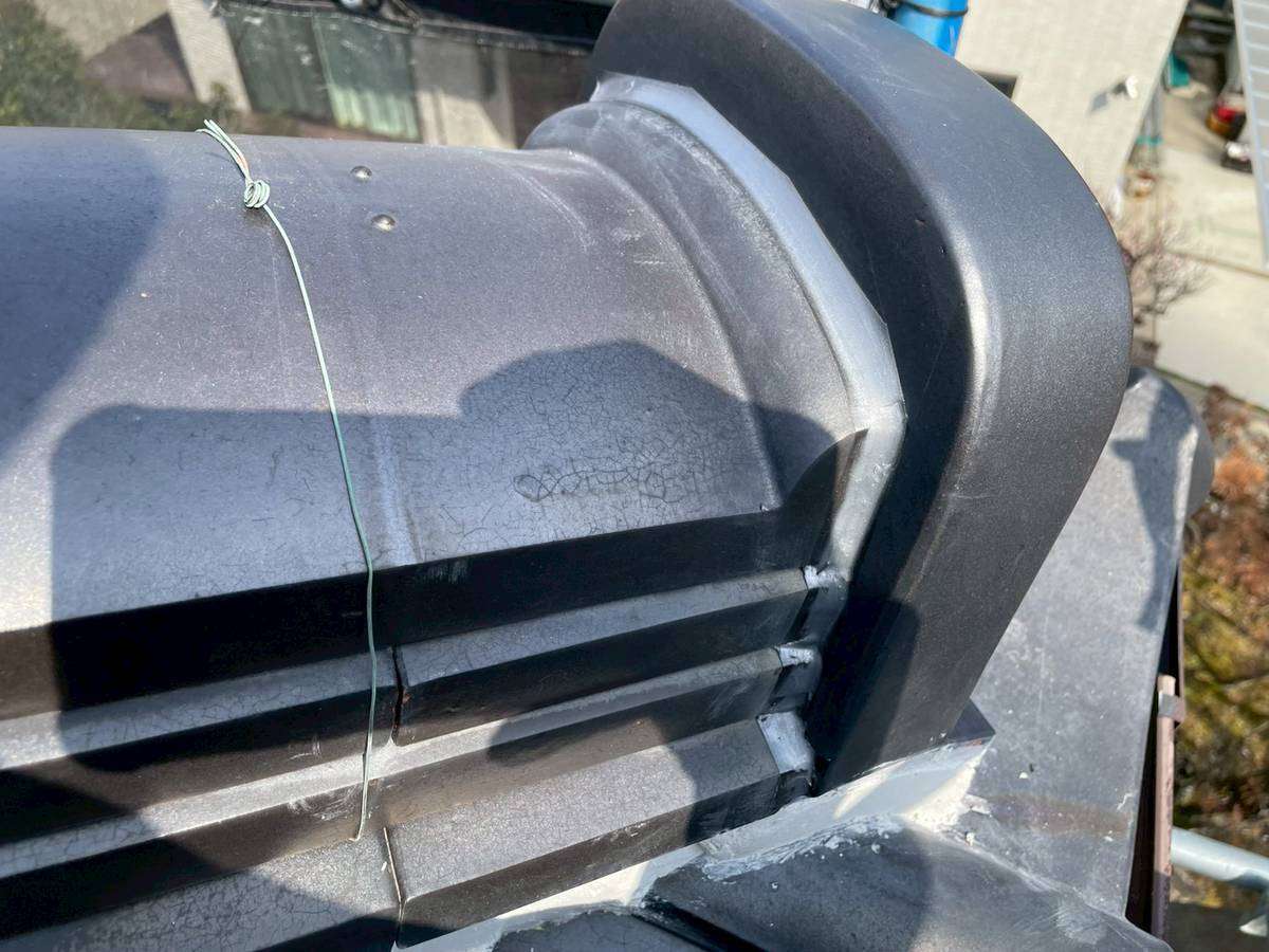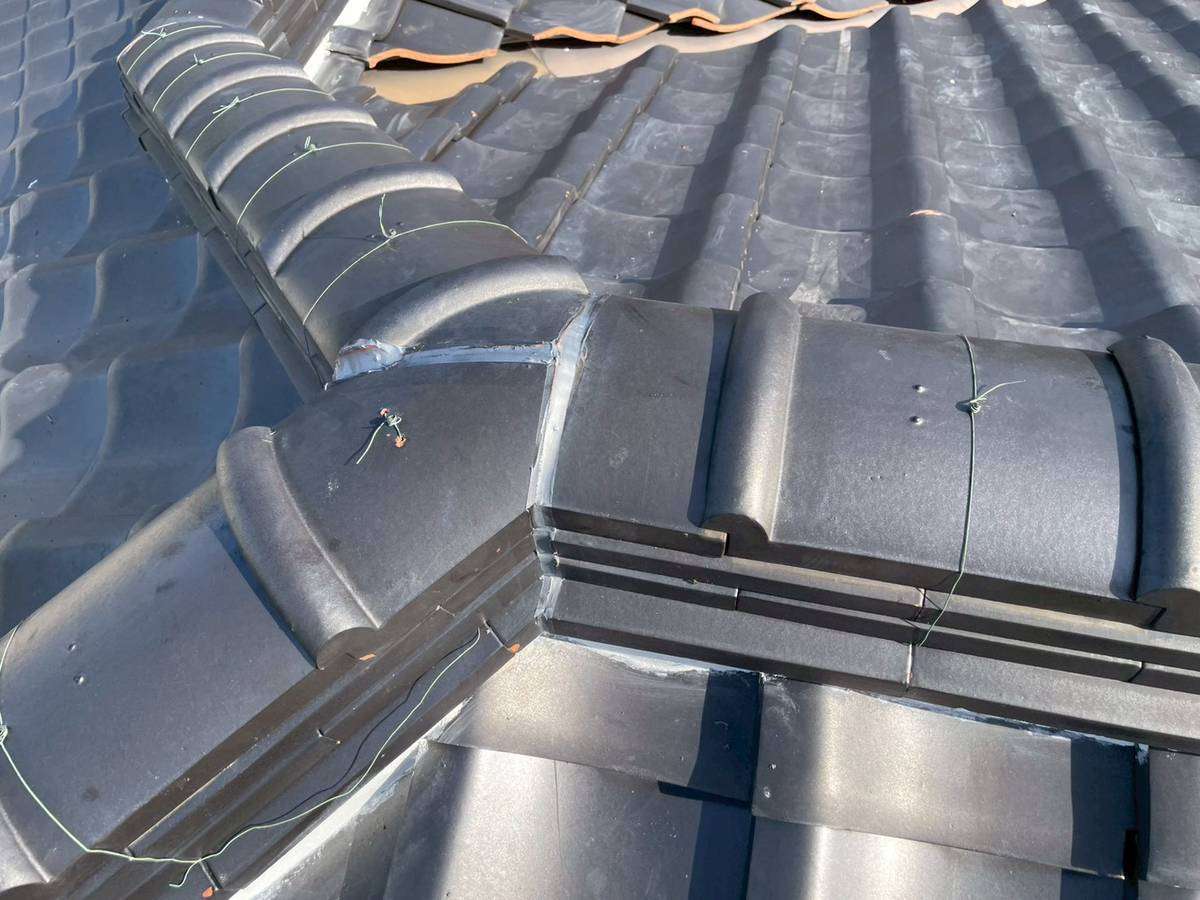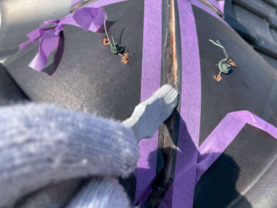 春日井市のN様邸の昨日の作業内容は、屋根漆喰鬼瓦部のラバーコーキングと、下屋根の養生、軒天部の補修と上塗り1回目塗装作業を行っています。