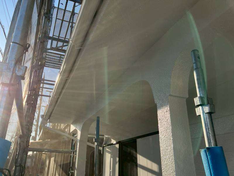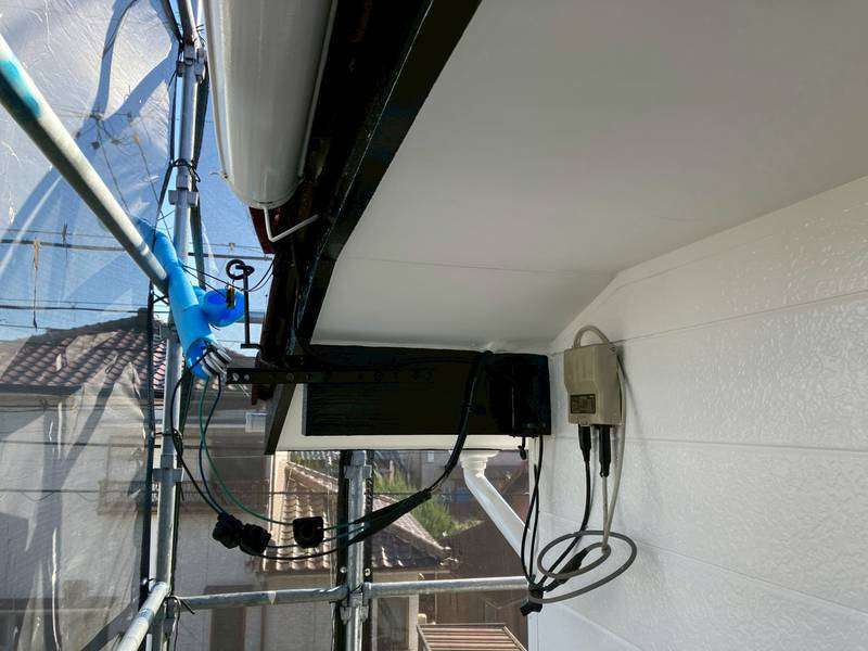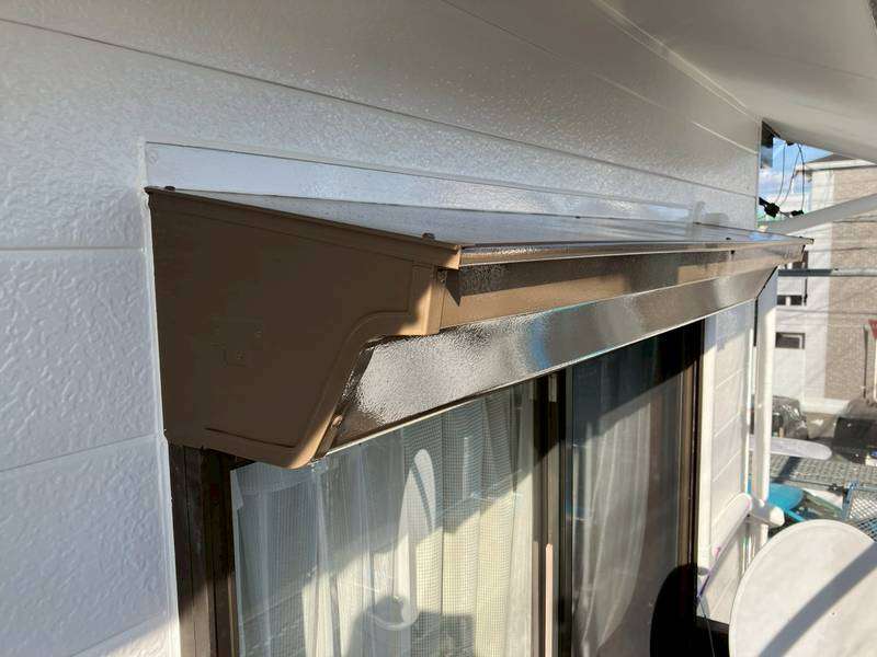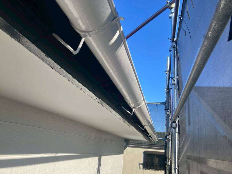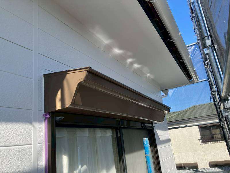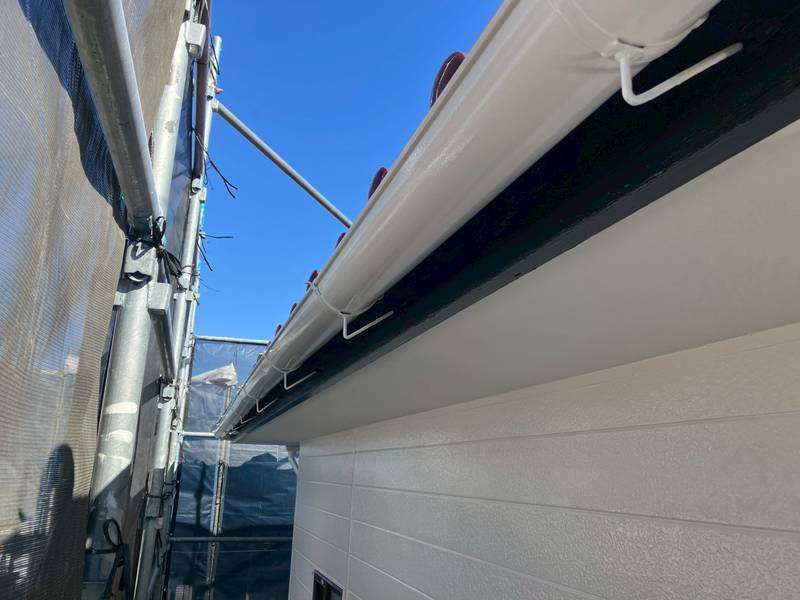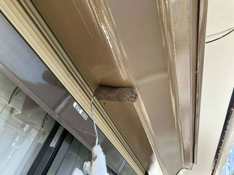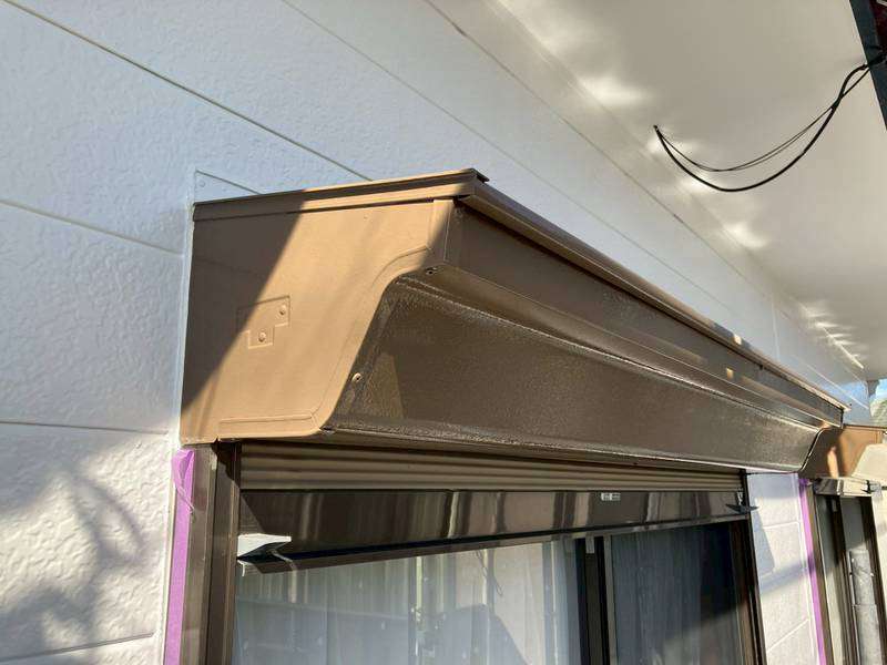 軒樋・庇シャッターボックスの上塗り2回目塗装作業、最終の塗装点検清掃作業を行っていました。