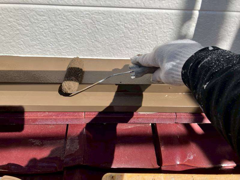 O様邸の昨日の作業内容は、付帯部塗装の壁取り合い水切りの上塗り1回目・2回目塗装と
