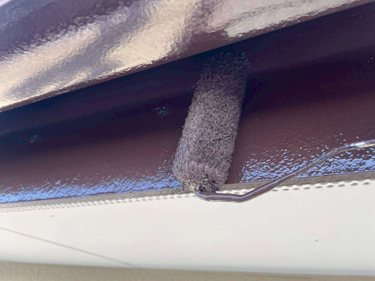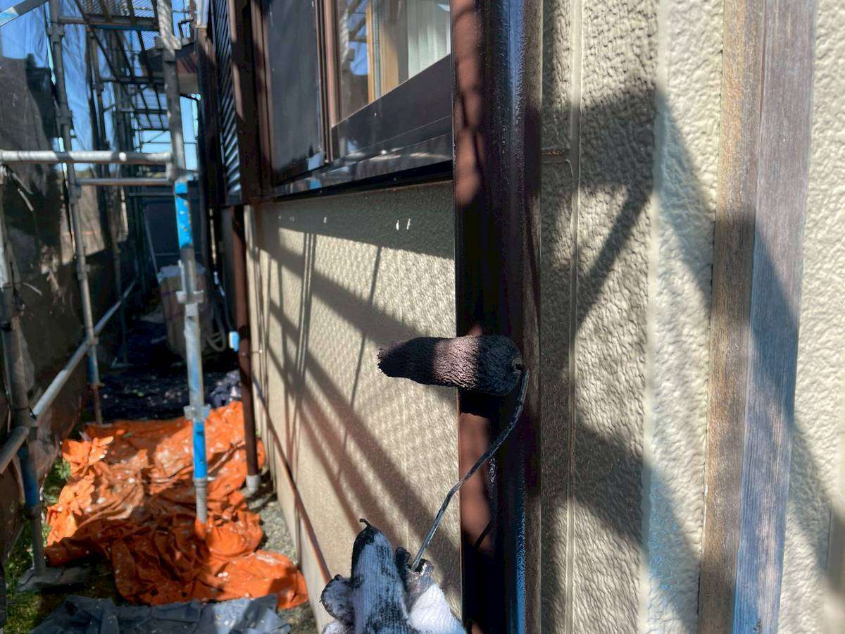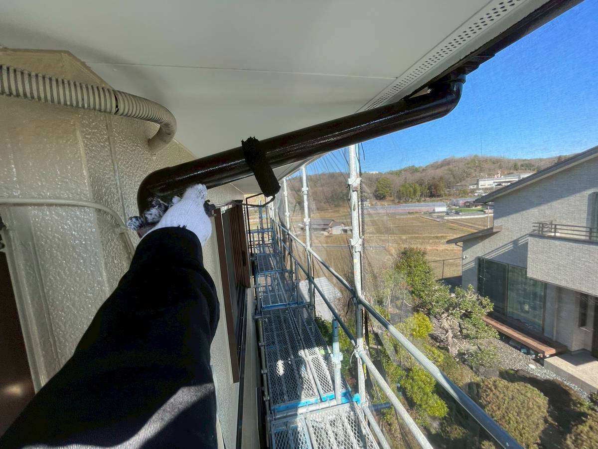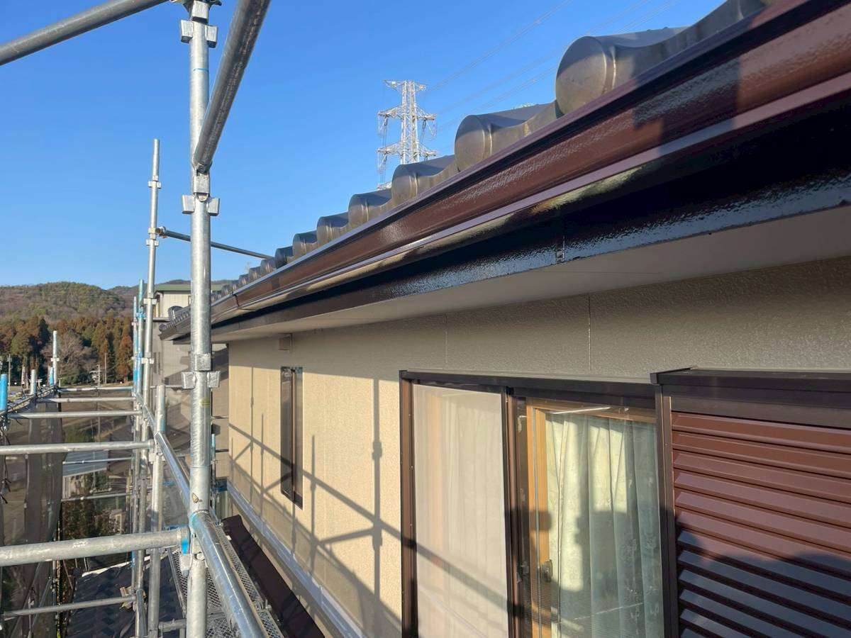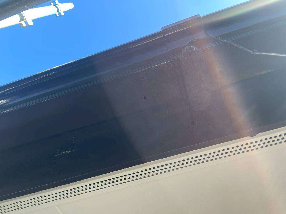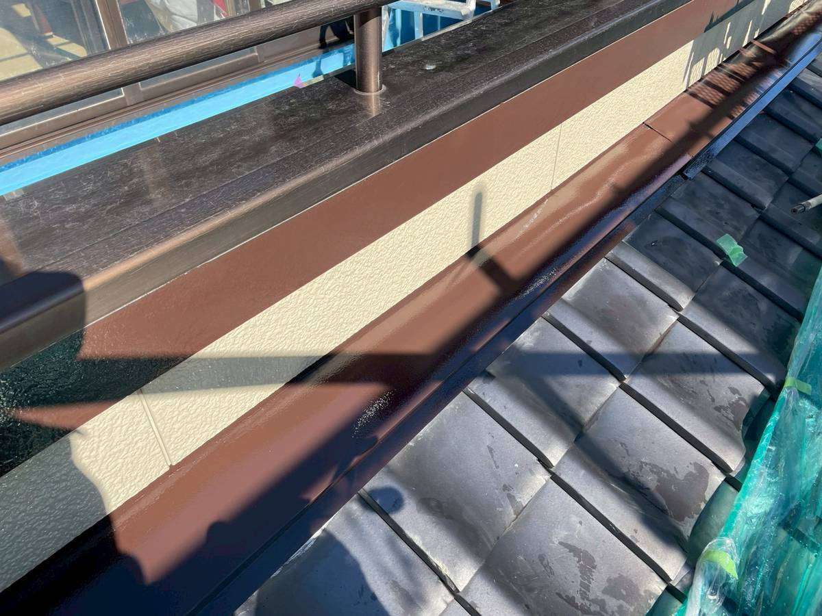 N様邸の昨日の作業内容は、付帯部塗装の破風板・鼻隠し板・雨樋(軒樋・縦樋)・帯板・壁取り合い水切りの上塗り2回目塗装作業とベランダ防水のトップコート塗装作業を行っていました。