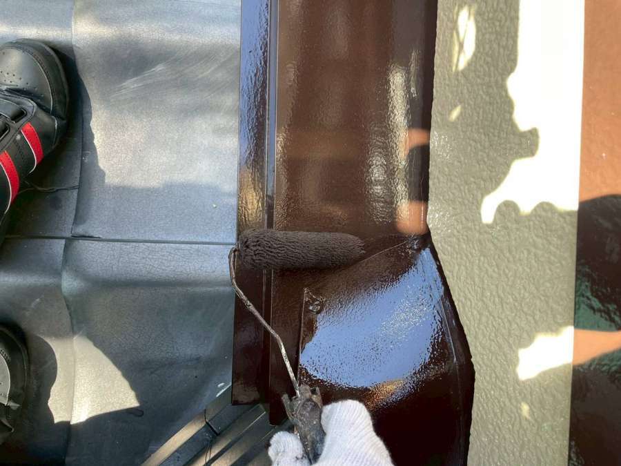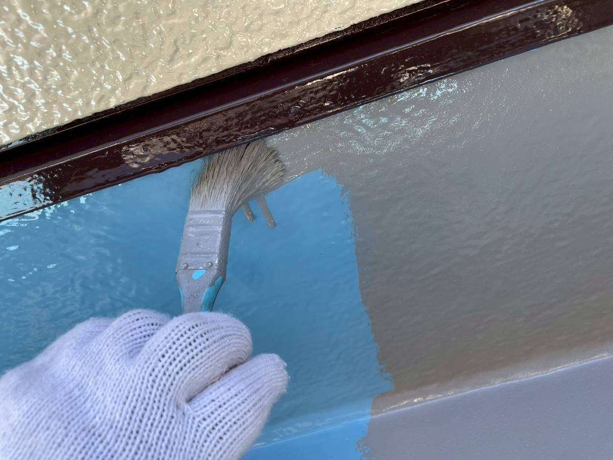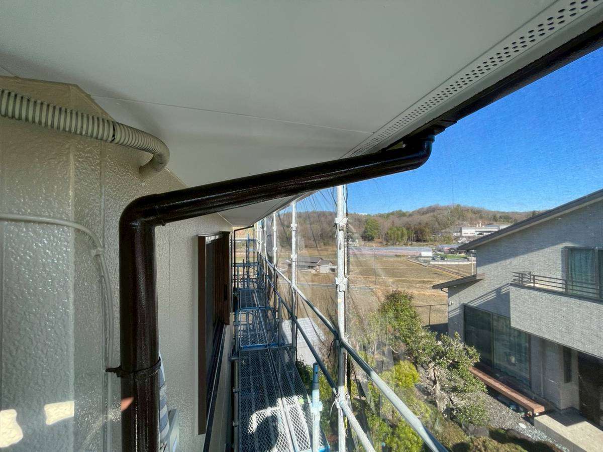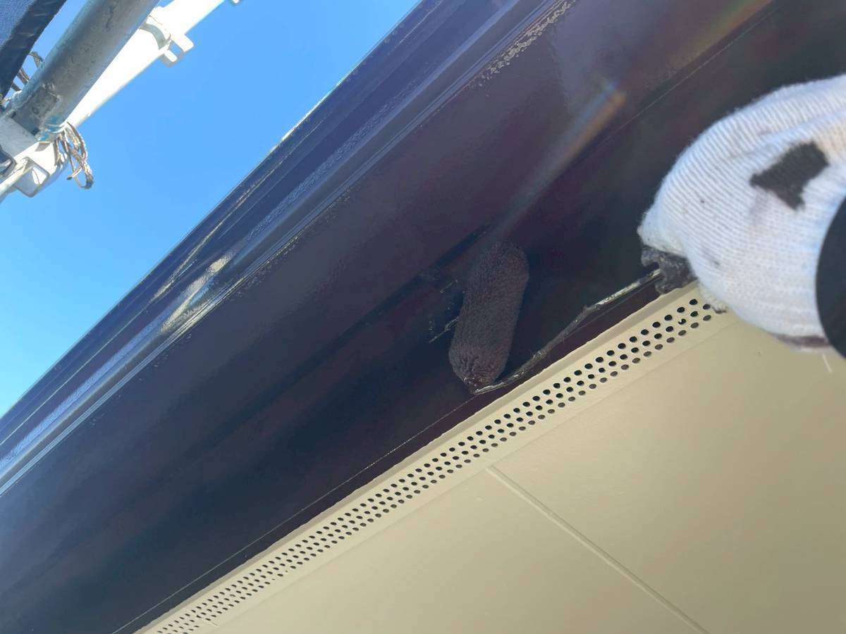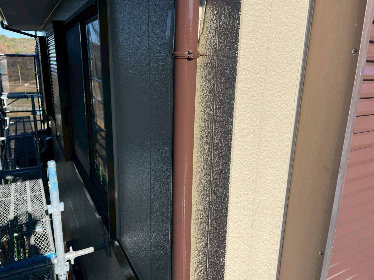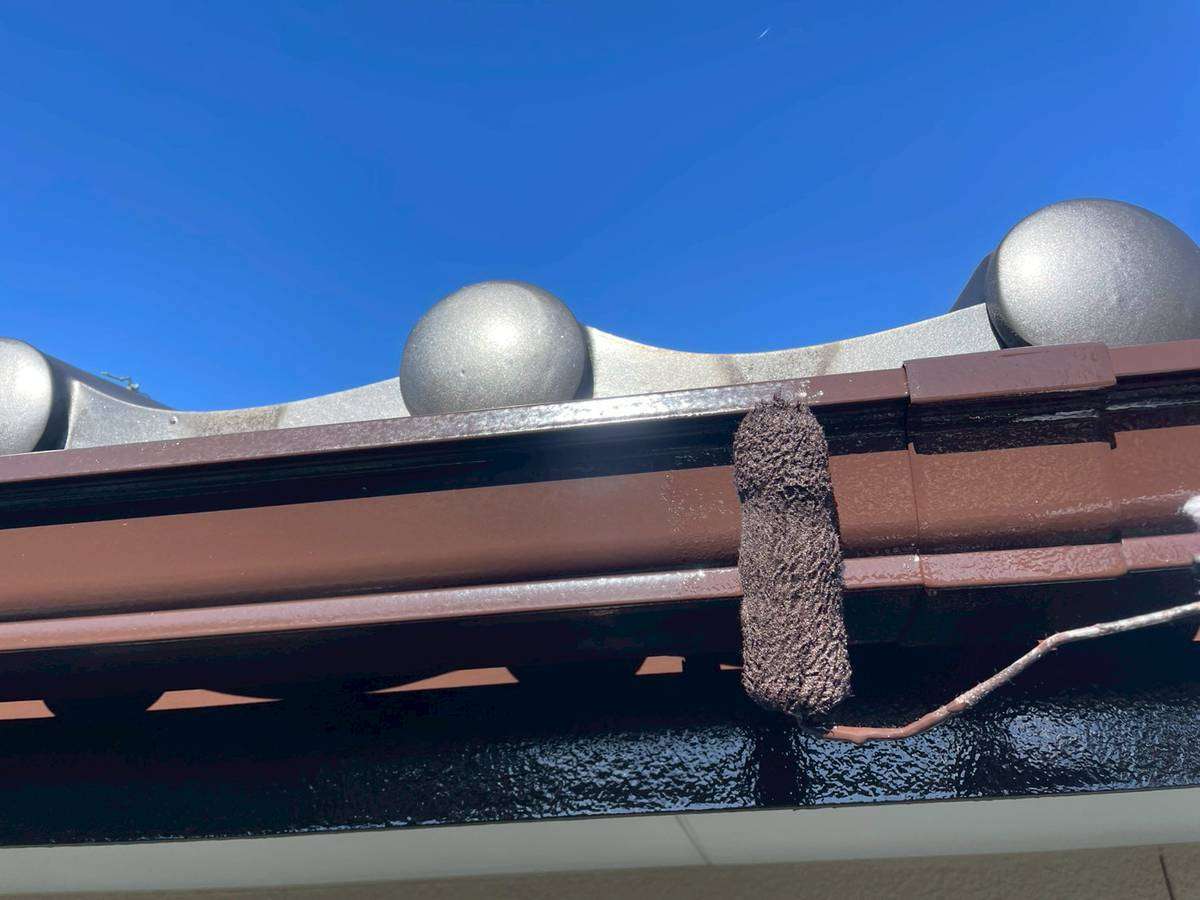 N様邸の昨日の作業内容は、付帯部塗装の破風板・鼻隠し板・雨樋(軒樋・縦樋)・帯板・壁取り合い水切りの上塗り2回目塗装作業とベランダ防水のトップコート塗装作業を行っていました。