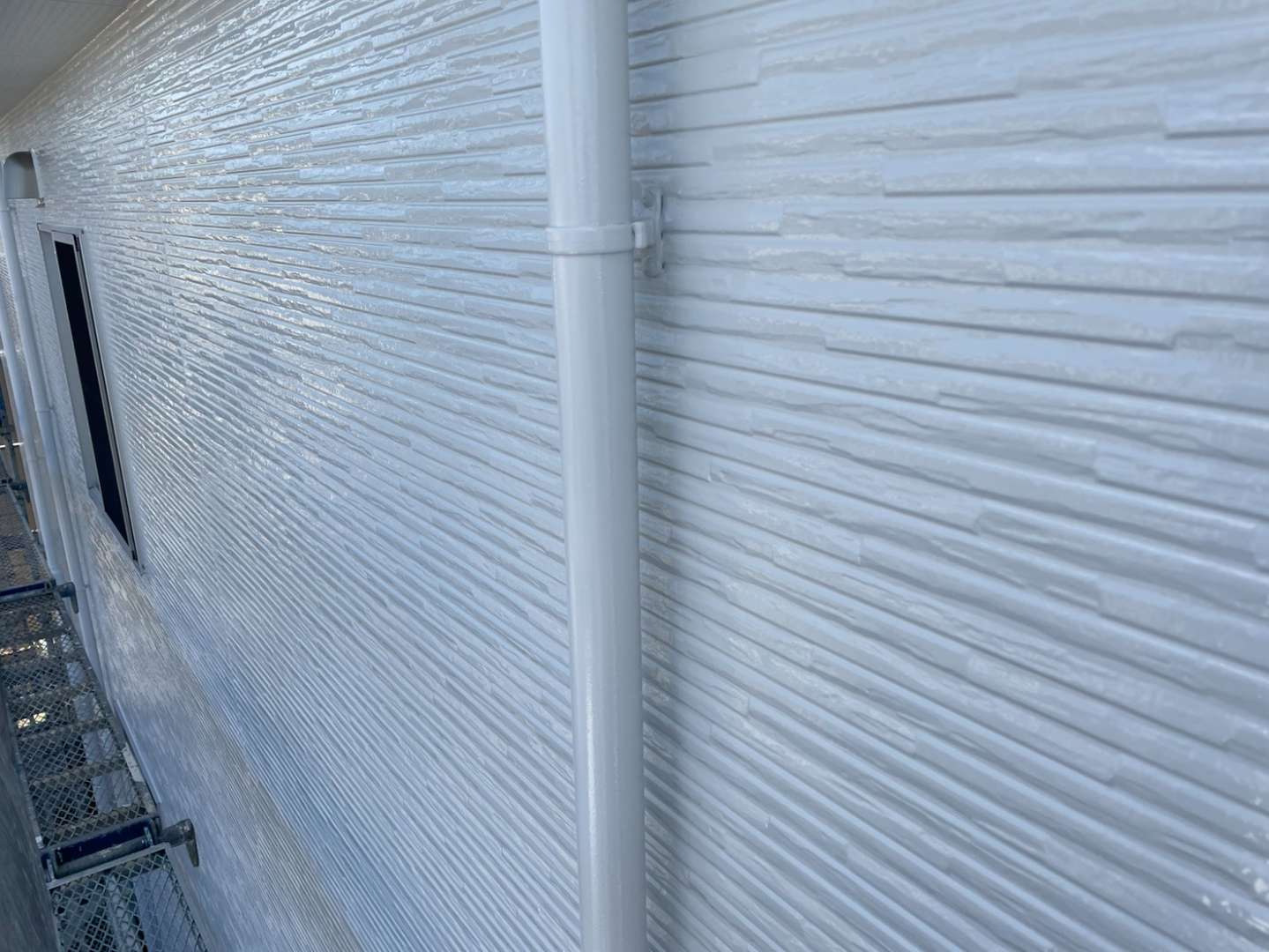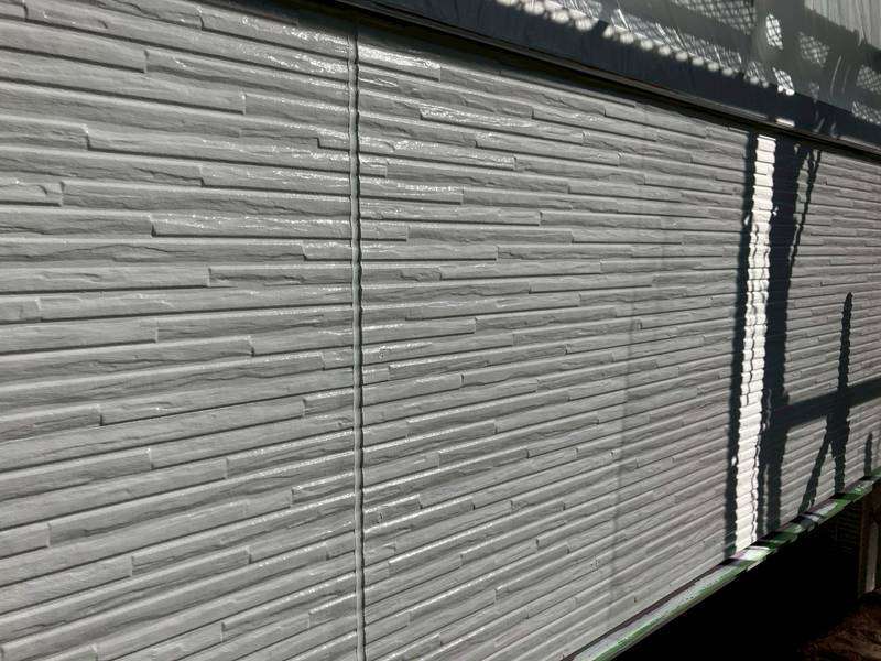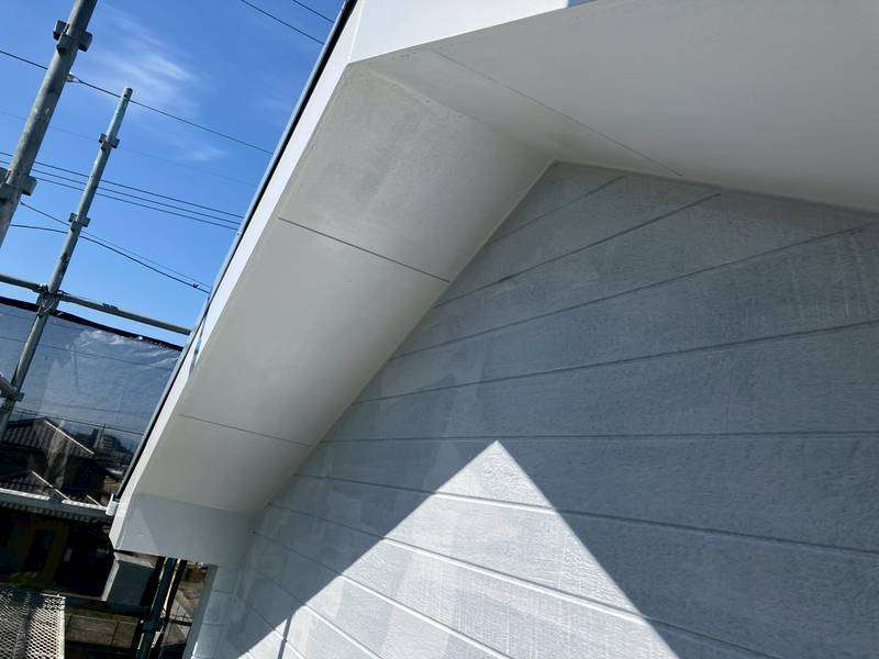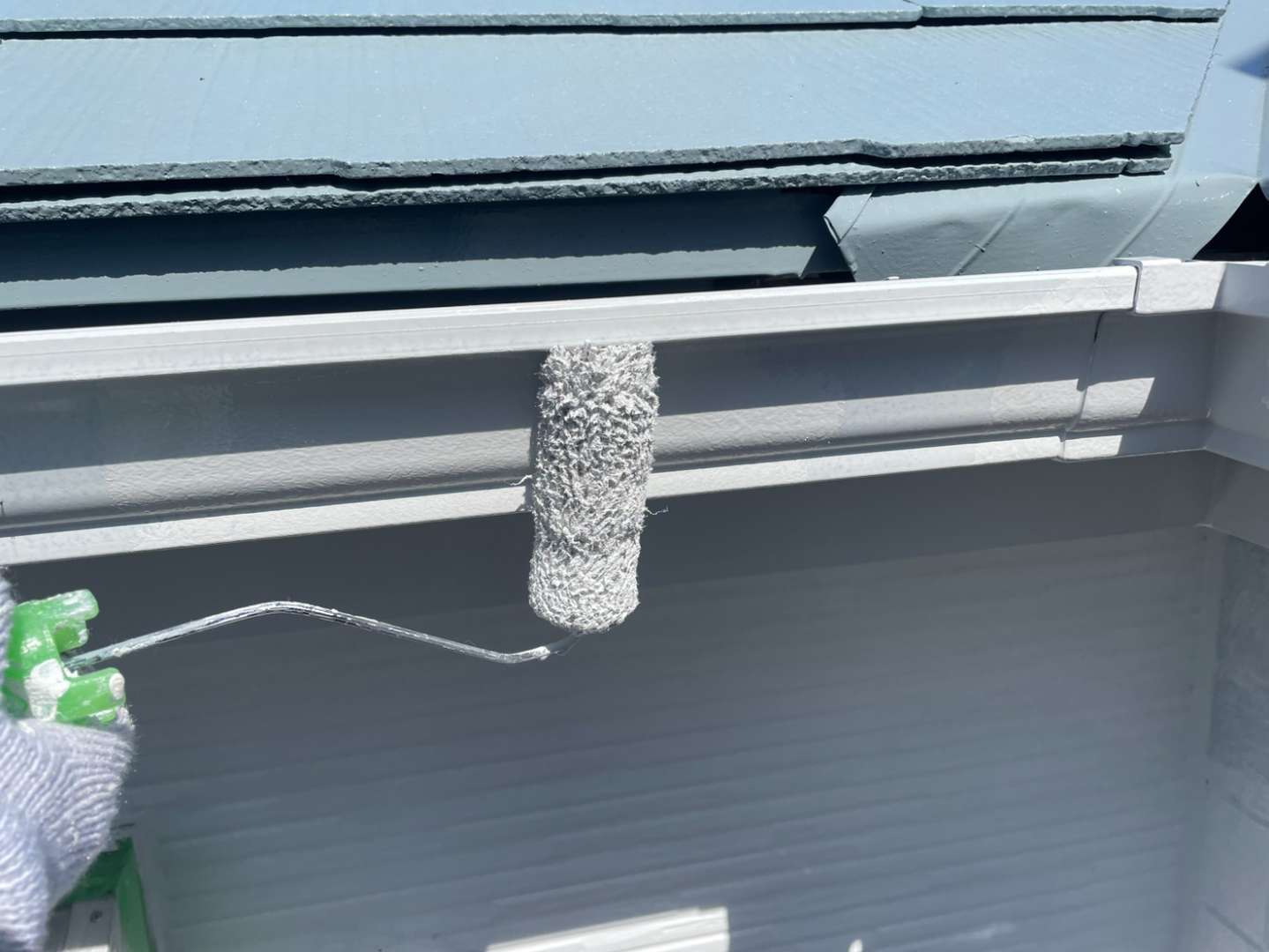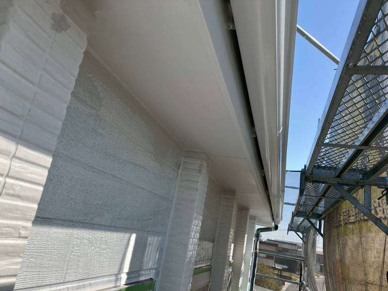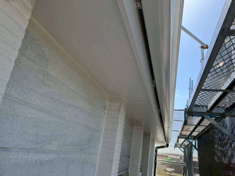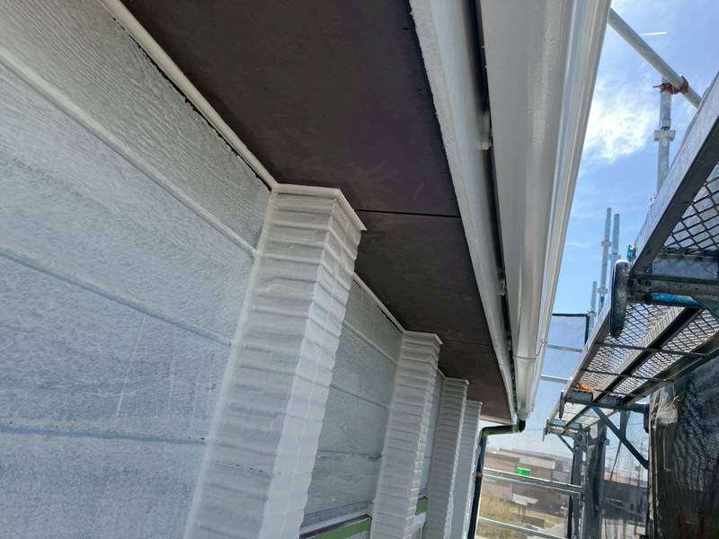 一宮市のS様邸の昨日の作業内容は、南西面の外壁の下塗り塗装、軒天部の1回目・2回目塗装、破風板・鼻隠し板・軒樋の上塗り2回目塗装、その他付帯(シャッターボックス・縦樋・小庇・水切り)部分の上塗り1回目・2回目塗装作業を行っています。