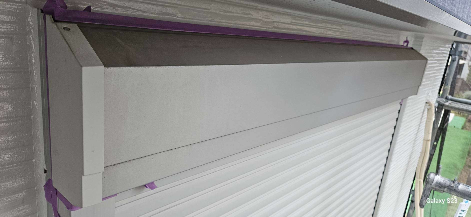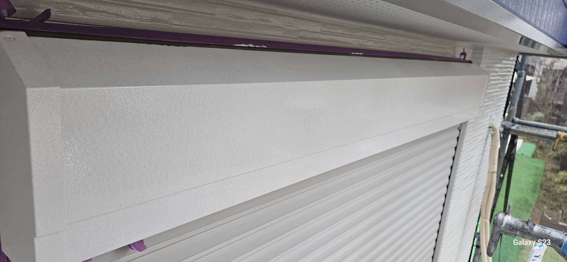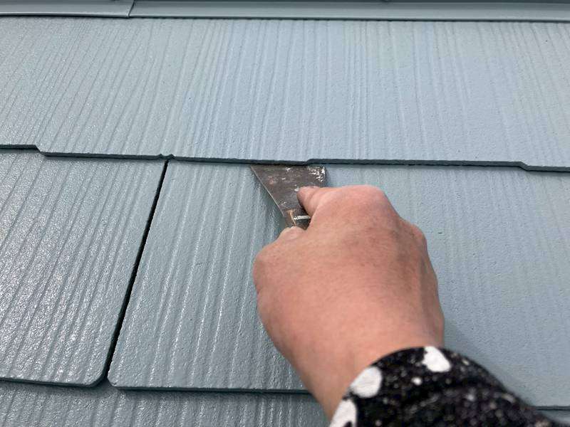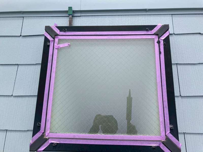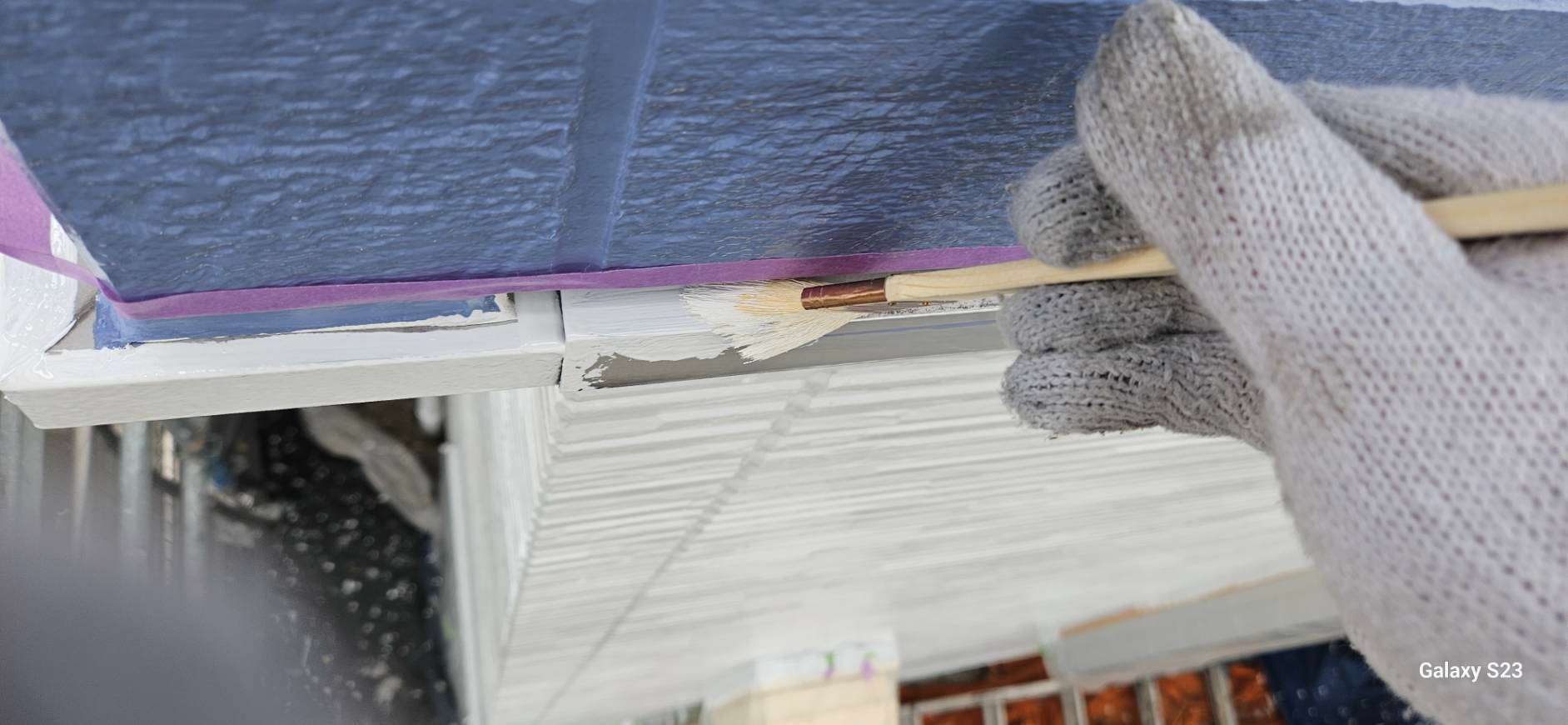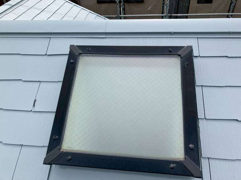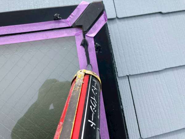 S様邸の昨日の作業内容は、南西面の屋根の縁切り作業、天窓のビス交換・コーキング作業、付帯部塗装のシャッターボックス・水切り・ガスメーターの下塗り塗装作業を行いました。