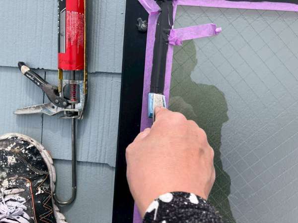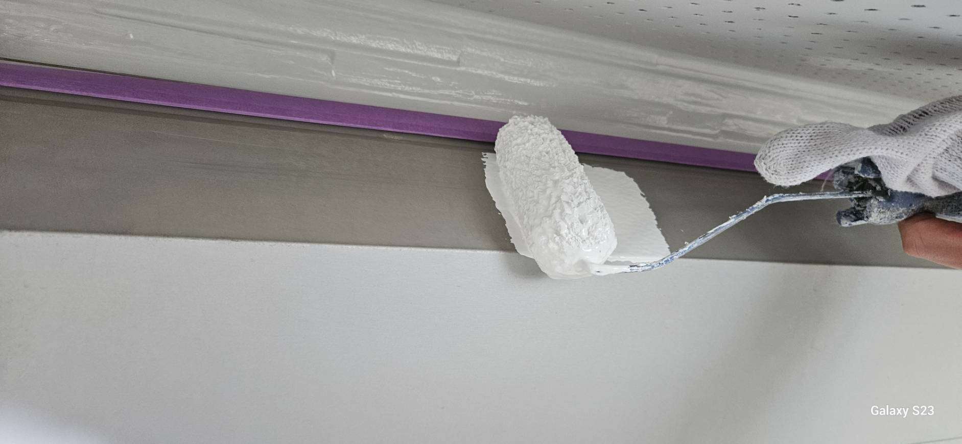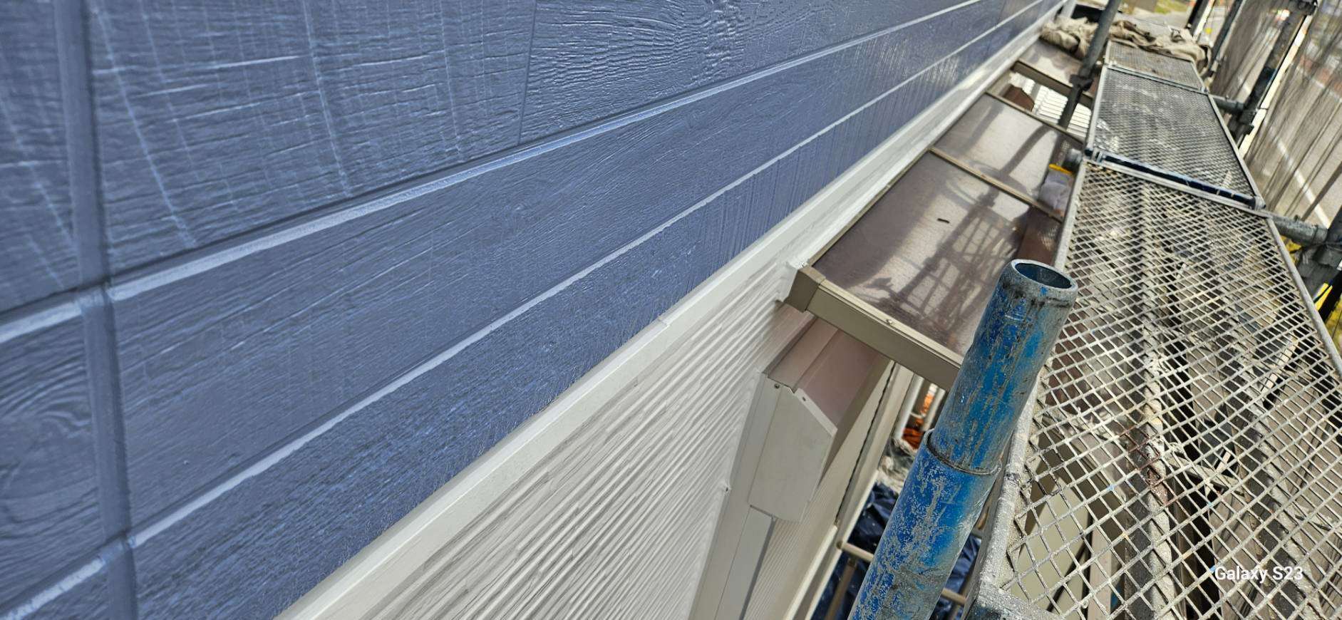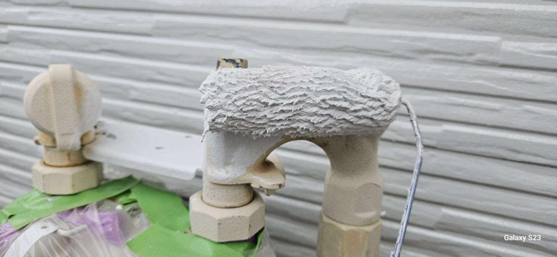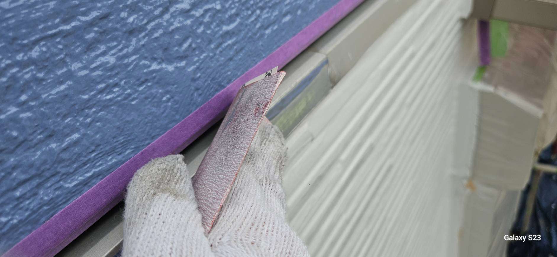 S様邸の昨日の作業内容は、南西面の屋根の縁切り作業、天窓のビス交換・コーキング作業、付帯部塗装のシャッターボックス・水切り・ガスメーターの下塗り塗装作業を行いました。