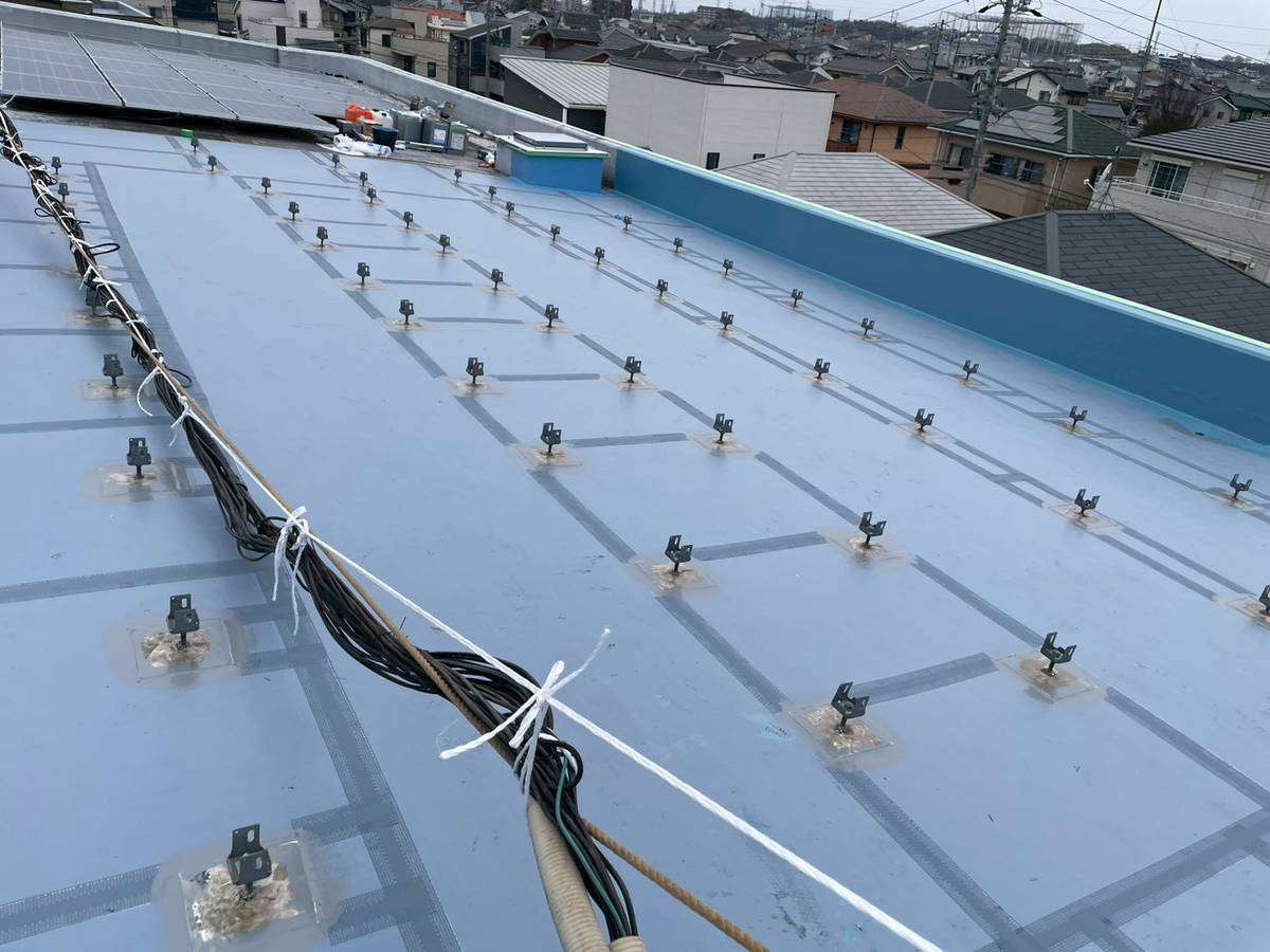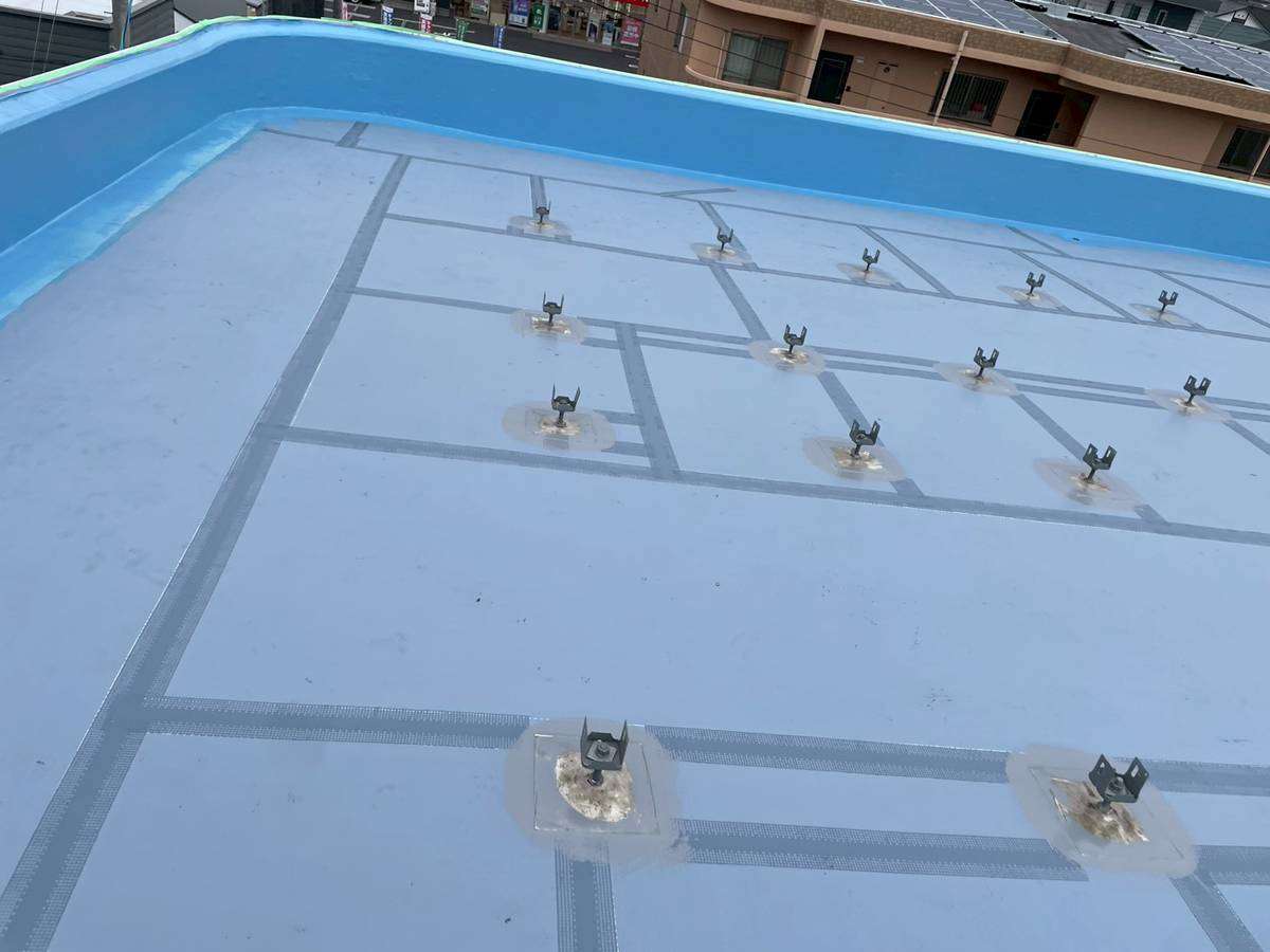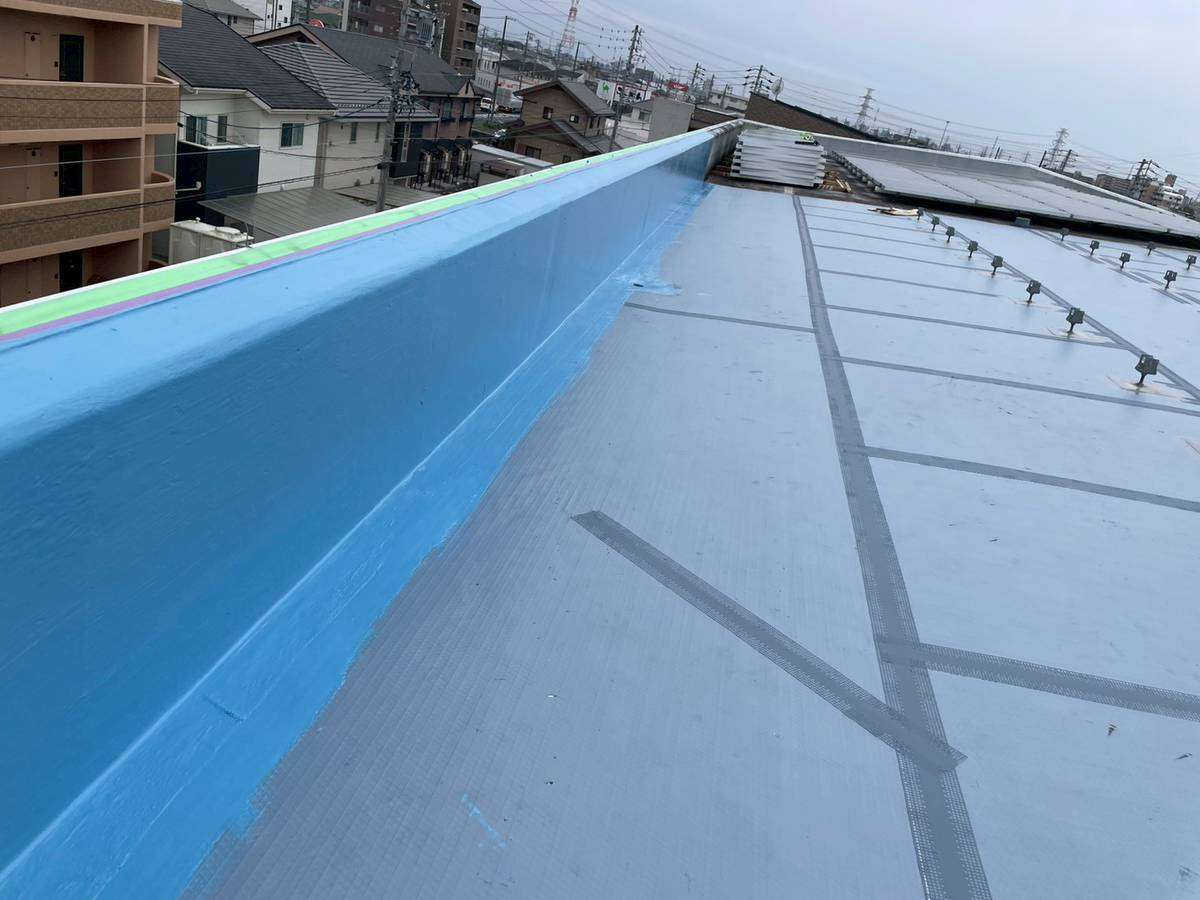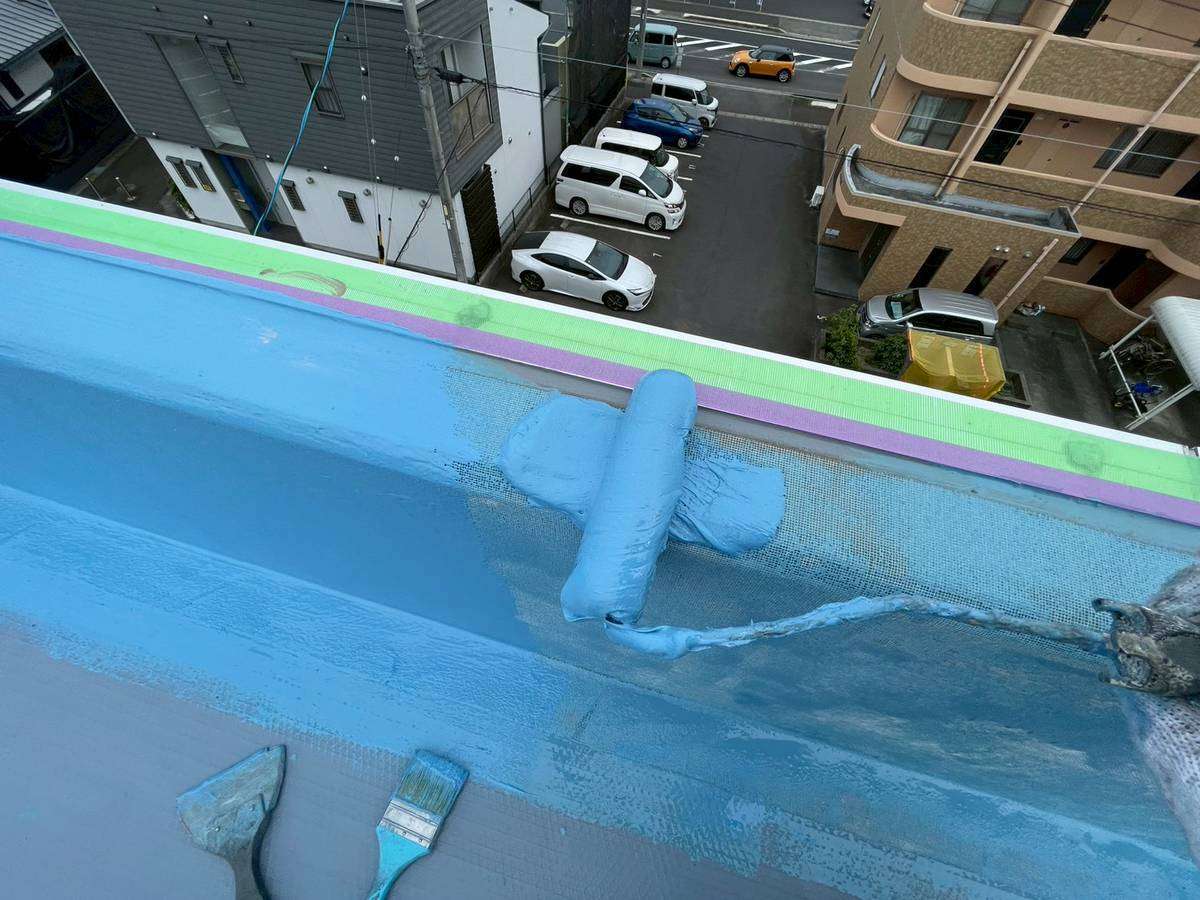 Pマンション様の昨日の作業は、立上り部のメッシュシート貼付け作業後の立上り用ウレタン1層目塗装作業と平場部のシート貼付け・ジョイント部テープ貼付け作業を行いました。