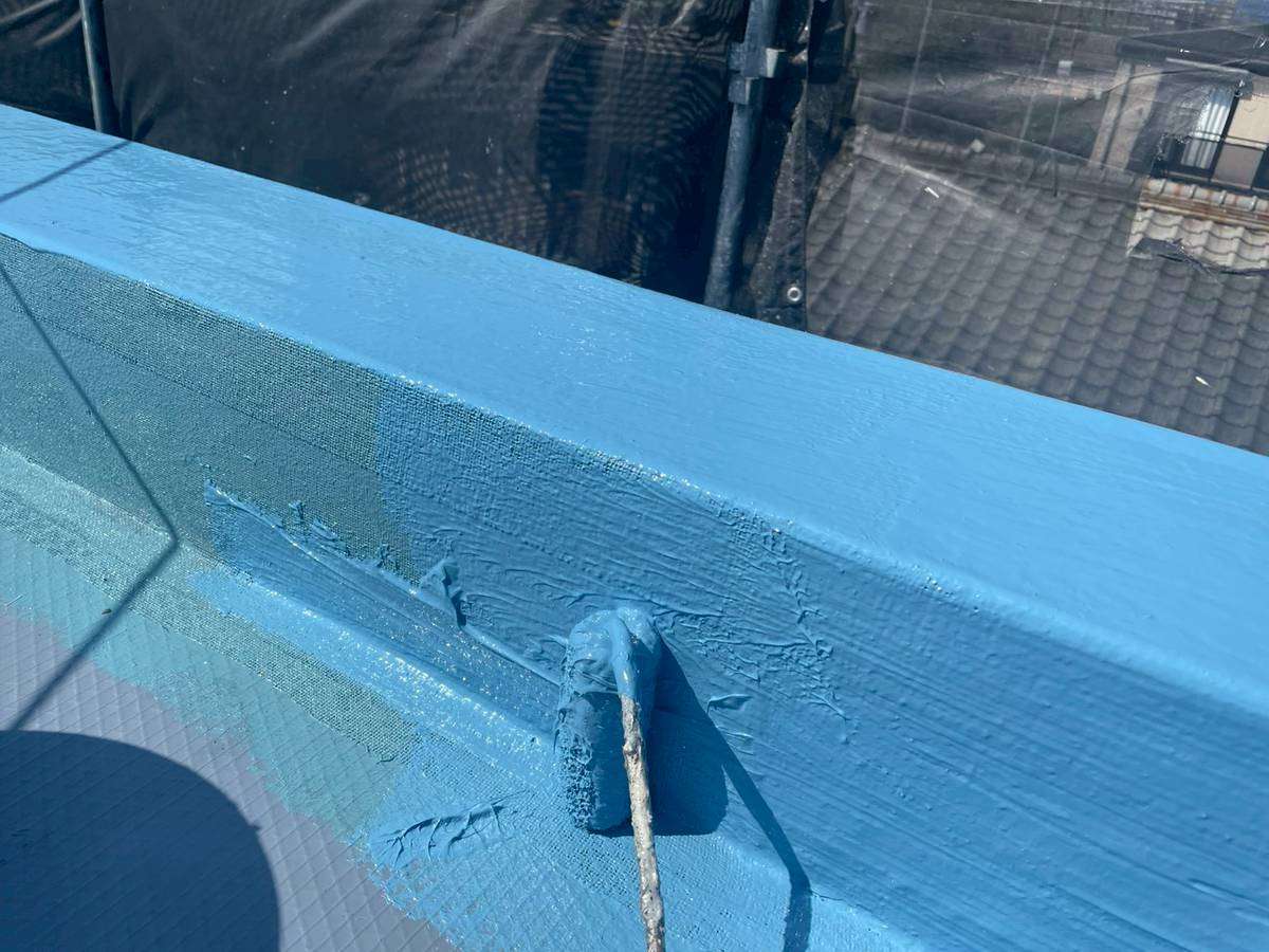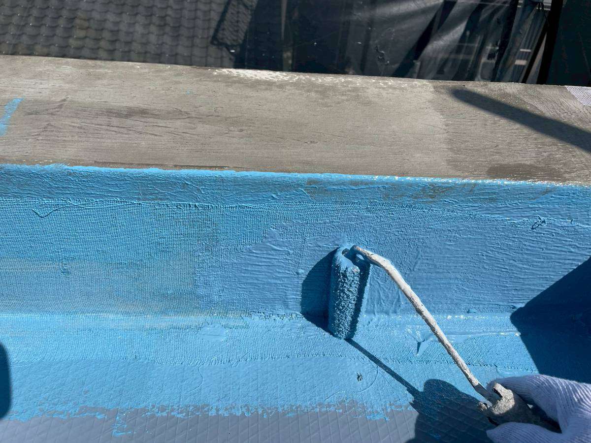 屋上通気緩衝工法防水工事の立上り部メッシュ仕様・平場部のウレタン樹脂1層目塗装作業を行いました。
