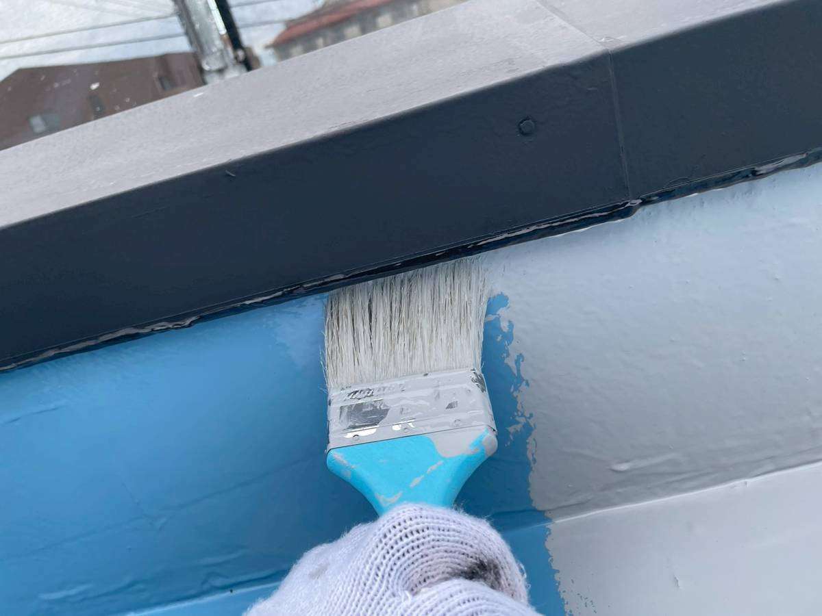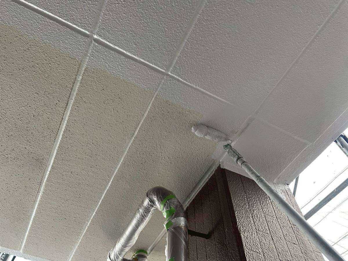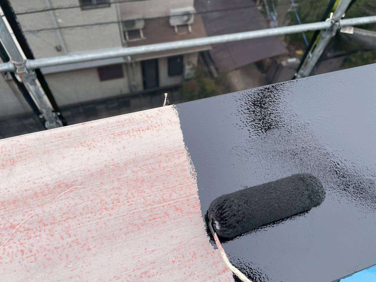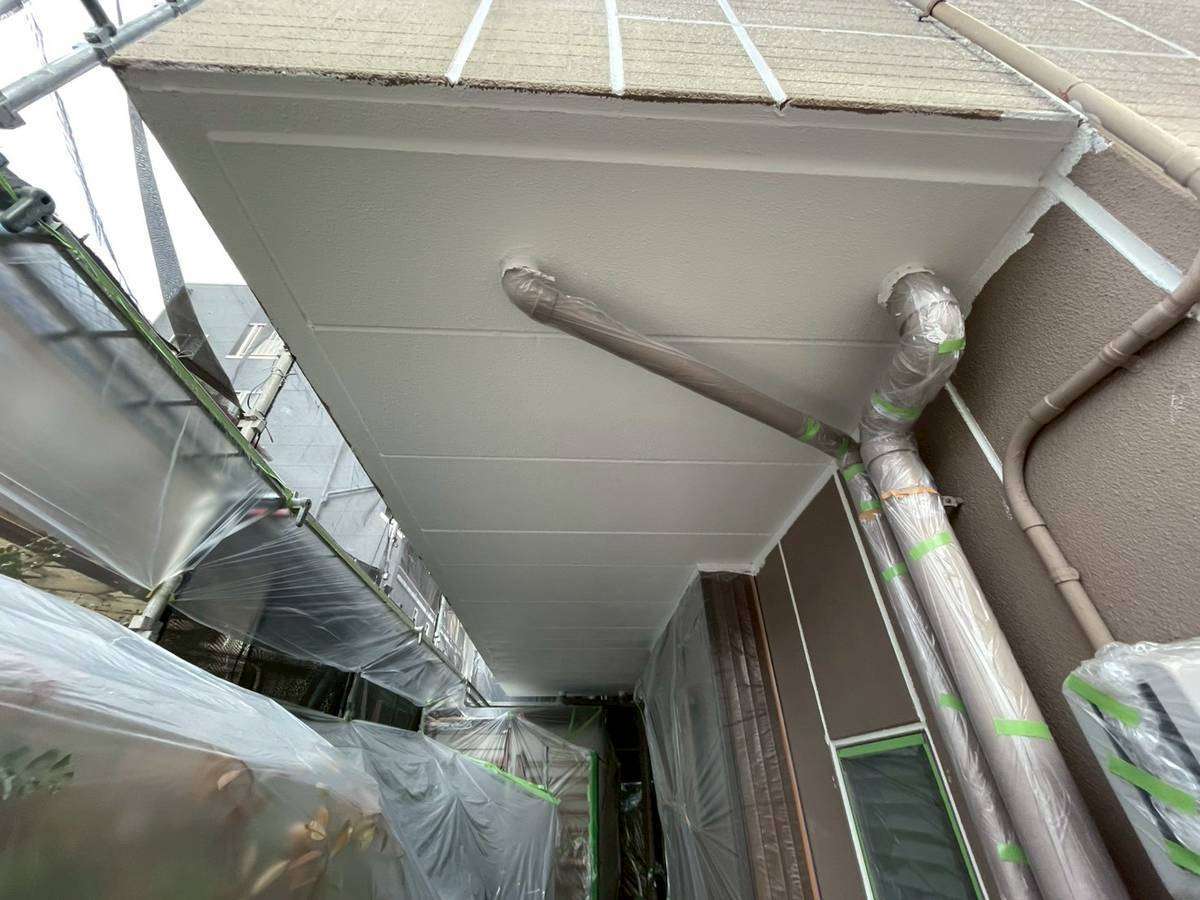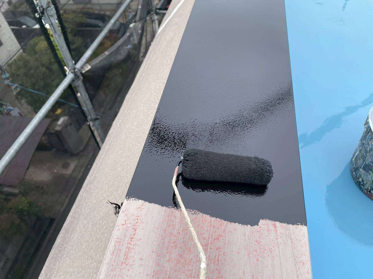 K様邸の作業は、屋上の笠木部のケレン・錆止め塗装と養生、軒天の1回目塗装、屋上通気緩衝工法防水のトップコート塗装作業を行っていました。